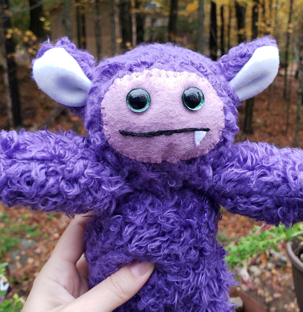 This purple cozy monster has one fang and glittering green eyes. It has affectionally been renamed "the meh monster" but it cares, you can tell!