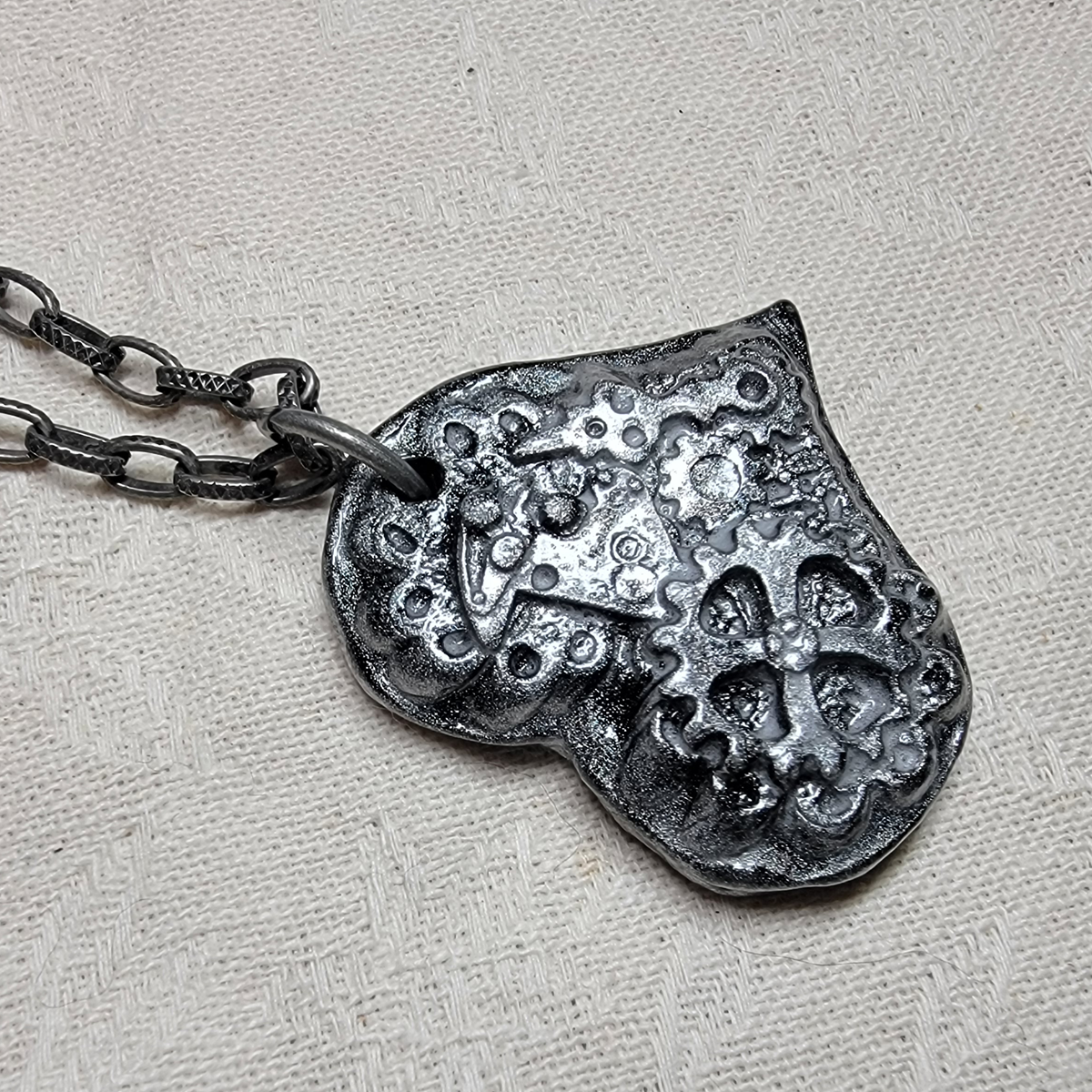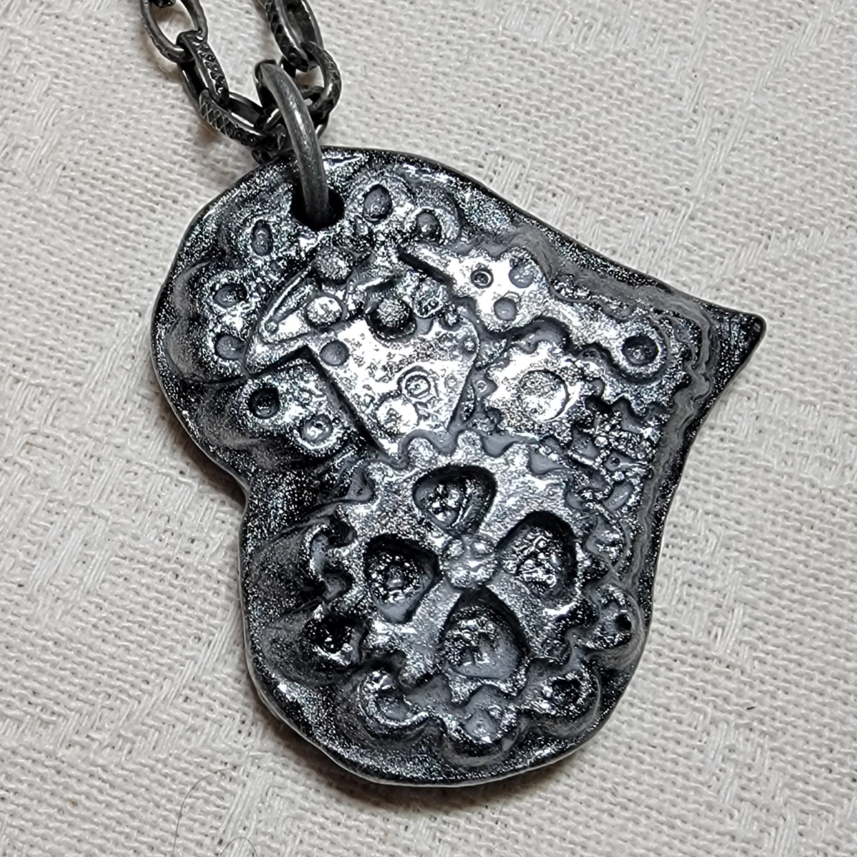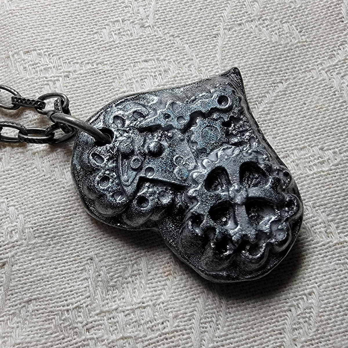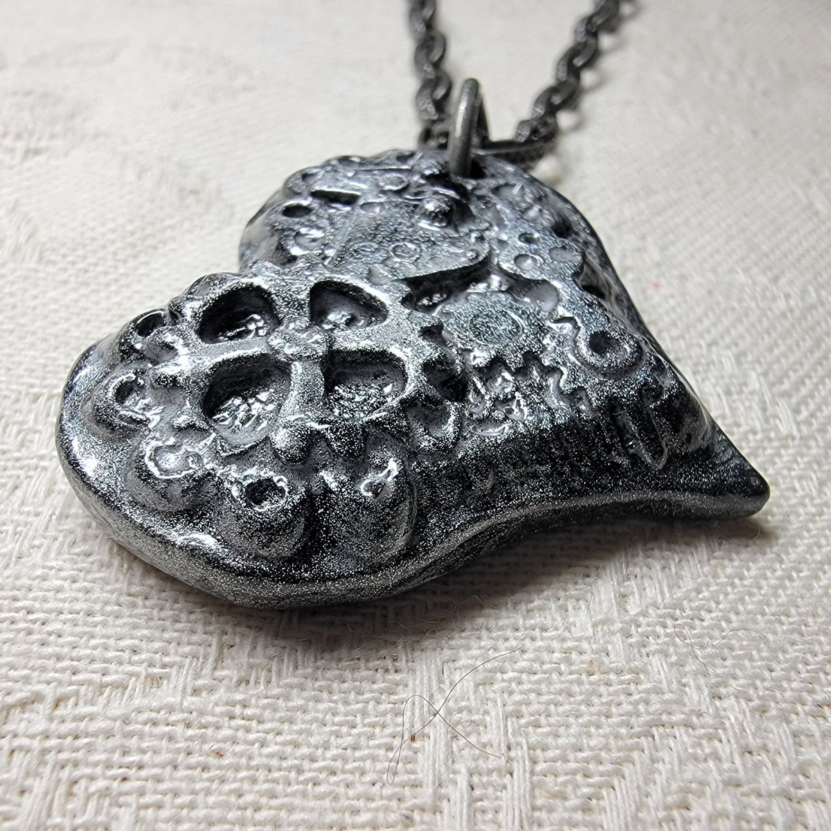 Steampunk hearts are created from a mold of my design. Pendant measures about 1 and 3/8th inches across at its widest point. Comes on a matching chain.