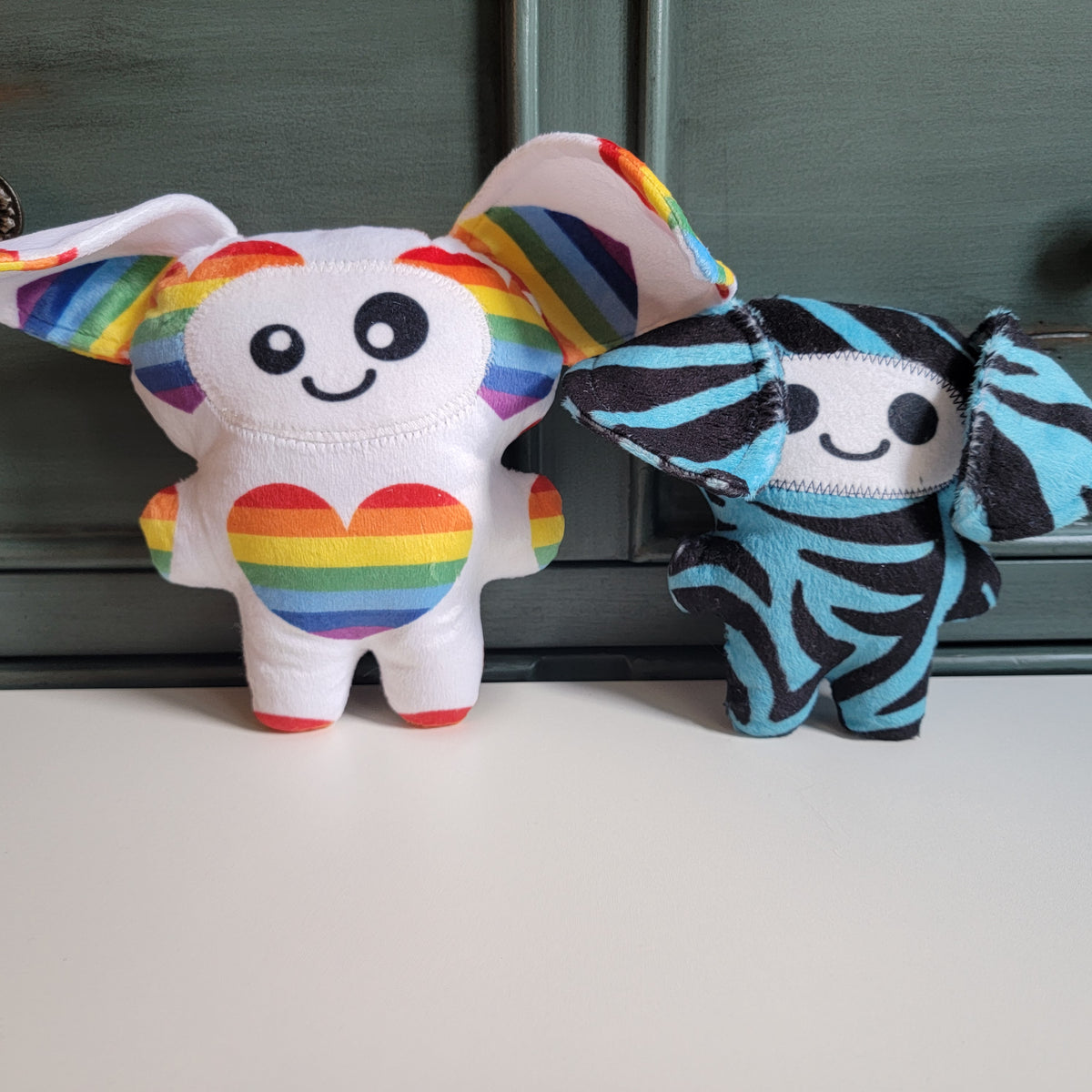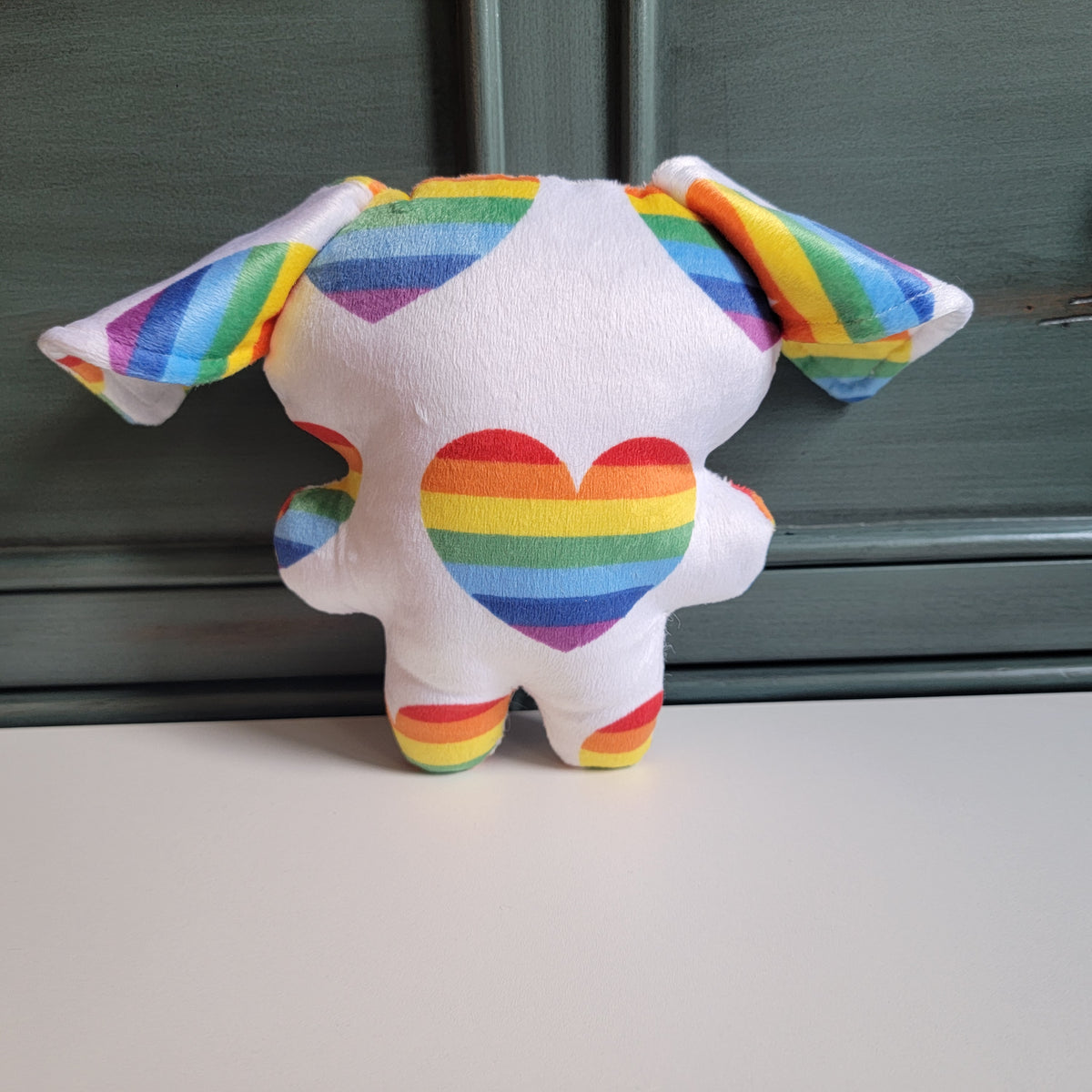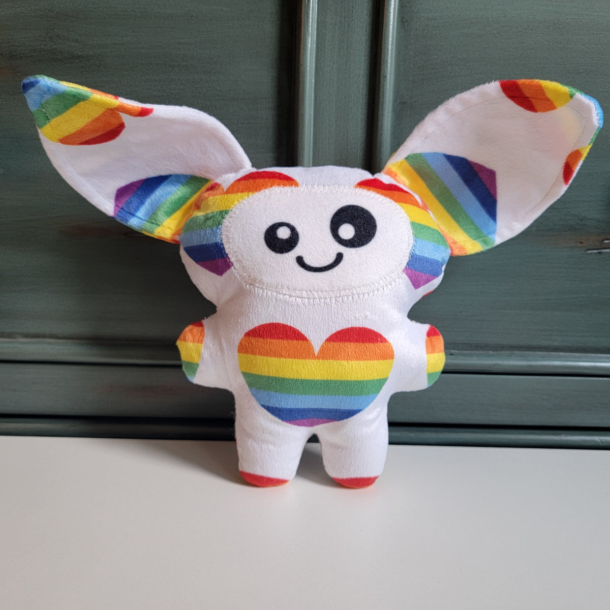 This little gremlet is a Pride month special, made with rainbow heart fabric!