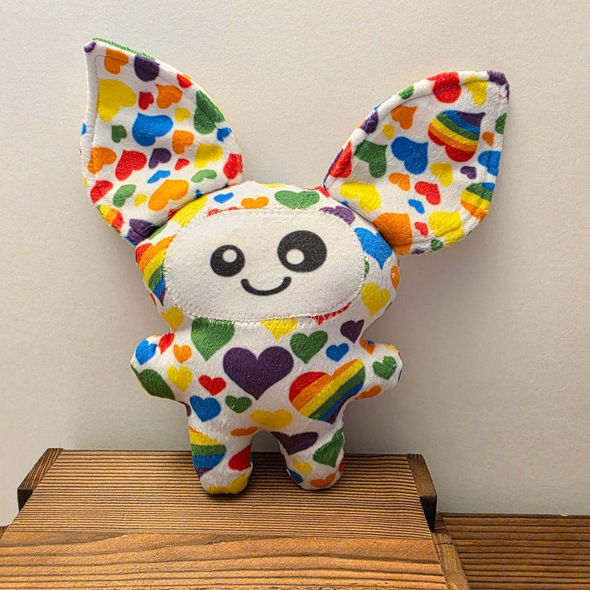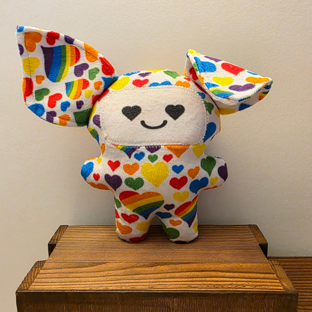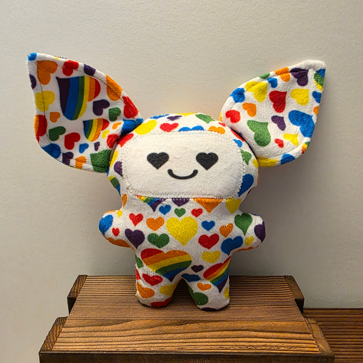 The same cuteness of the original gremlins, packed into a smaller package. All gremlets are made with minky fabric with fleece faces. These are a bit larger than the rest of the gremlets (more room for rainbows!), with a height around 6.5 inches tall with earspans of about ten inches.