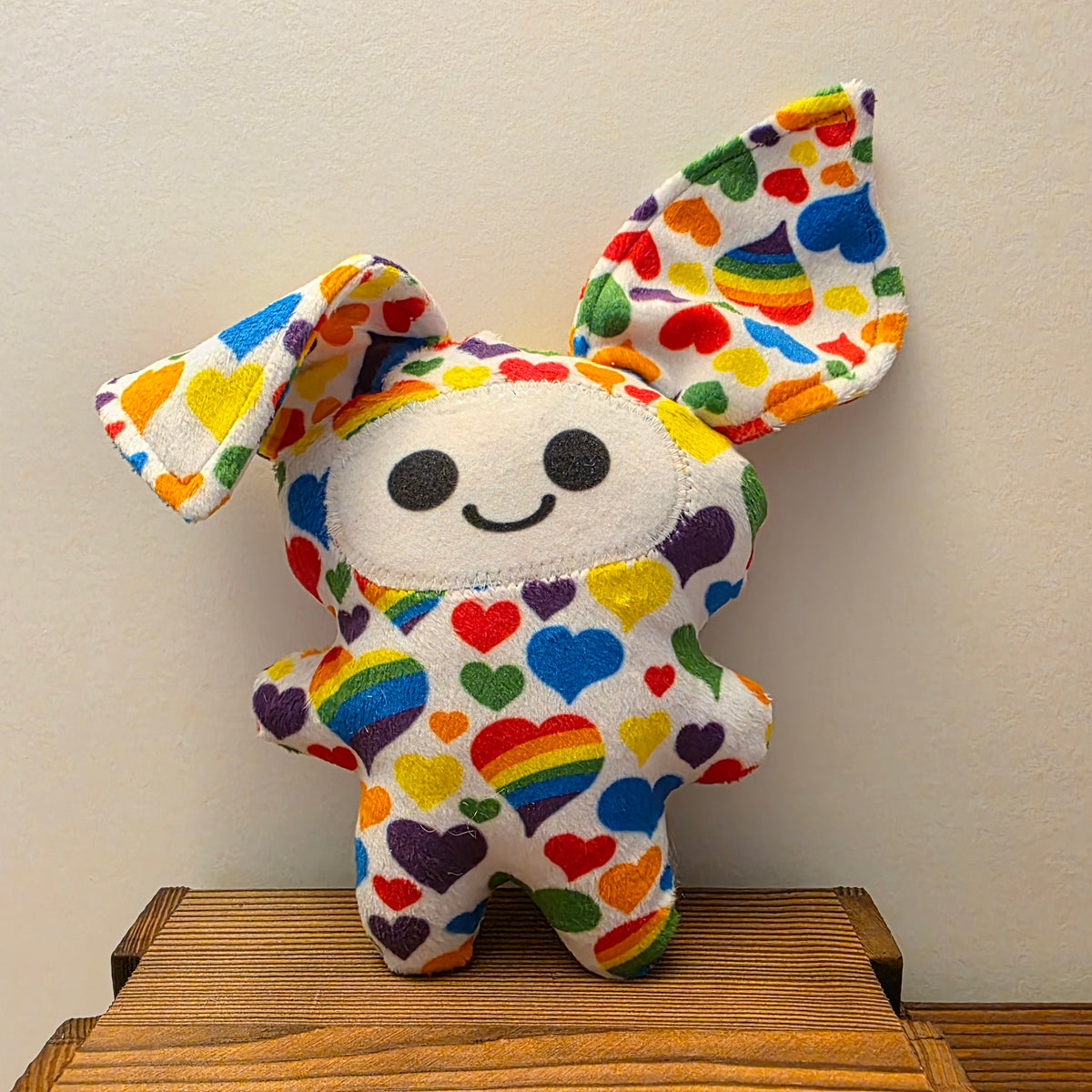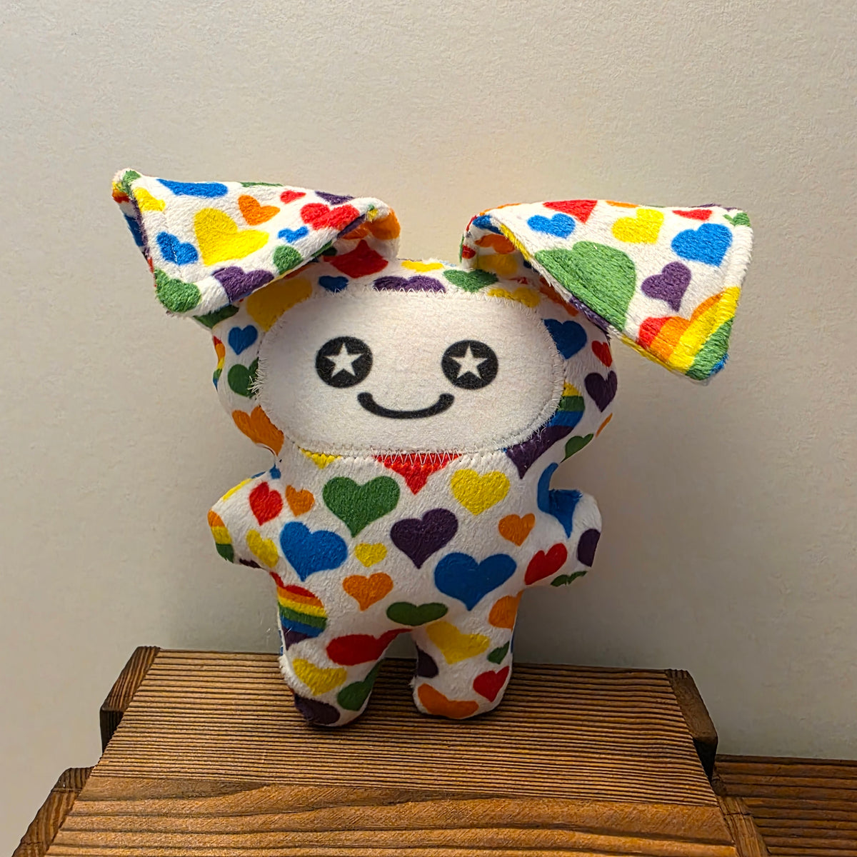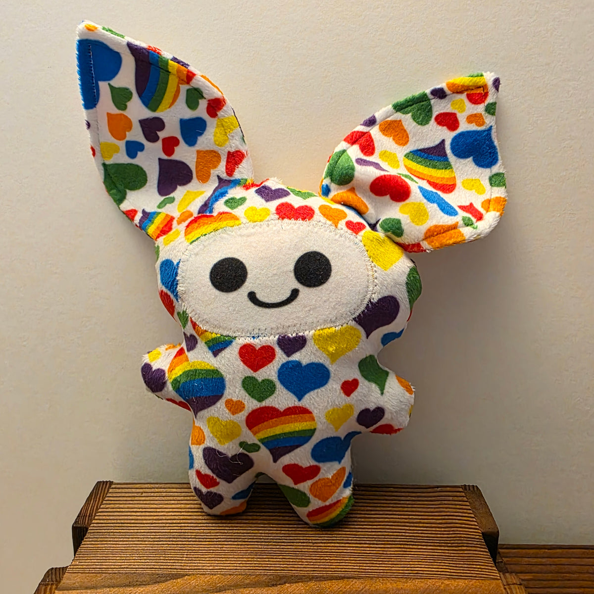 Little gremlets with colorful hearts on white fabric, as well as rainbow hearts!
