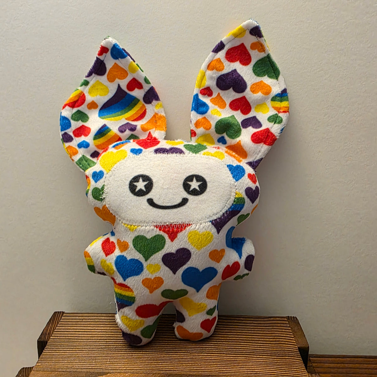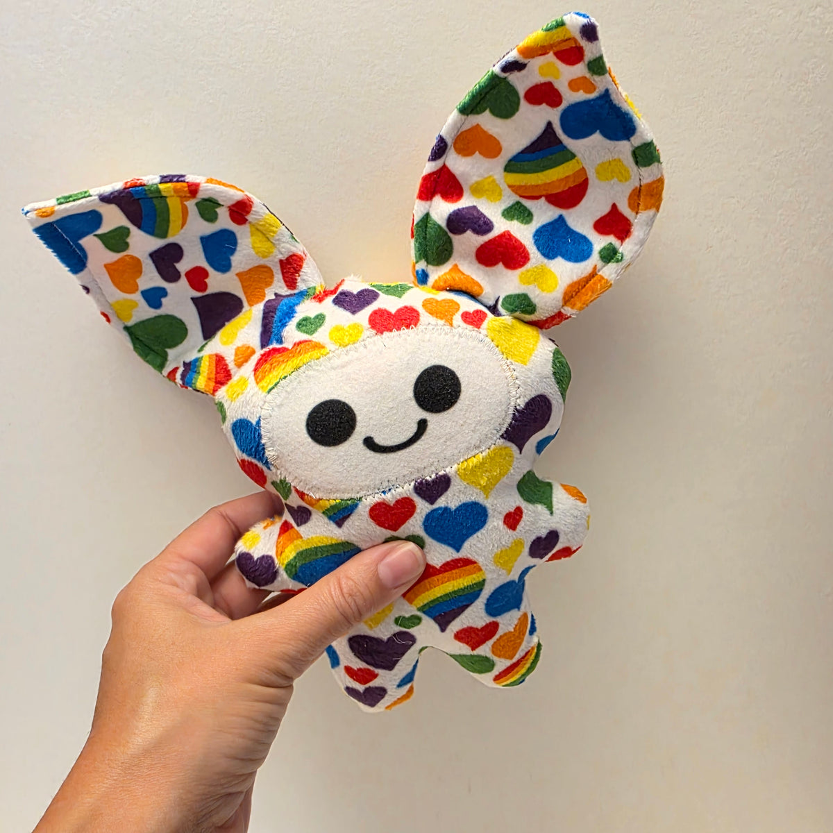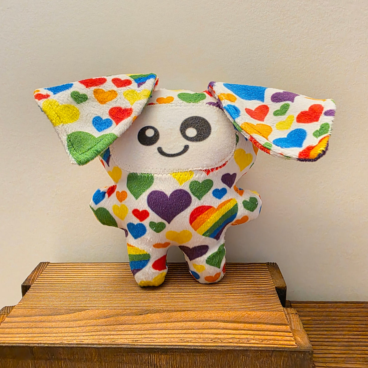 Little gremlets with colorful hearts on white fabric, as well as rainbow hearts!