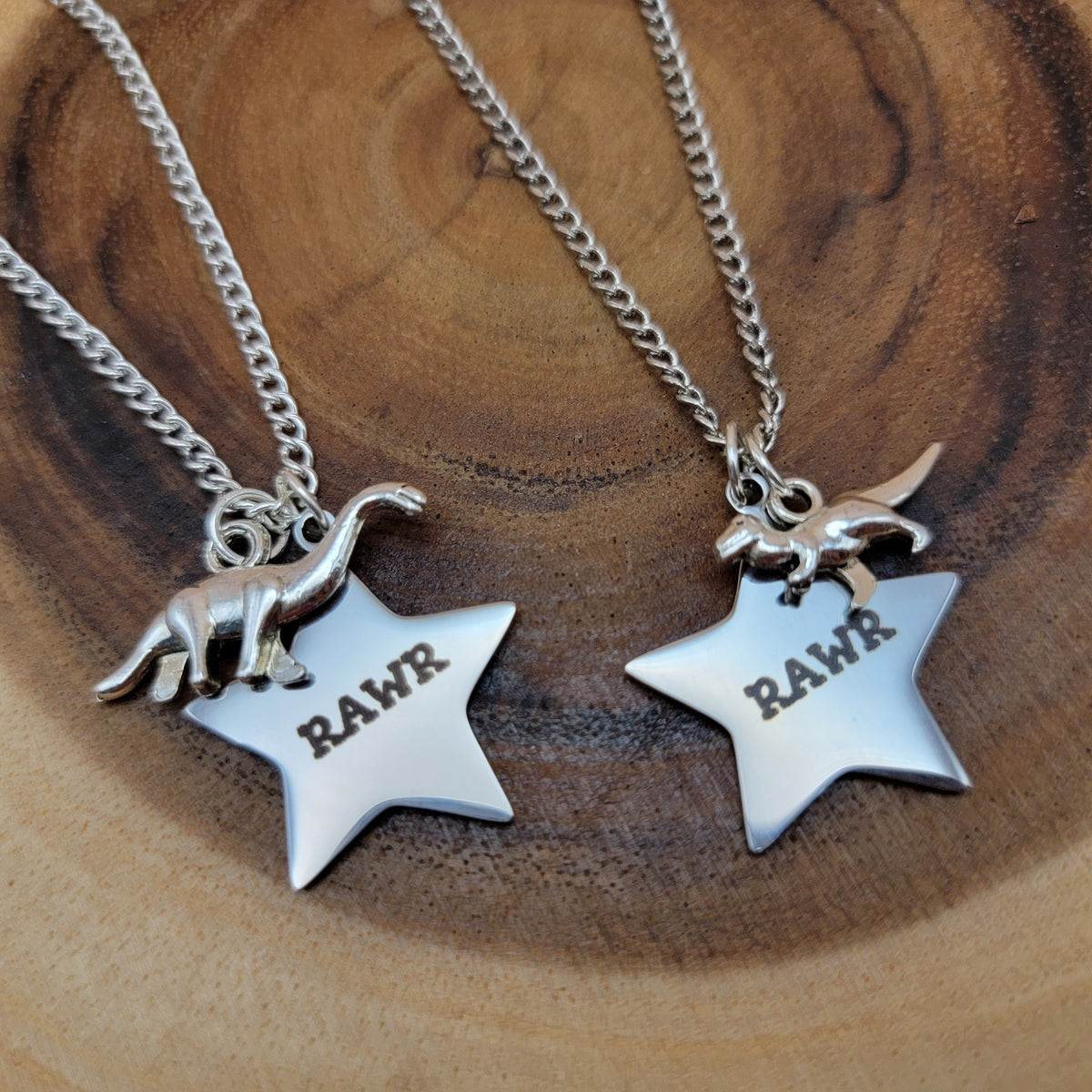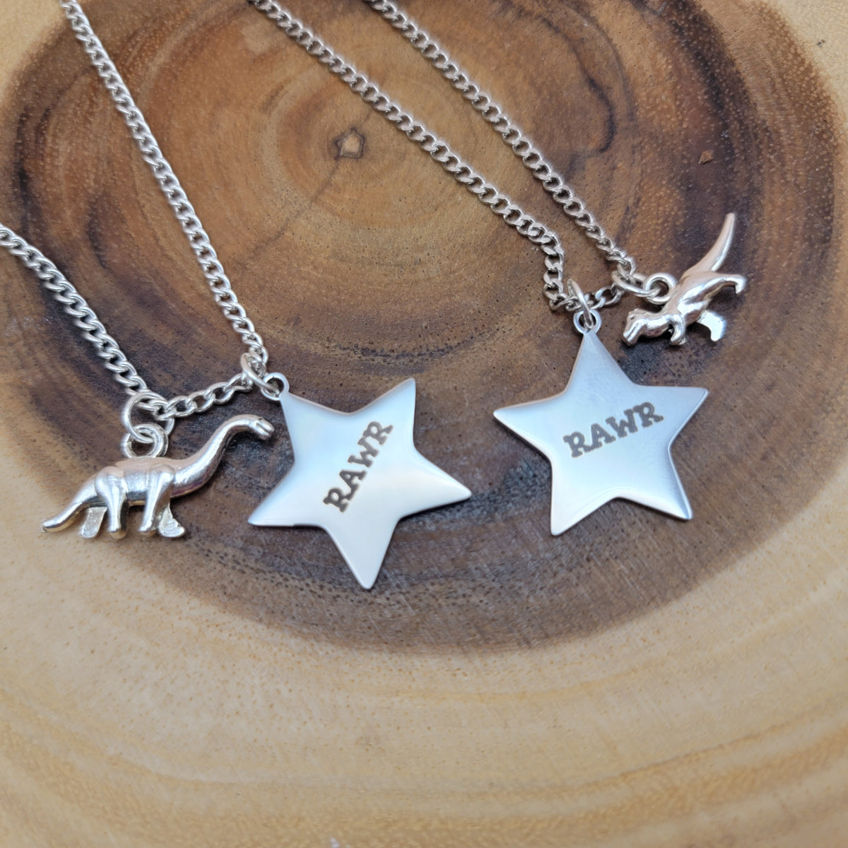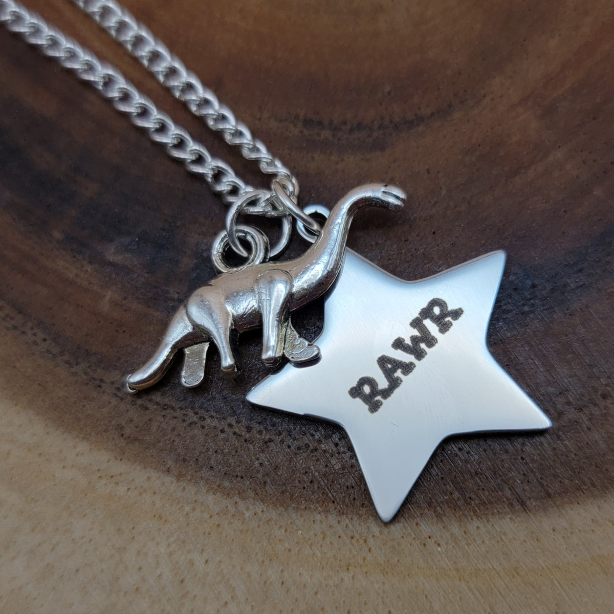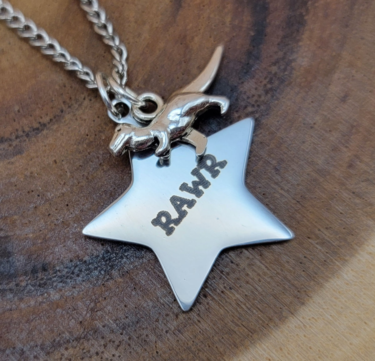 A necklace with a star laser engraved with RAWR and a dinosaur charm. Choose your preferred dinosaur and chain length!