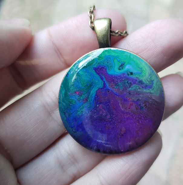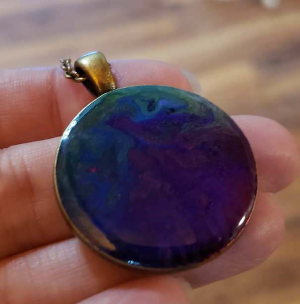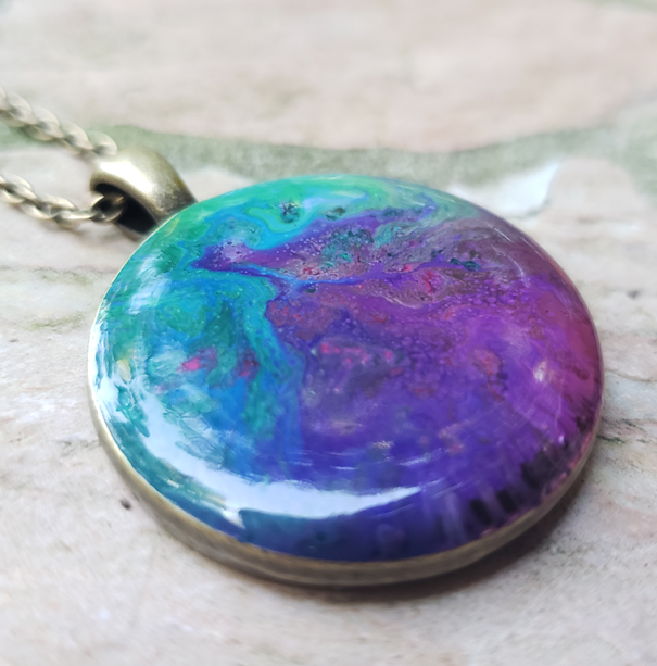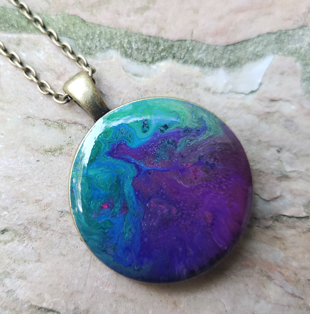A resin pendant colored with alcohol ink. A stunning pendant with green, blue, purple, and a deep pink. Comes on a matching 18 inch chain.