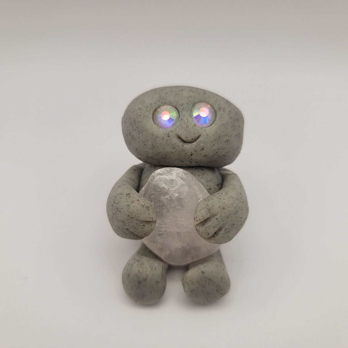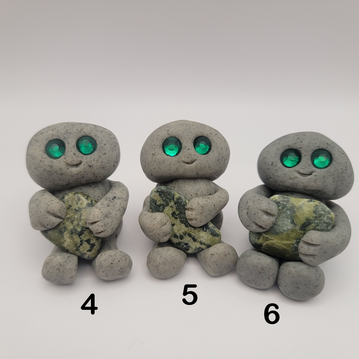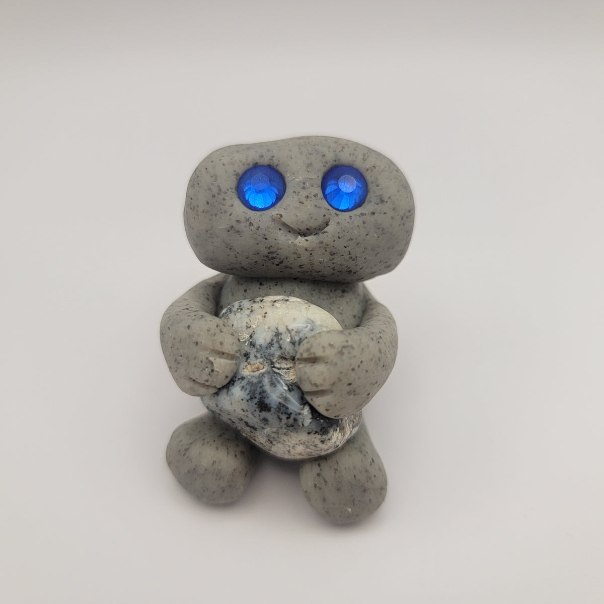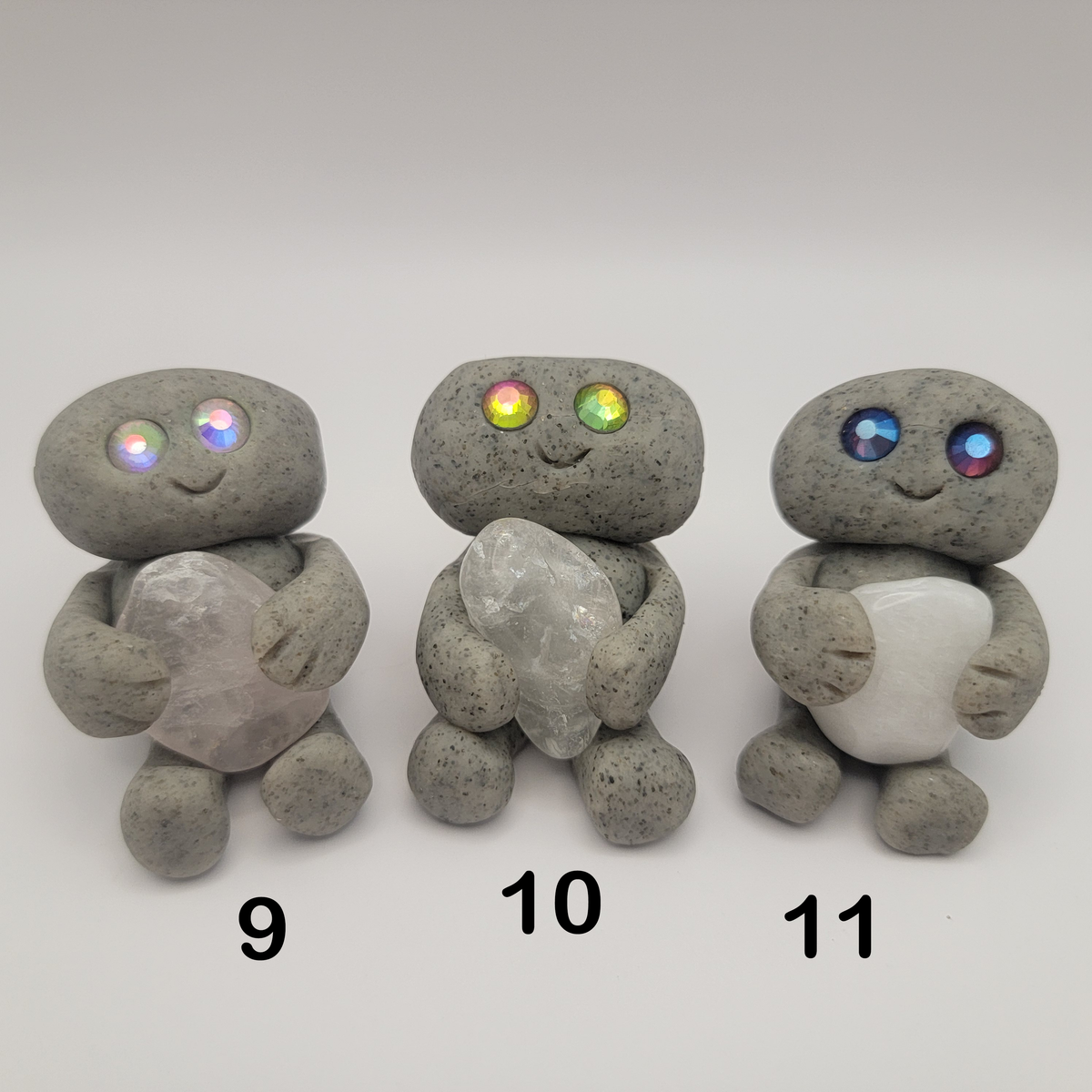 Small rock friends made out of granite clay. These smiley creatures have rhinestone eyes, and are ready to cheer you on in all that you do. Each rock friend is holding onto its emotional support stone.