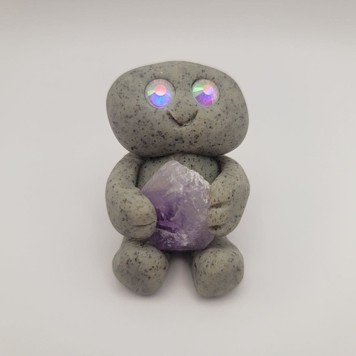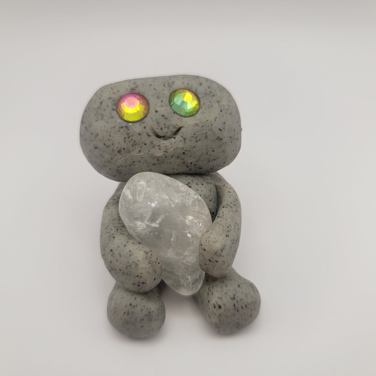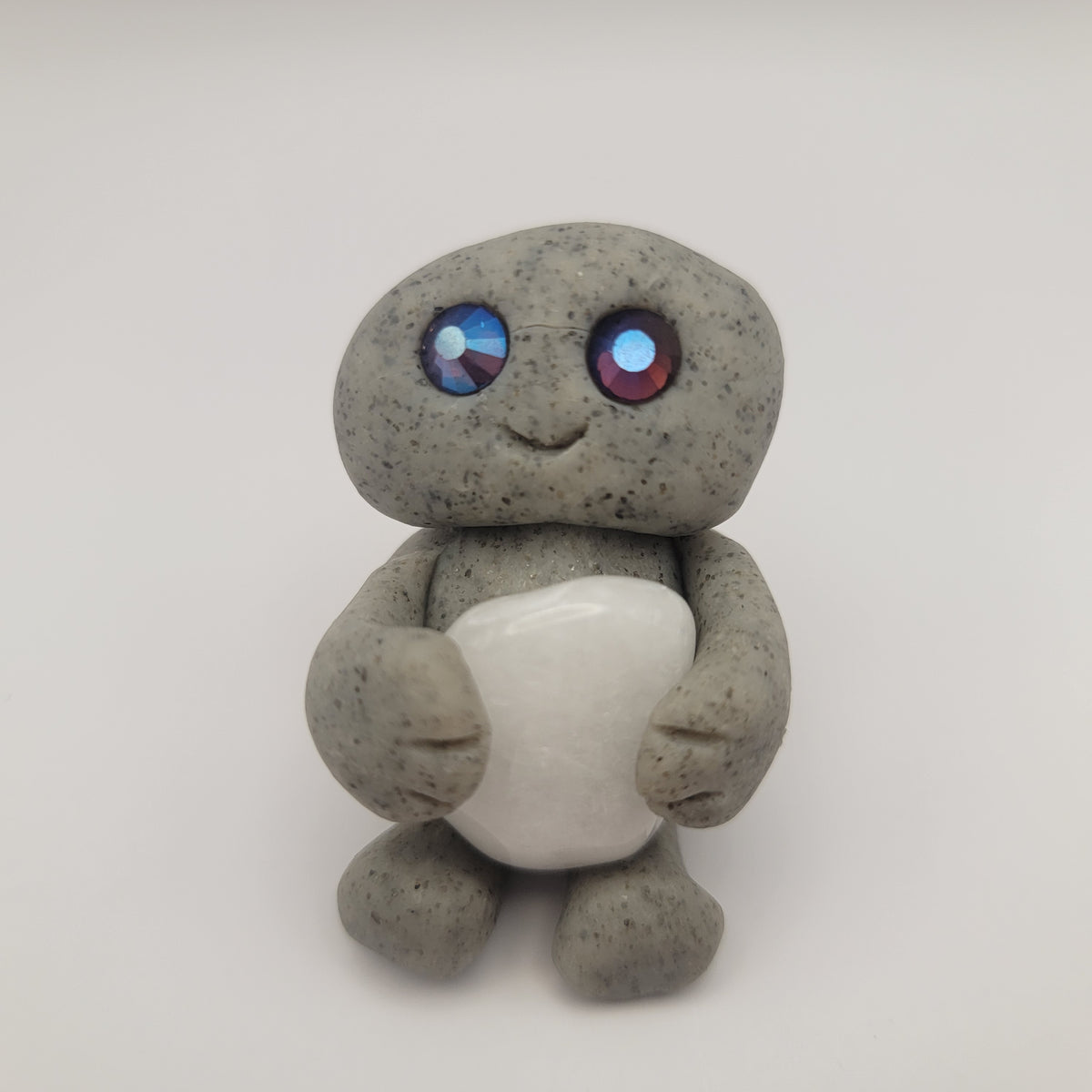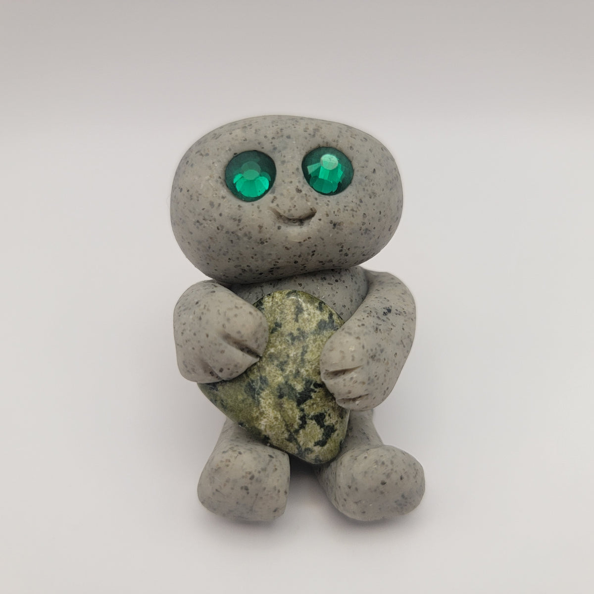 Small rock friends made out of granite clay. These smiley creatures have rhinestone eyes, and are ready to cheer you on in all that you do. Each rock friend is holding onto its emotional support stone.