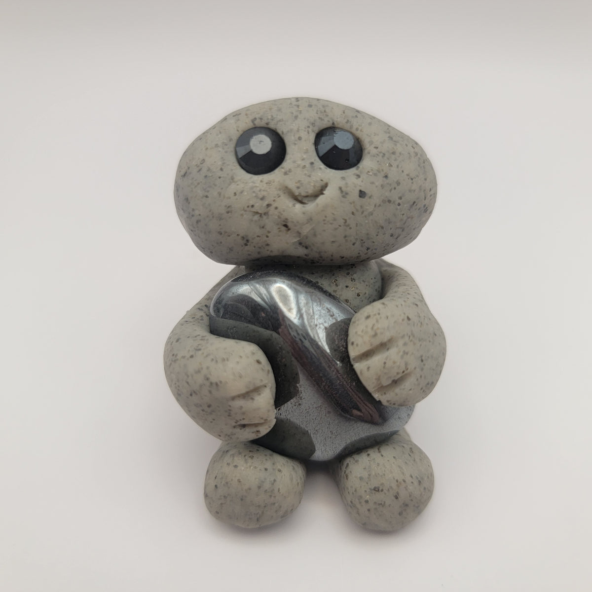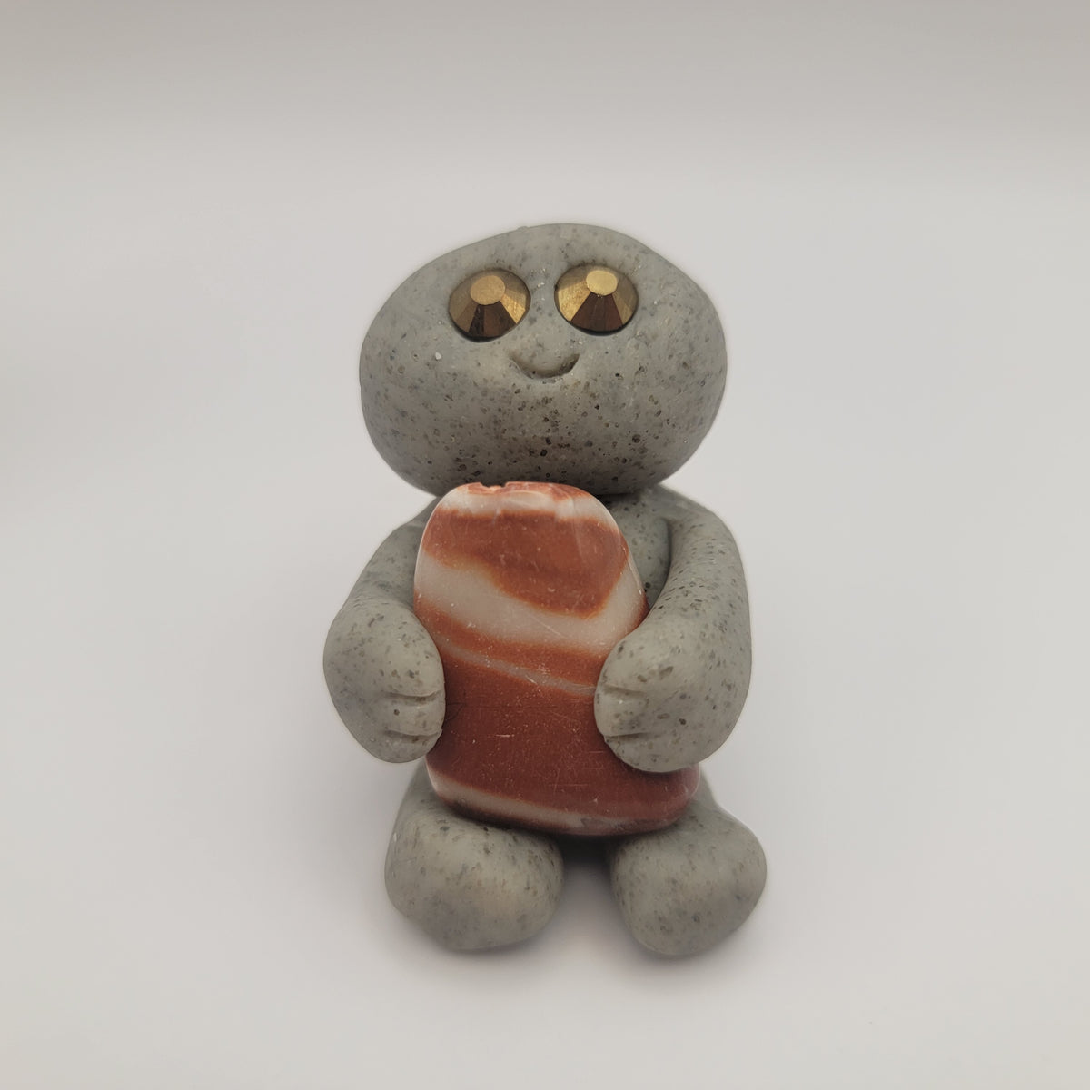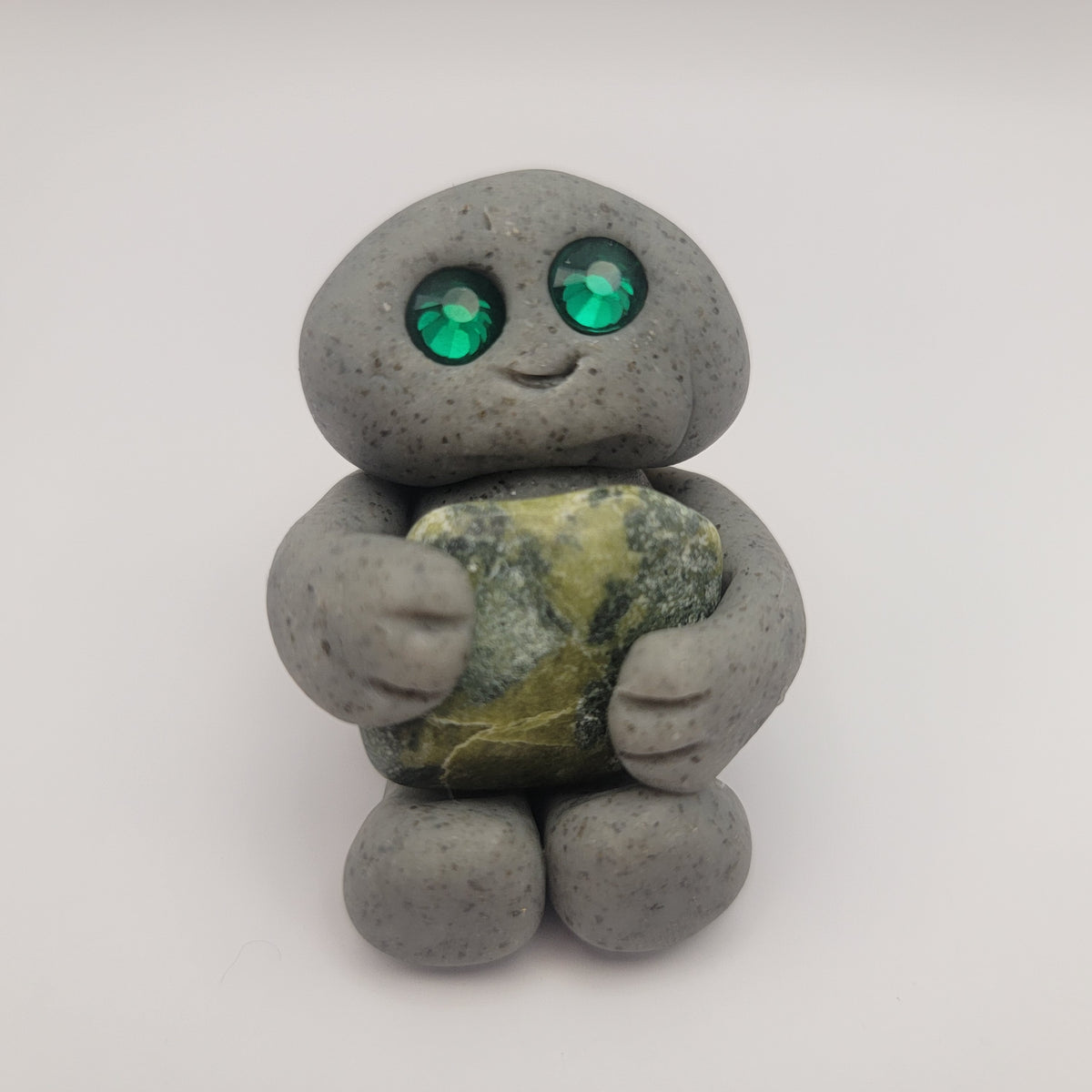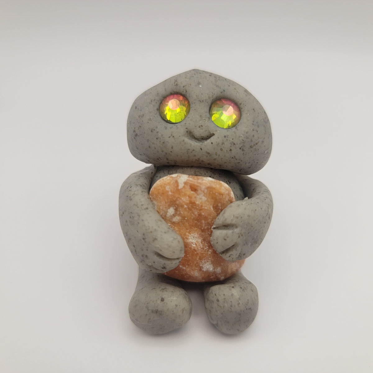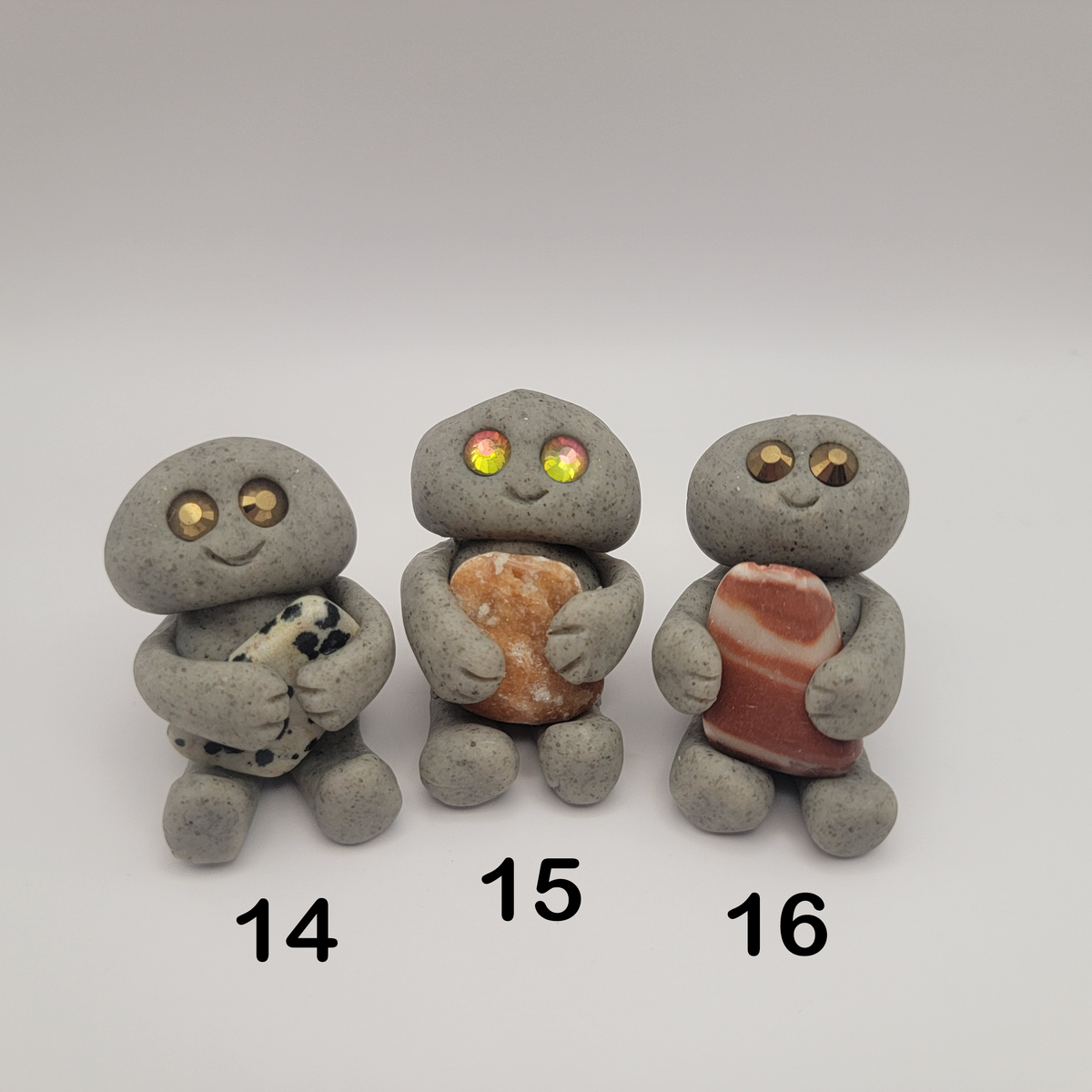 Small rock friends made out of granite clay. These smiley creatures have rhinestone eyes, and are ready to cheer you on in all that you do. Each rock friend is holding onto its emotional support stone.