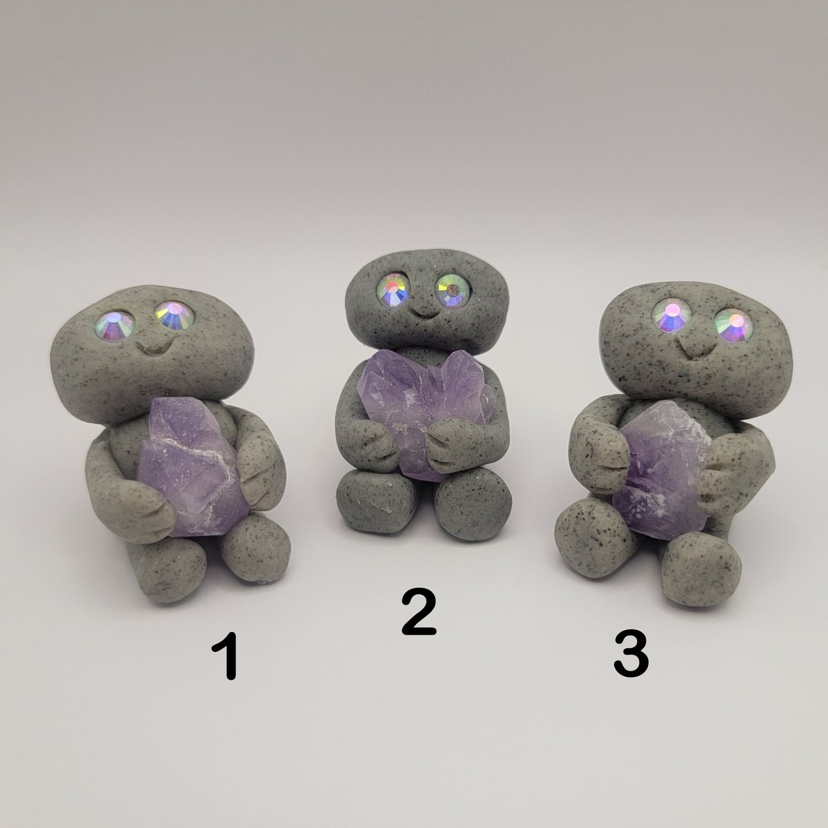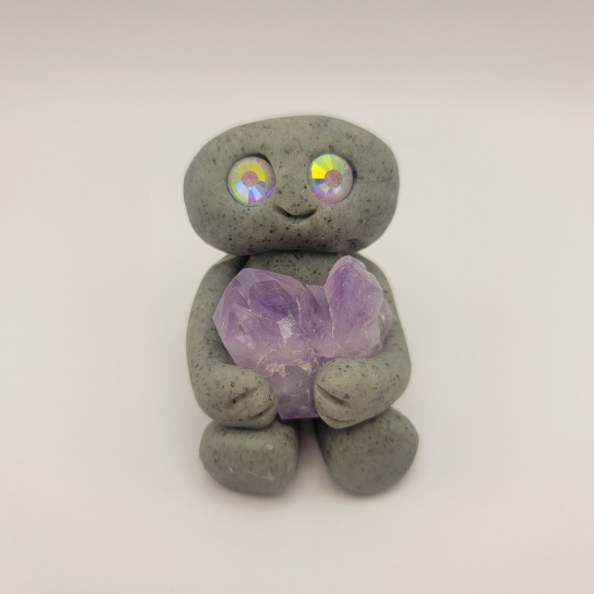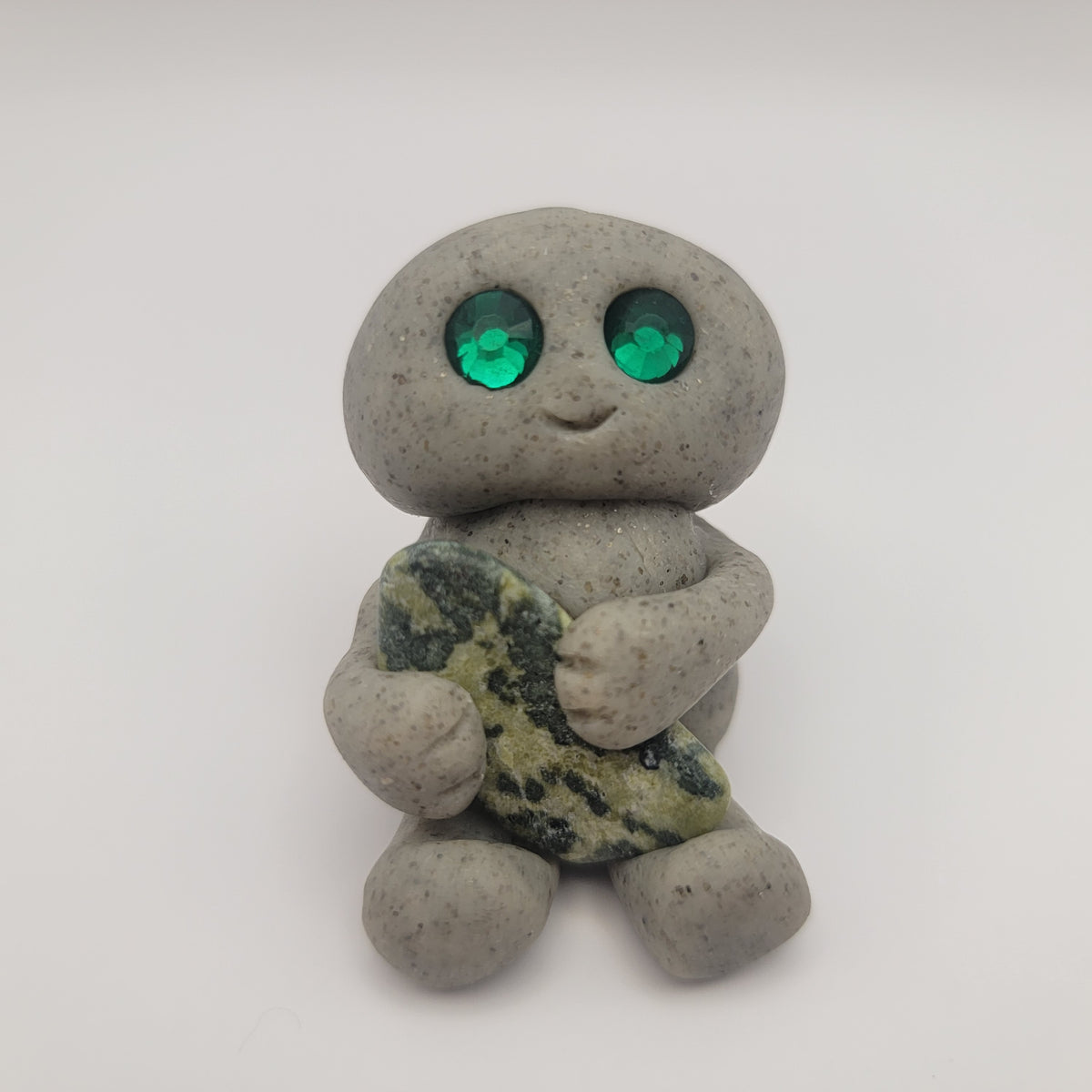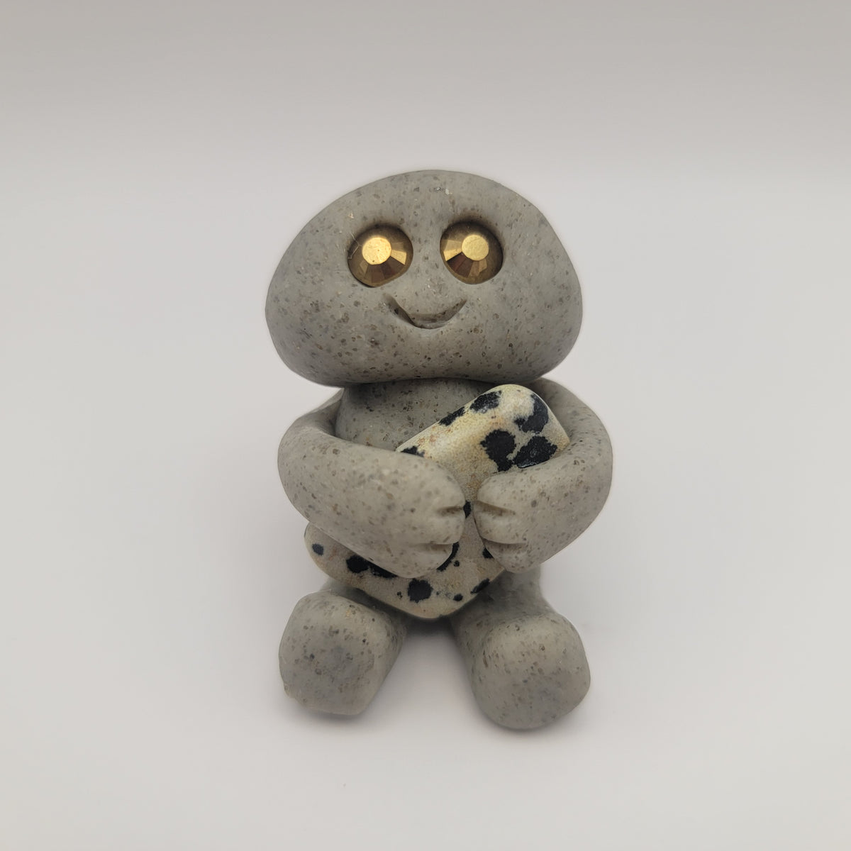 Small rock friends made out of granite clay. These smiley creatures have rhinestone eyes, and are ready to cheer you on in all that you do. Each rock friend is holding onto its emotional support stone.