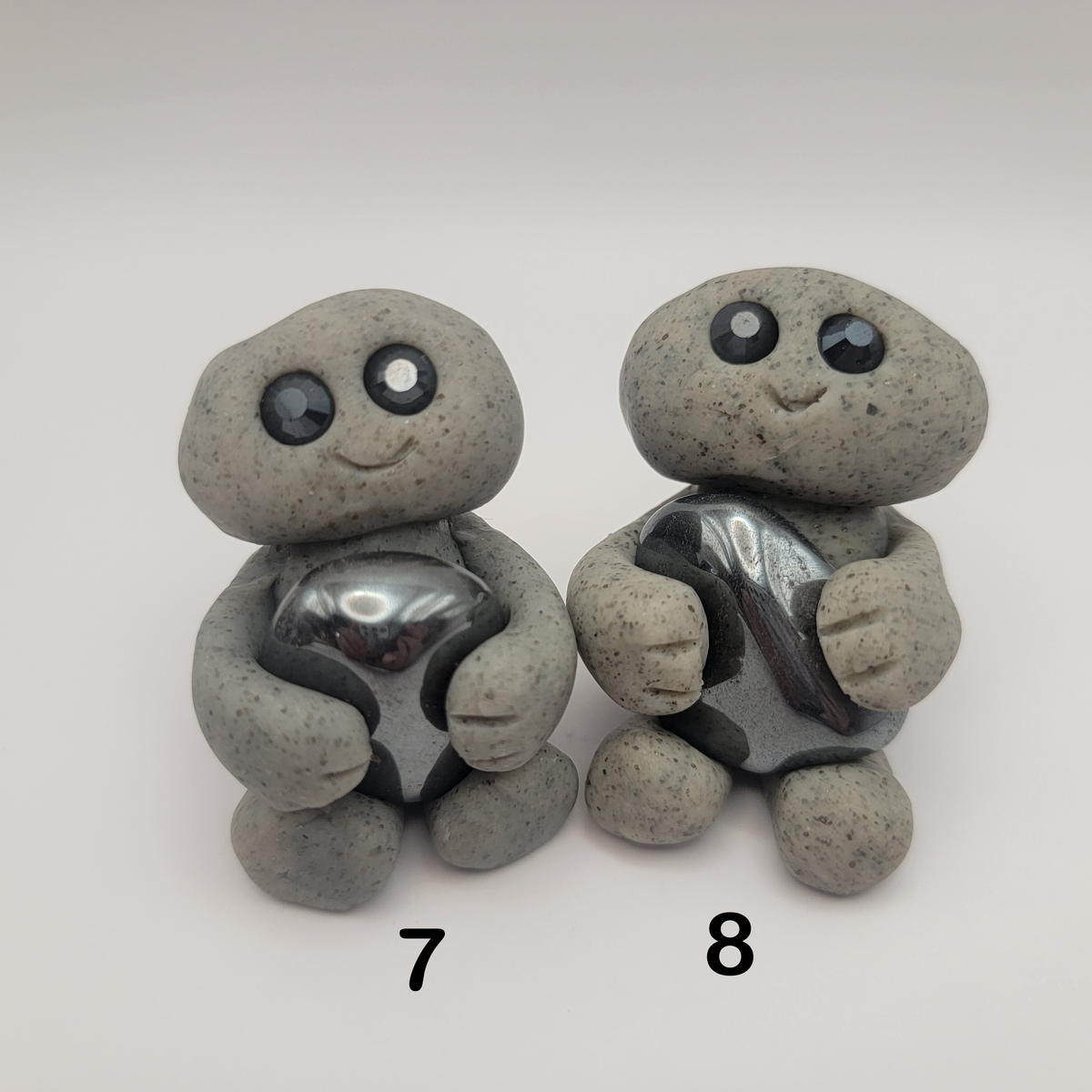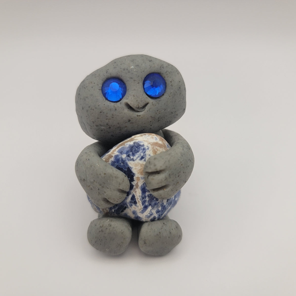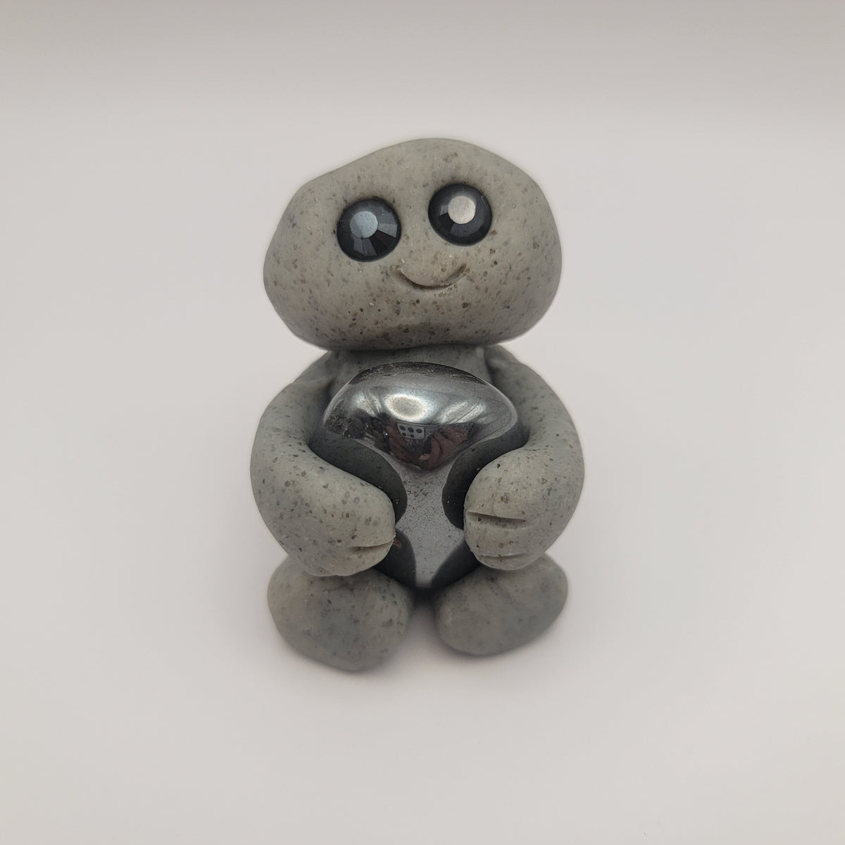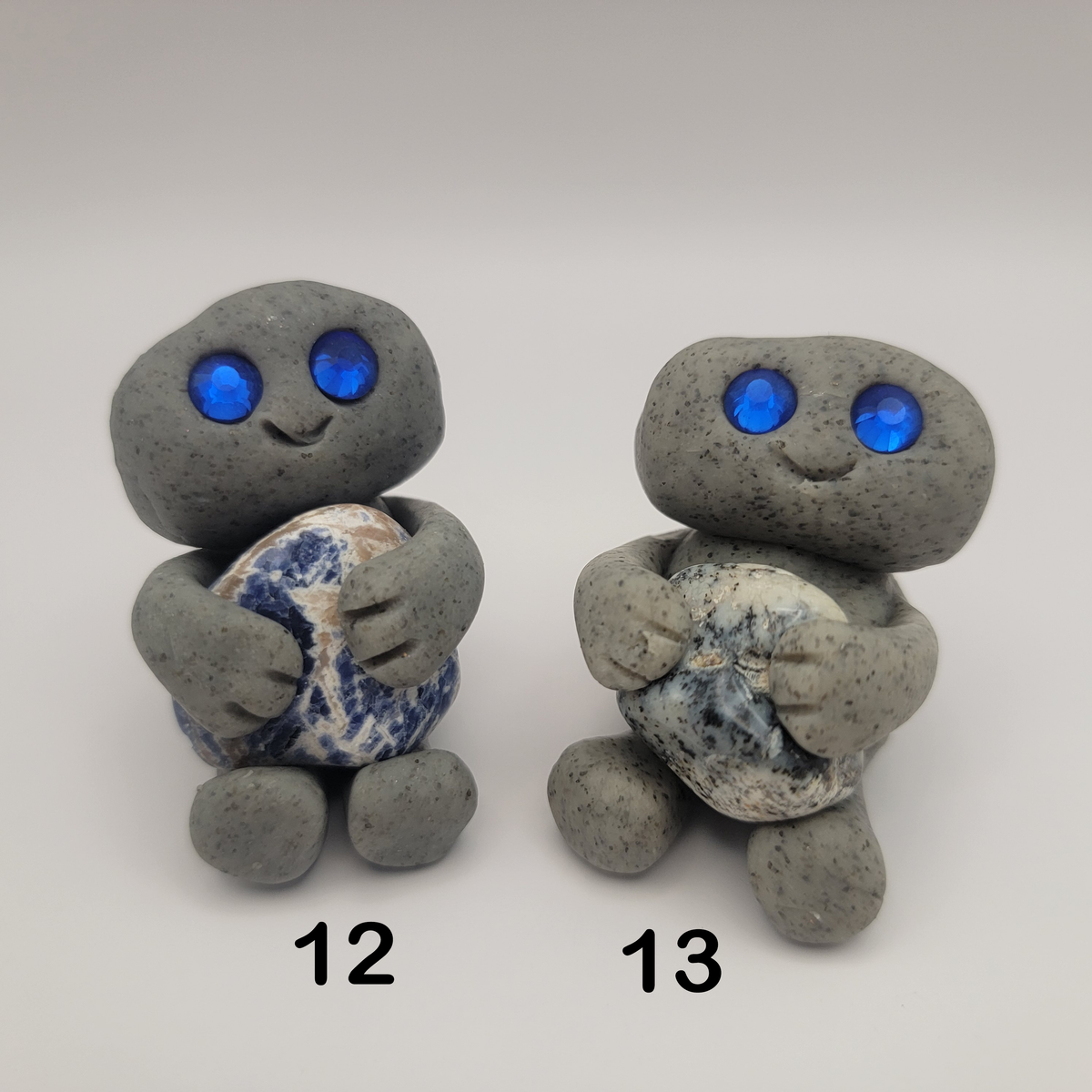 Small rock friends made out of granite clay. These smiley creatures have rhinestone eyes, and are ready to cheer you on in all that you do. Each rock friend is holding onto its emotional support stone.
