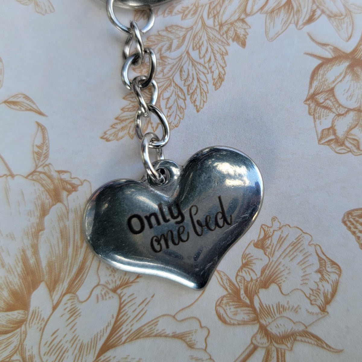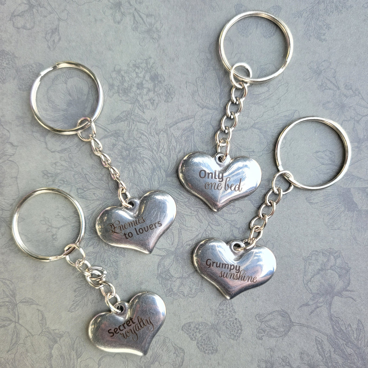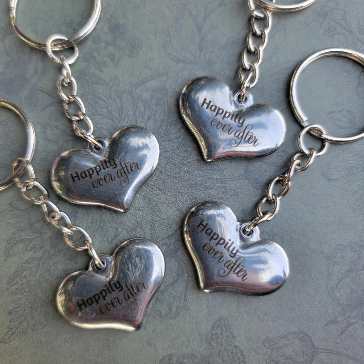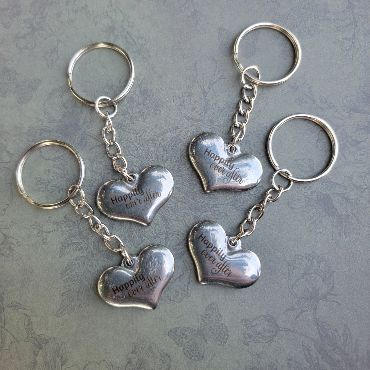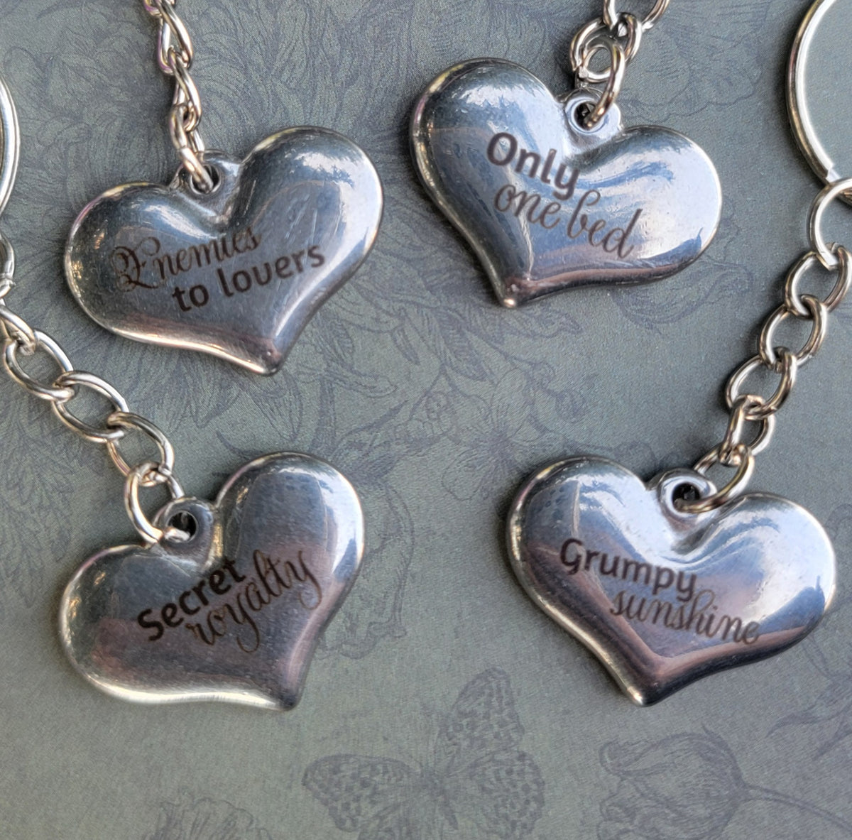 Double sided laser engraved keychains. One side is engraved with "Happily ever after" and the other side engraved with your choice of romance trope. Pick from: