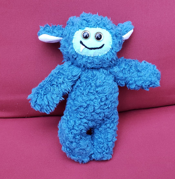A one-fanged teal cozy monster with a big smile! This monster has sparkling gold eyes and super soft teal fur.