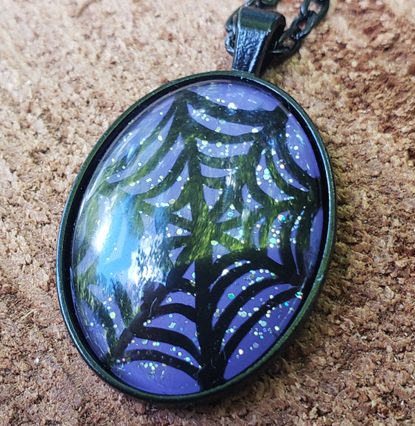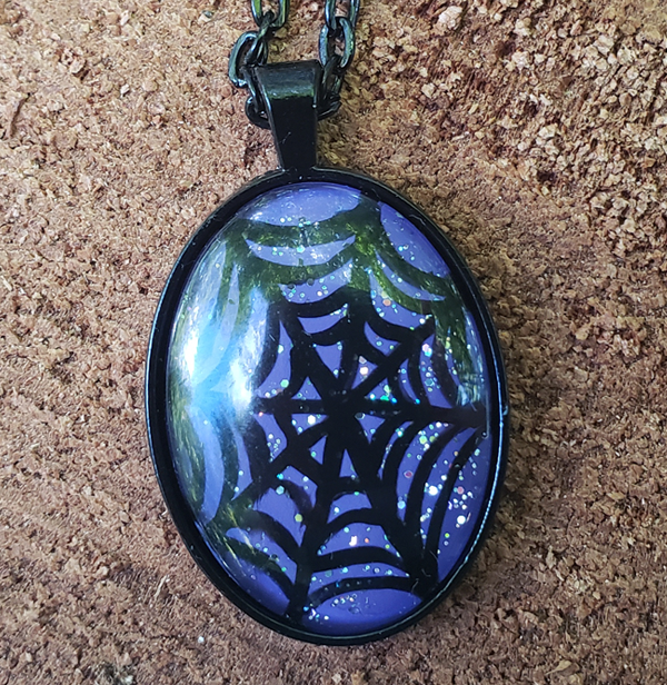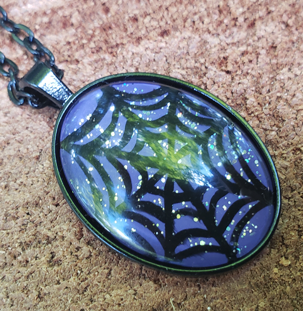 A hand-painted spiderweb on a glass cabochon with a glitter purple background. The perfect accent for your Halloween outfits! Set in black oval shaped bezel tray, and comes on a matching 24 inch chain. Cabochon measures 22x30mm.