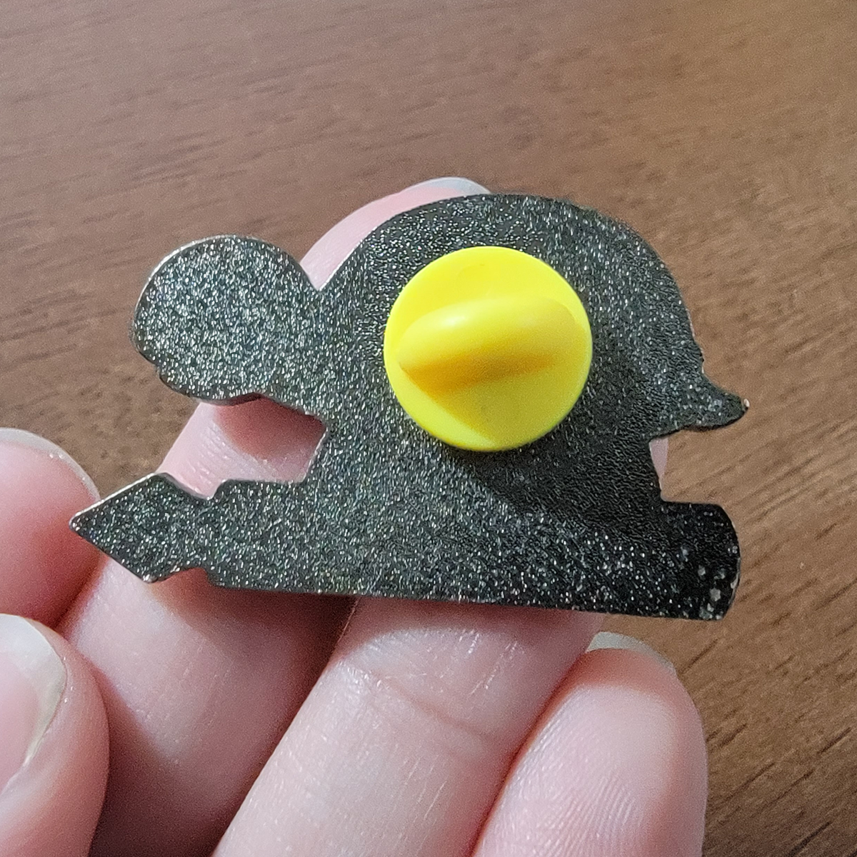 The turtle is a hard enamel pin with black nickel plating and a yellow rubber clutch.  It is 37mm wide.