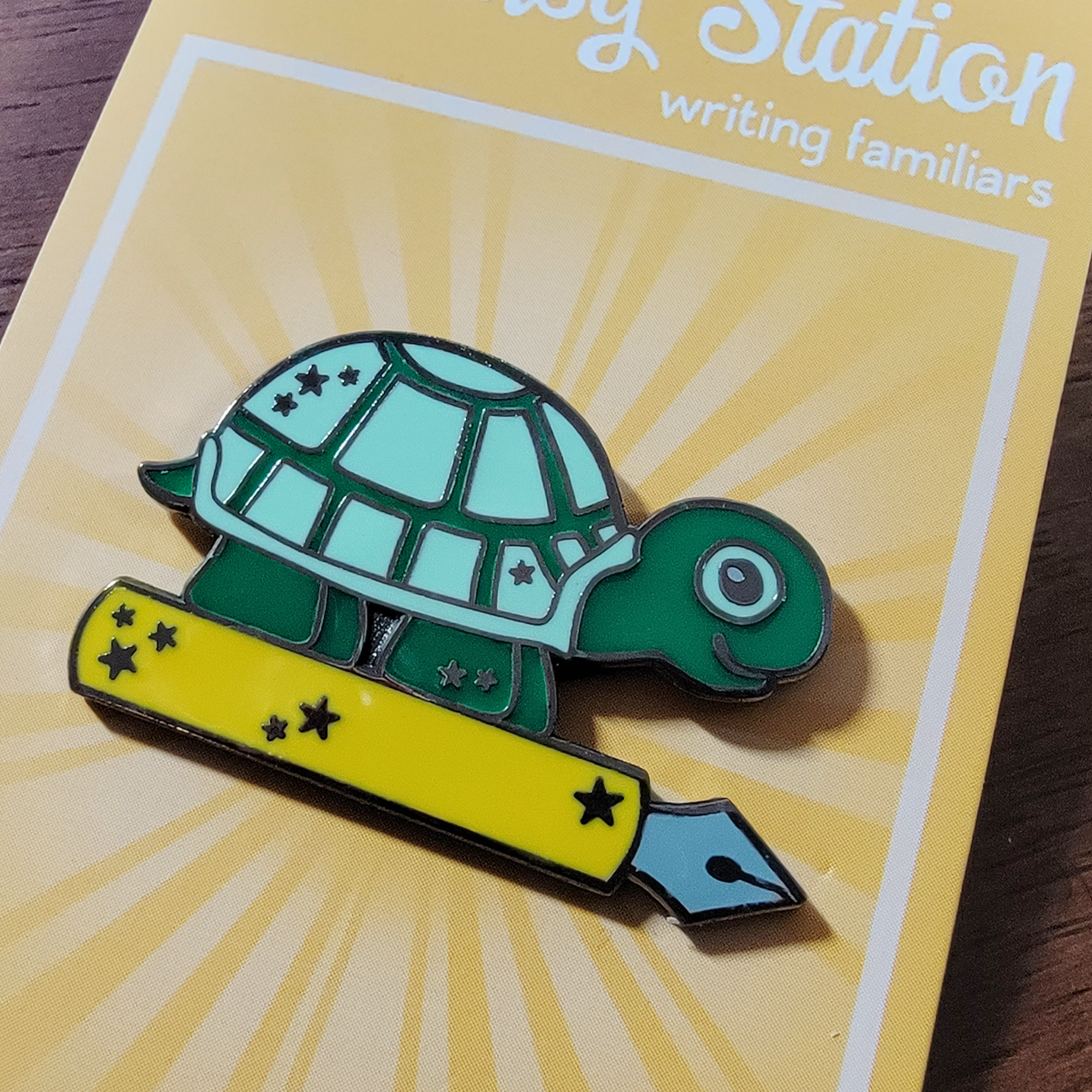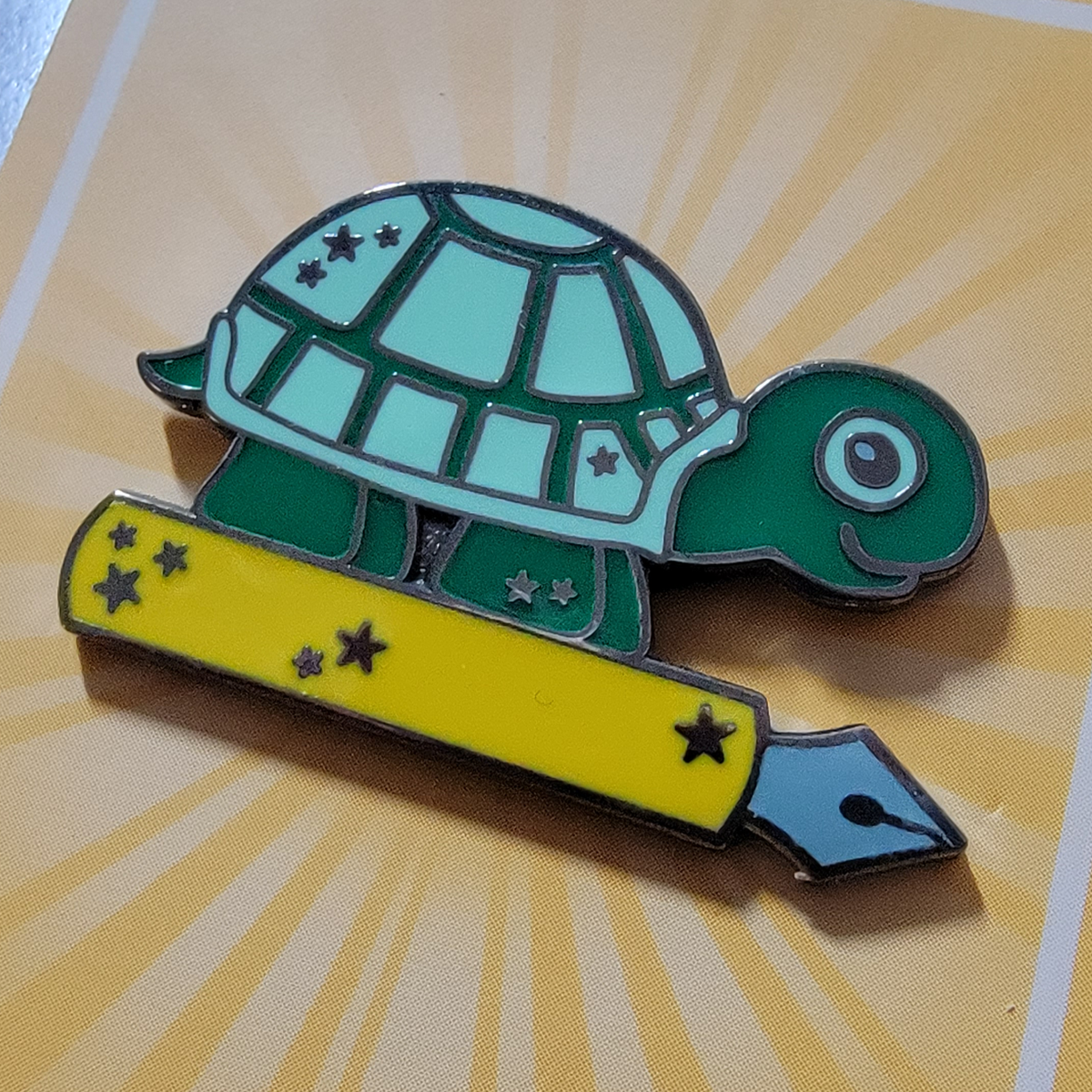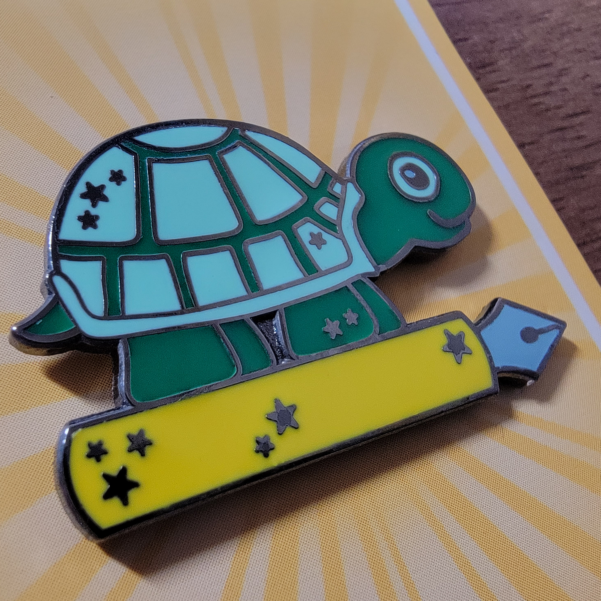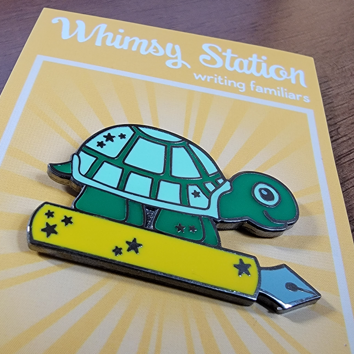 This little turtle is moving along at its own pace, but with just as much inspiration as any other writing familiar!  It is standing on top of yellow fountain pen with shiny black stars.  The smiling turtle is dark green with a light green shell and it has stars on it as well.