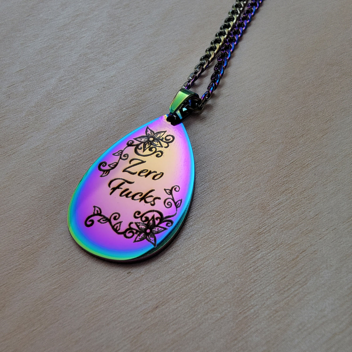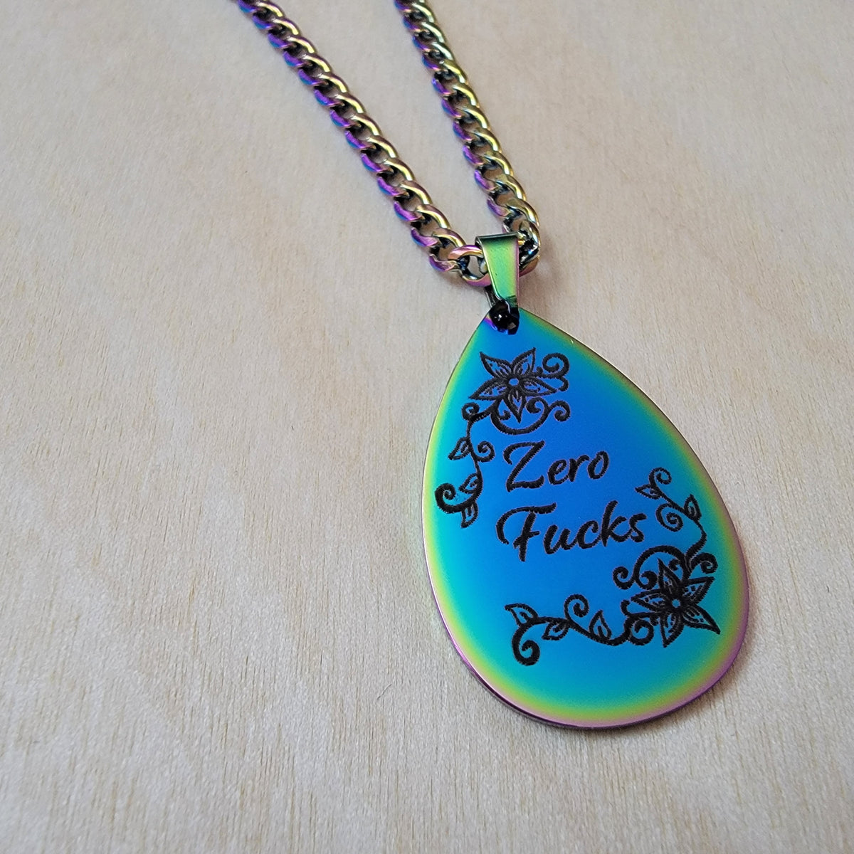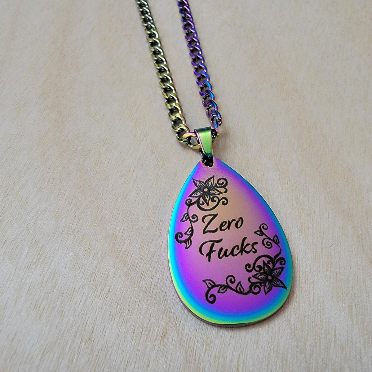 This rainbow necklace is ready to announce just how many fucks you have left to give! Teardrop shaped, it has flowers surrounding the words "Zero Fucks" on rainbow plated stainless steel.