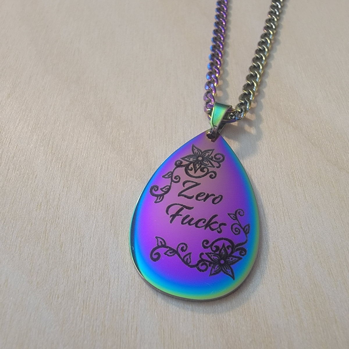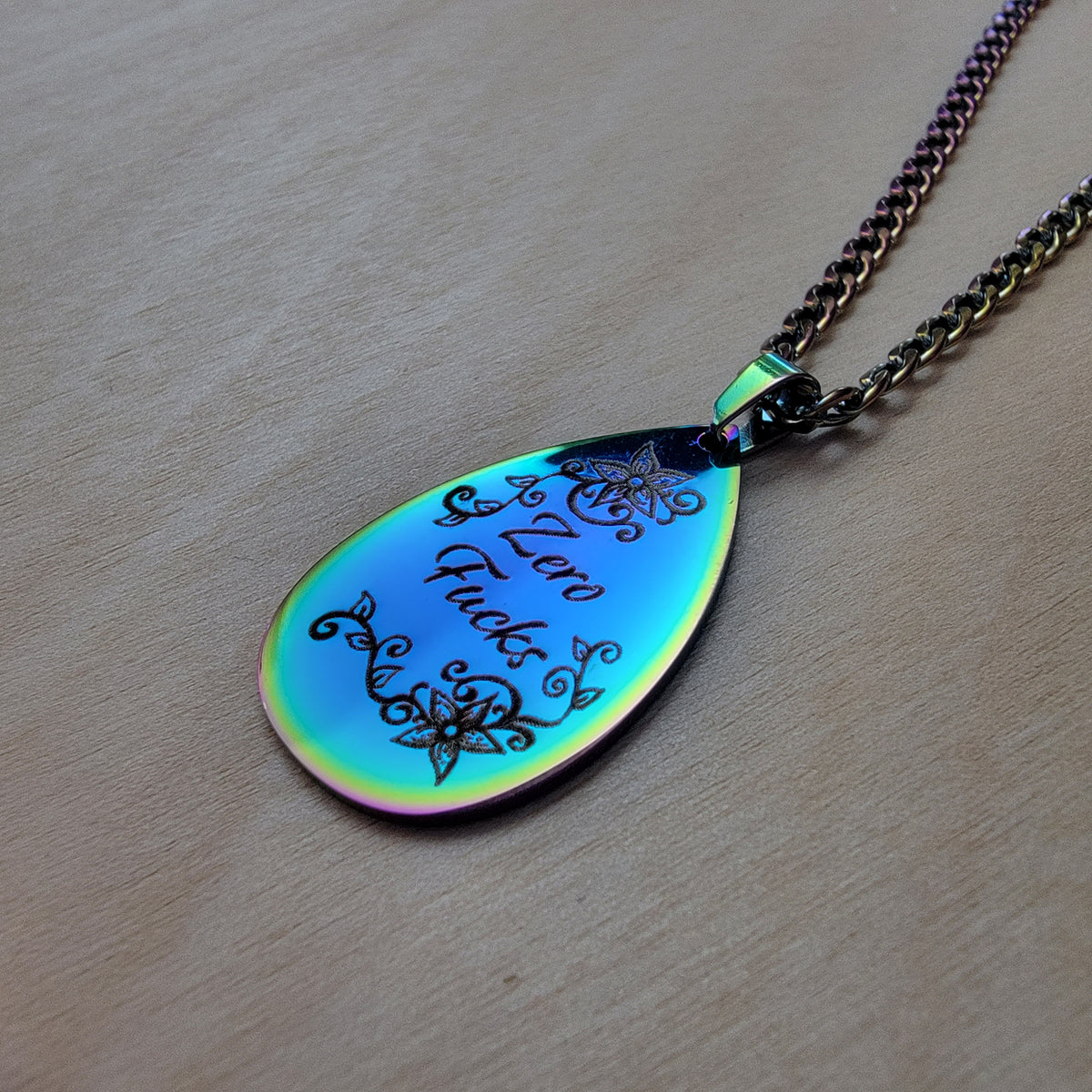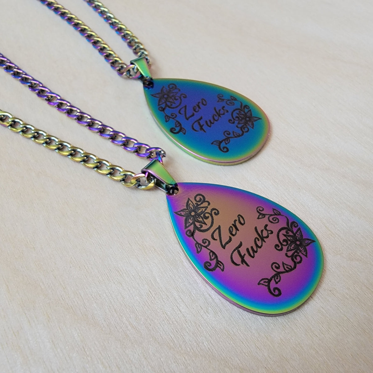 This rainbow necklace is ready to announce just how many fucks you have left to give! Teardrop shaped, it has flowers surrounding the words "Zero Fucks" on rainbow plated stainless steel.