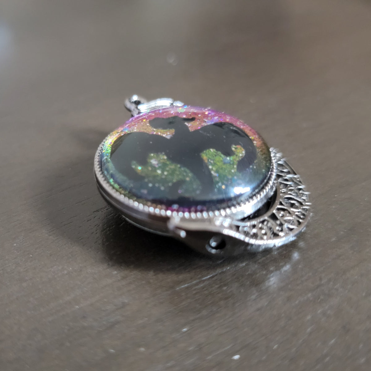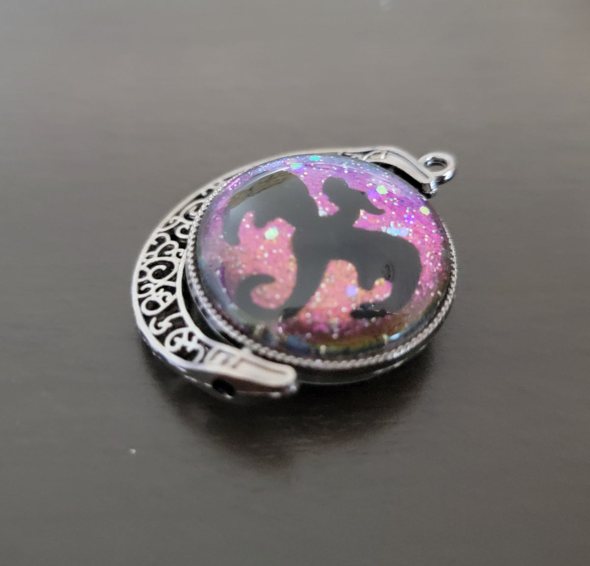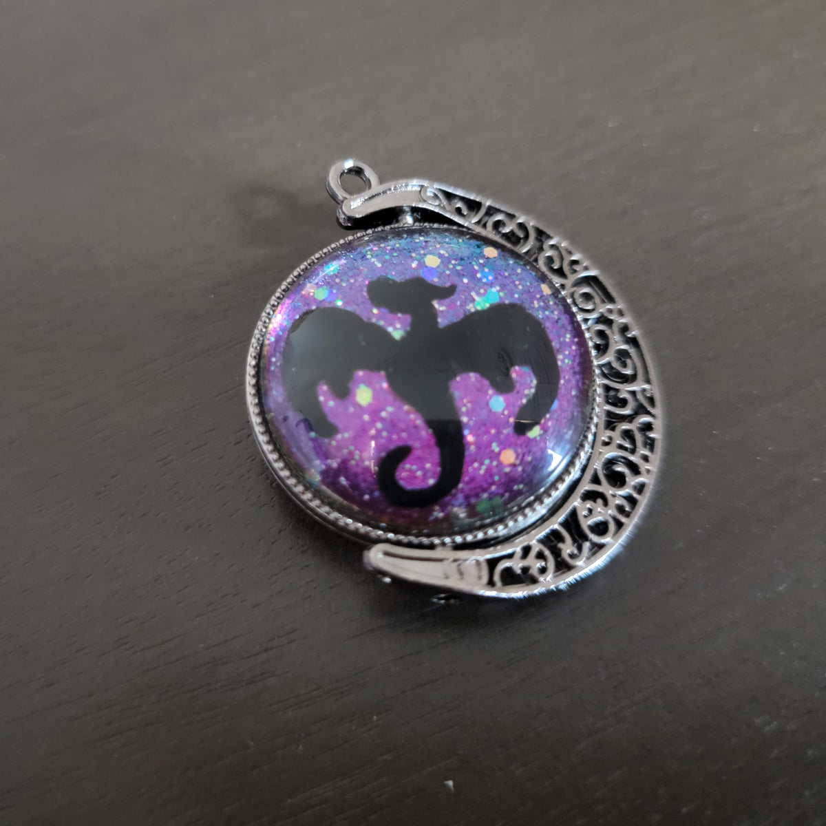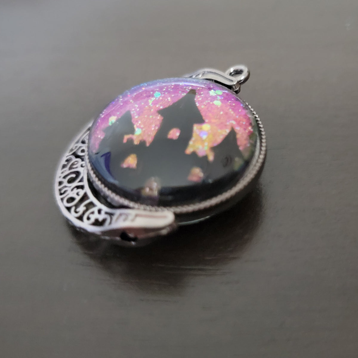 Two hand painted cabochons set in a spinning crescent moon setting.  One side features a dragon and the other side features a castle.  These are painted with a magical glittery iridescent background that changes from a blue-purple to pink to golds and greens depending on the angle.