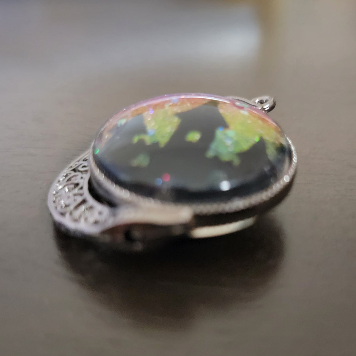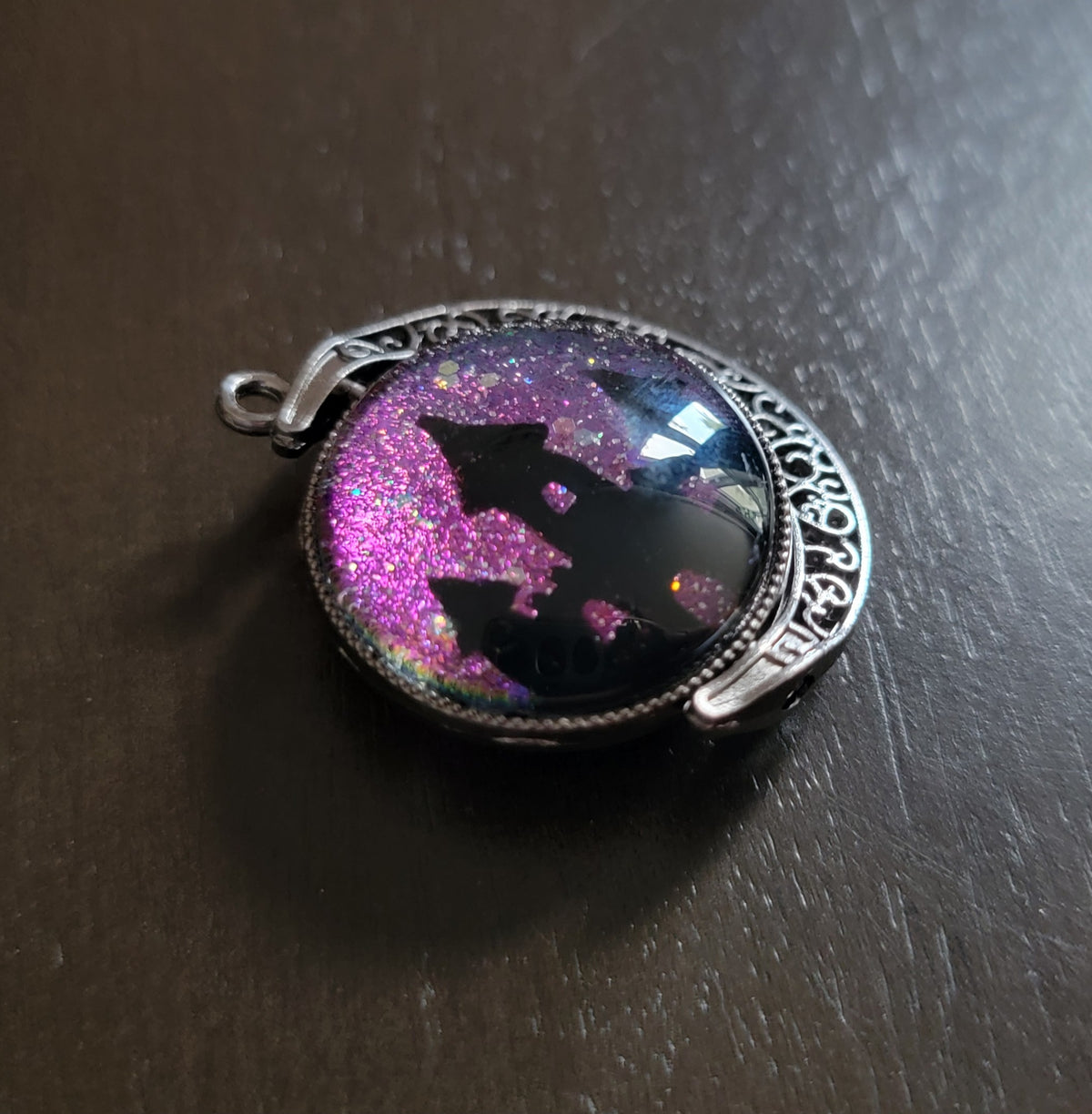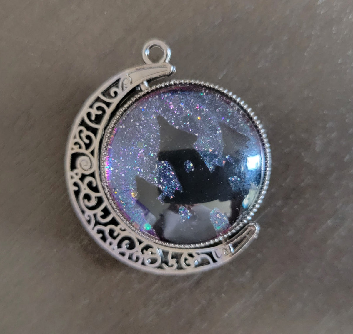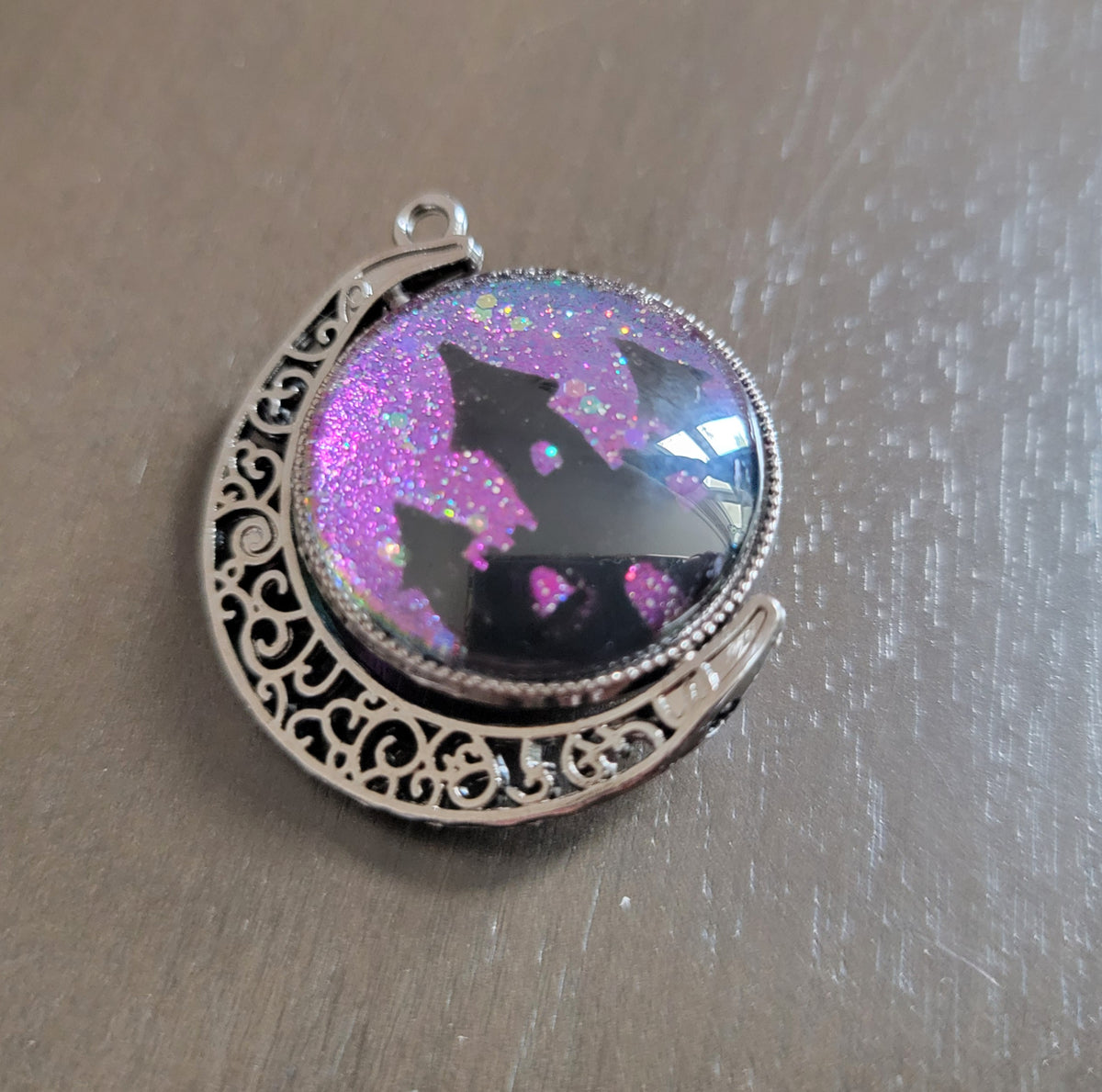 Two hand painted cabochons set in a spinning crescent moon setting.  One side features a dragon and the other side features a castle.  These are painted with a magical glittery iridescent background that changes from a blue-purple to pink to golds and greens depending on the angle.