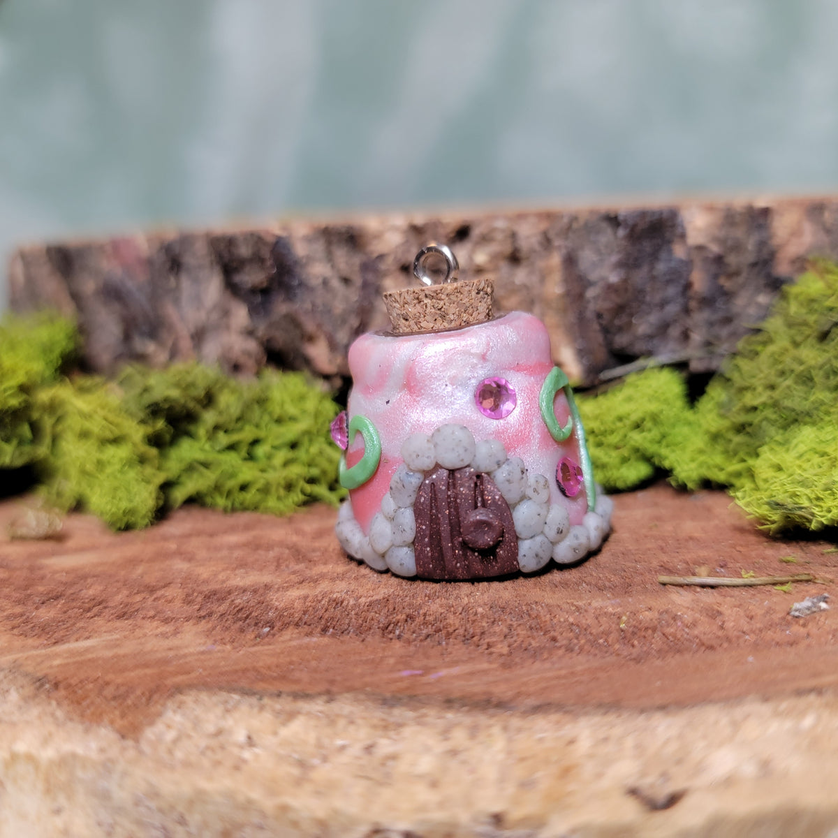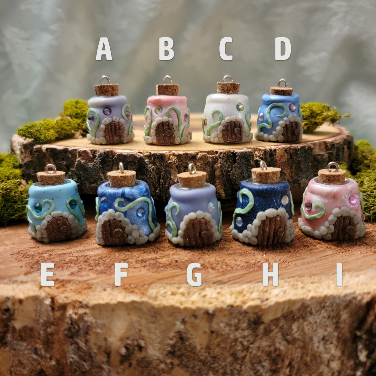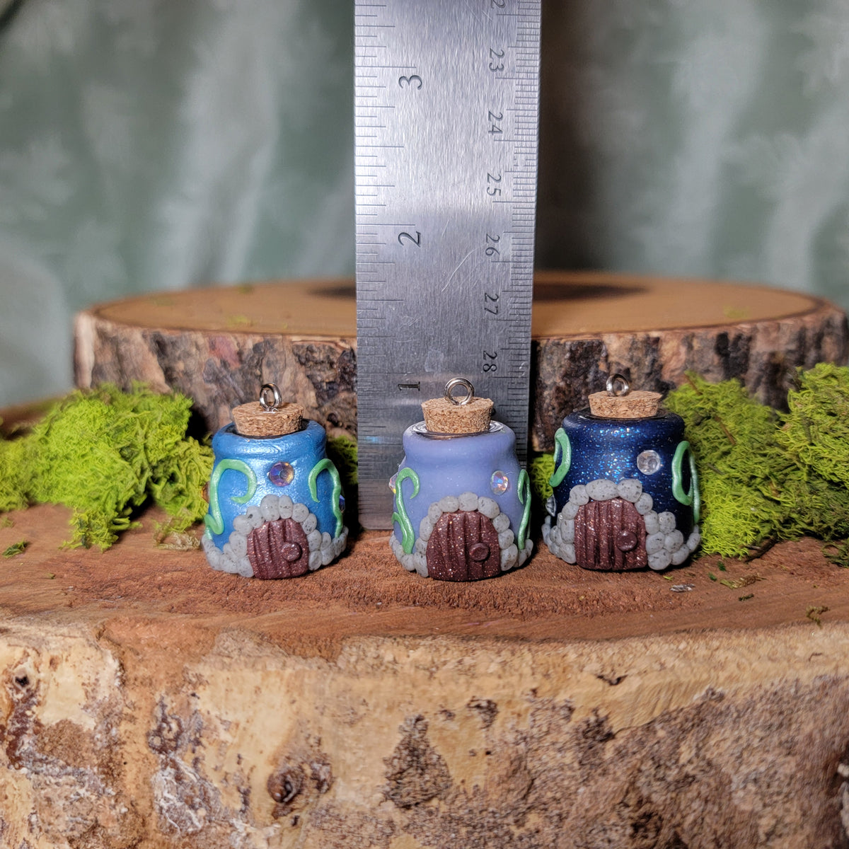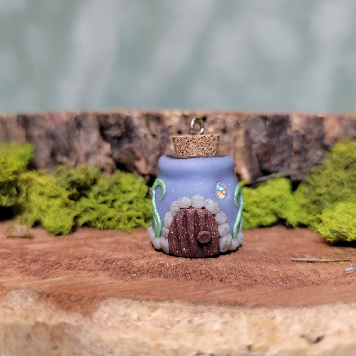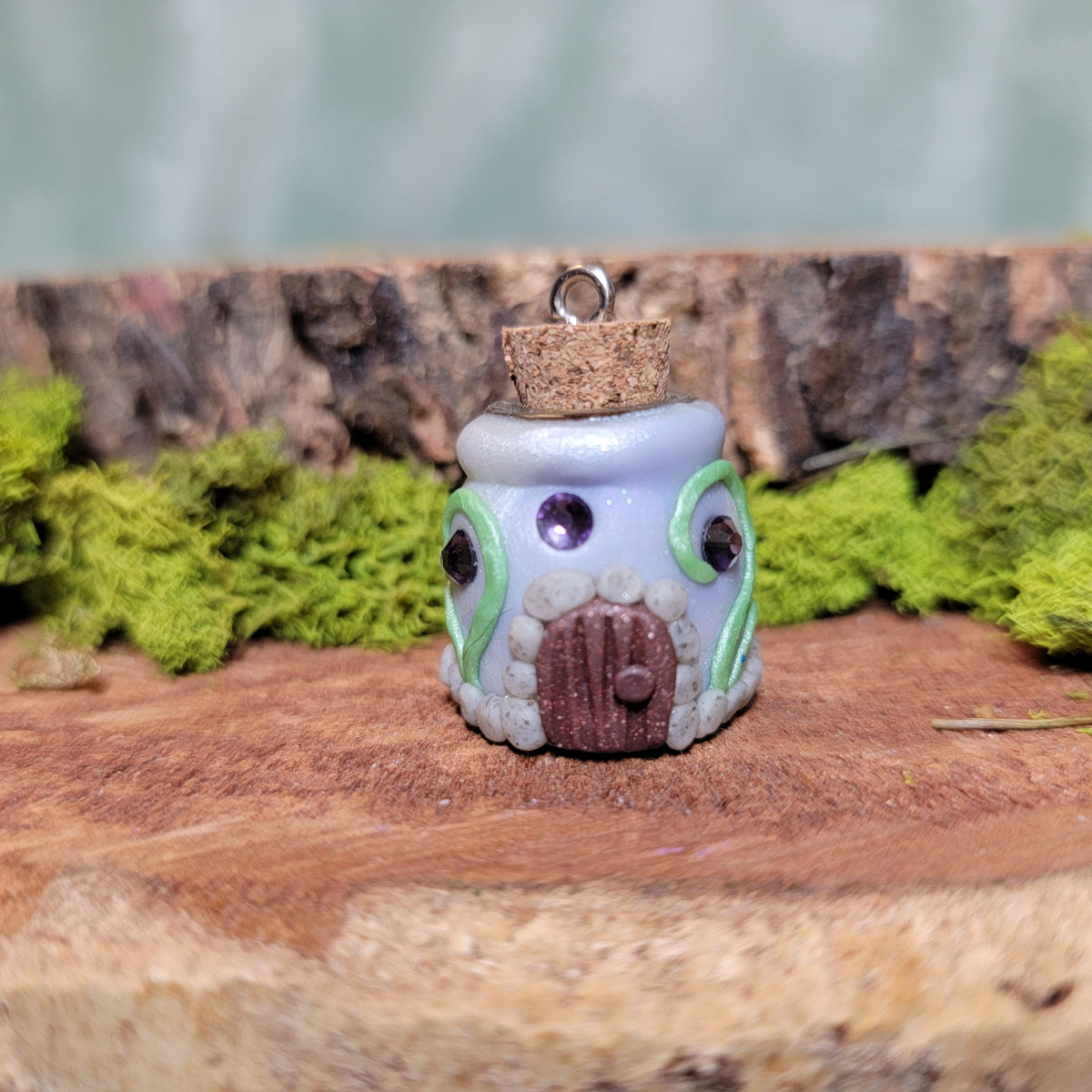 Tiny polymer clay fairy houses built around glass jars with cork tops! Each house has vines swirling around it, and rhinestones set into the walls. The doors are surrounded by stone (also clay). Each fairy house is one of a kind. Select your favorite!