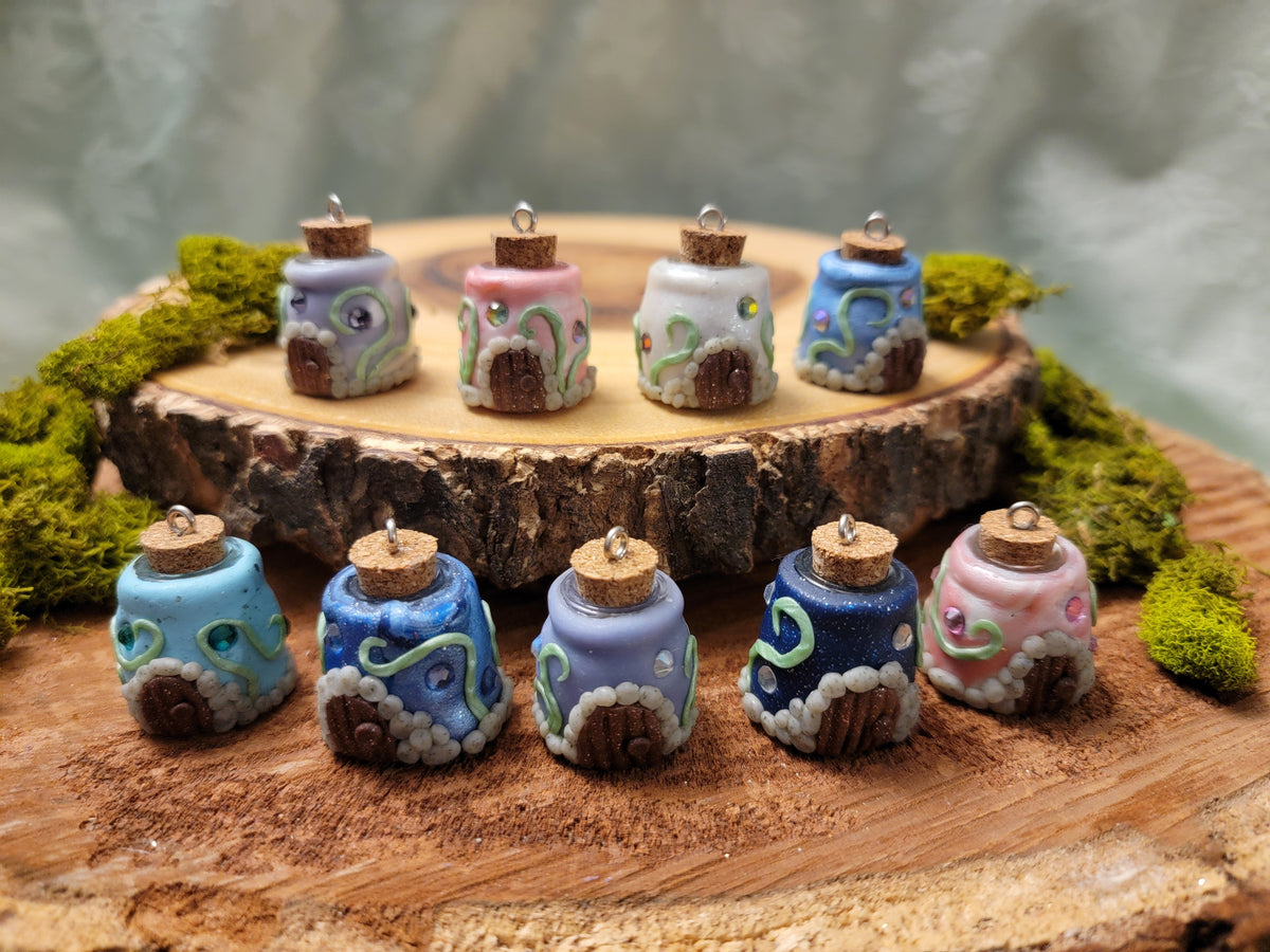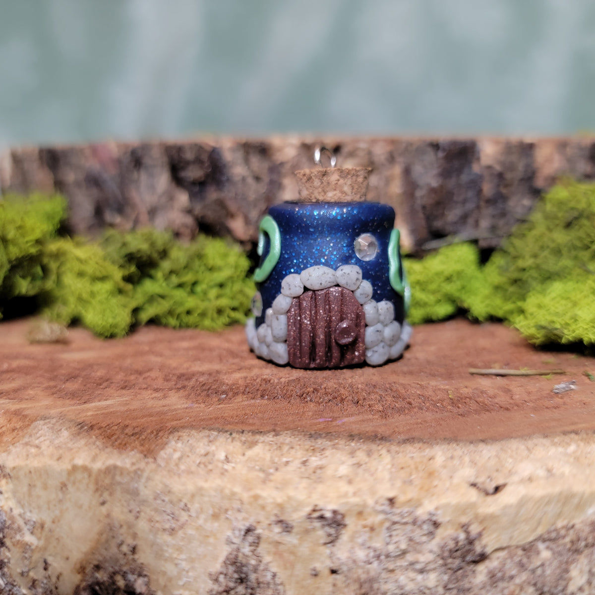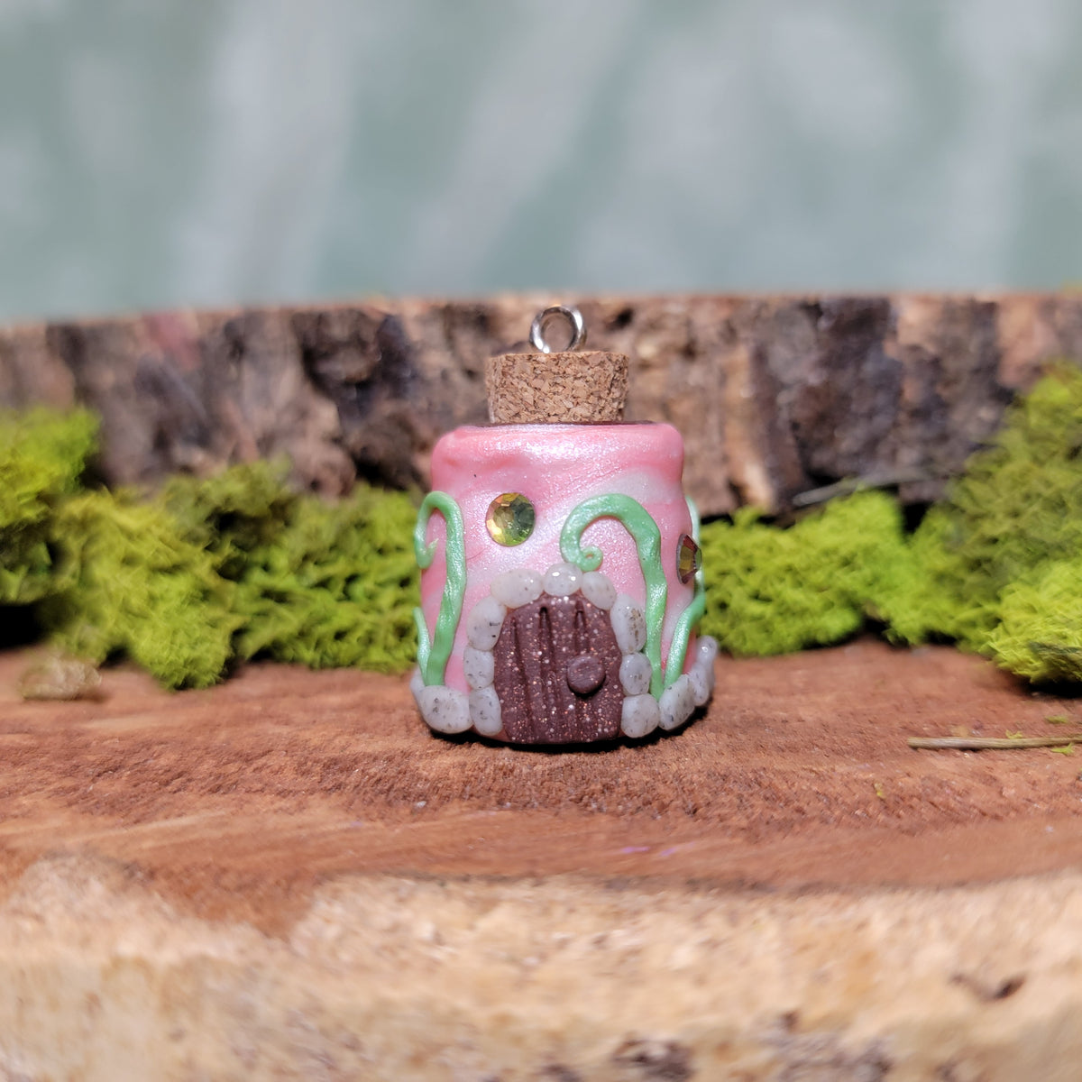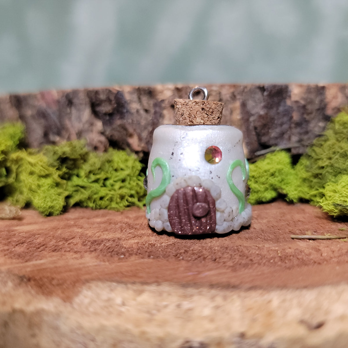 Tiny polymer clay fairy houses built around glass jars with cork tops! Each house has vines swirling around it, and rhinestones set into the walls. The doors are surrounded by stone (also clay). Each fairy house is one of a kind. Select your favorite!