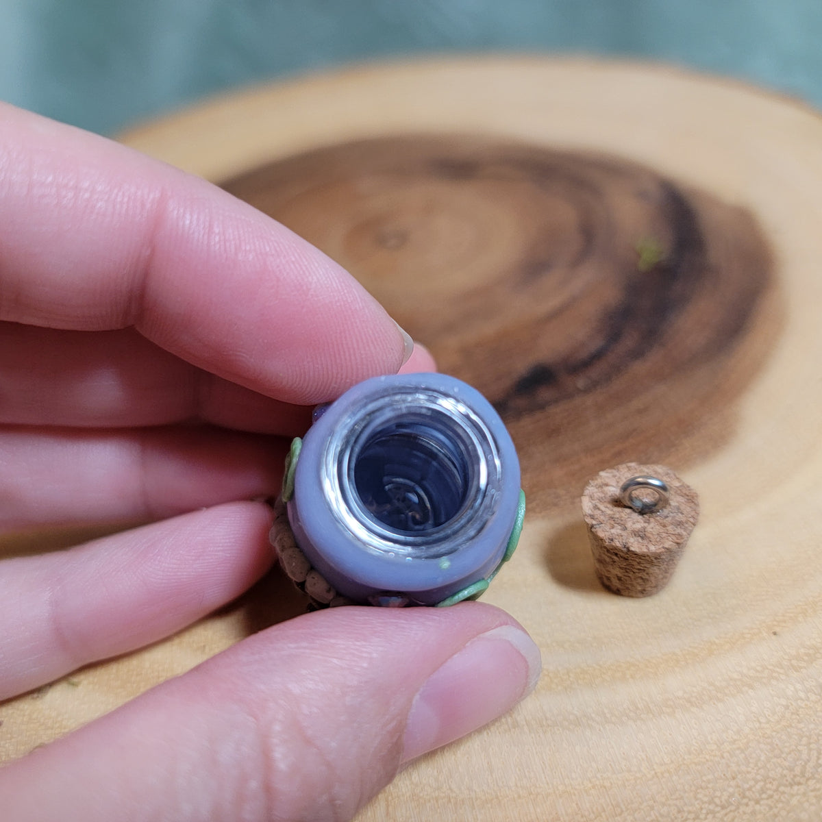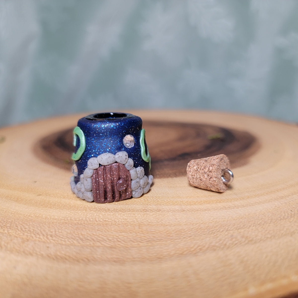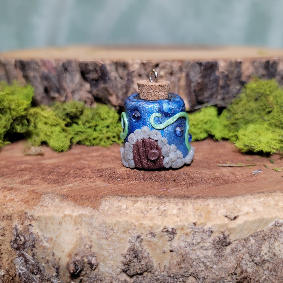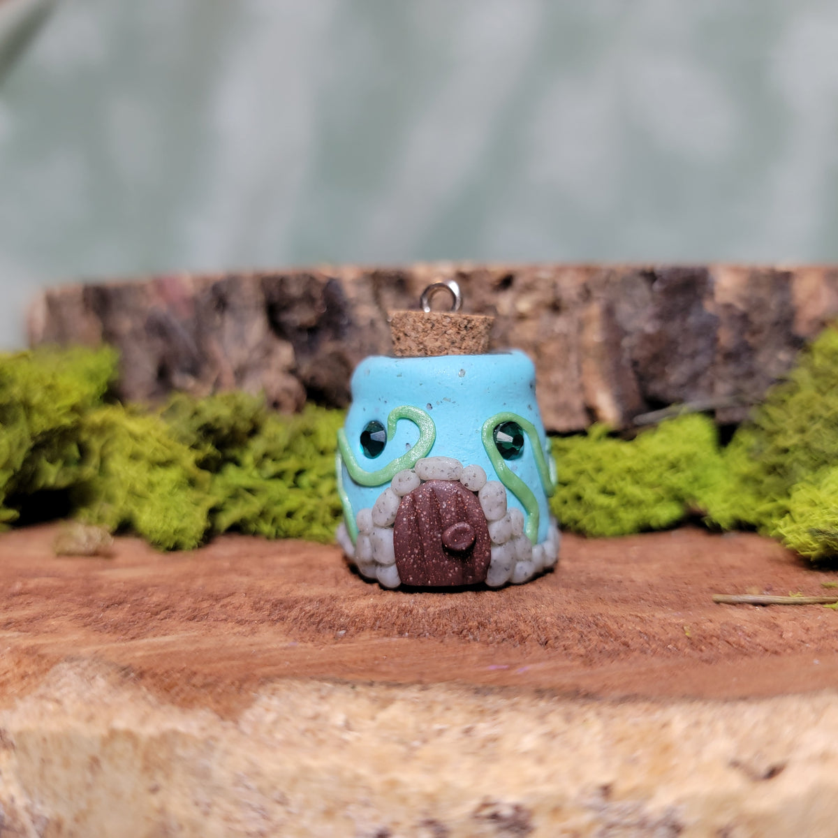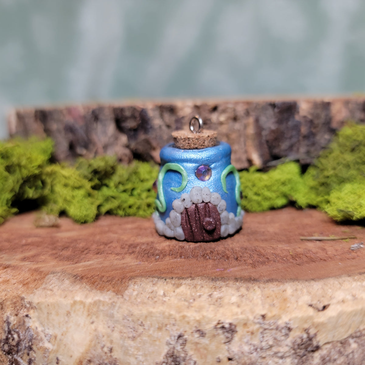 Tiny polymer clay fairy houses built around glass jars with cork tops! Each house has vines swirling around it, and rhinestones set into the walls. The doors are surrounded by stone (also clay). Each fairy house is one of a kind. Select your favorite!