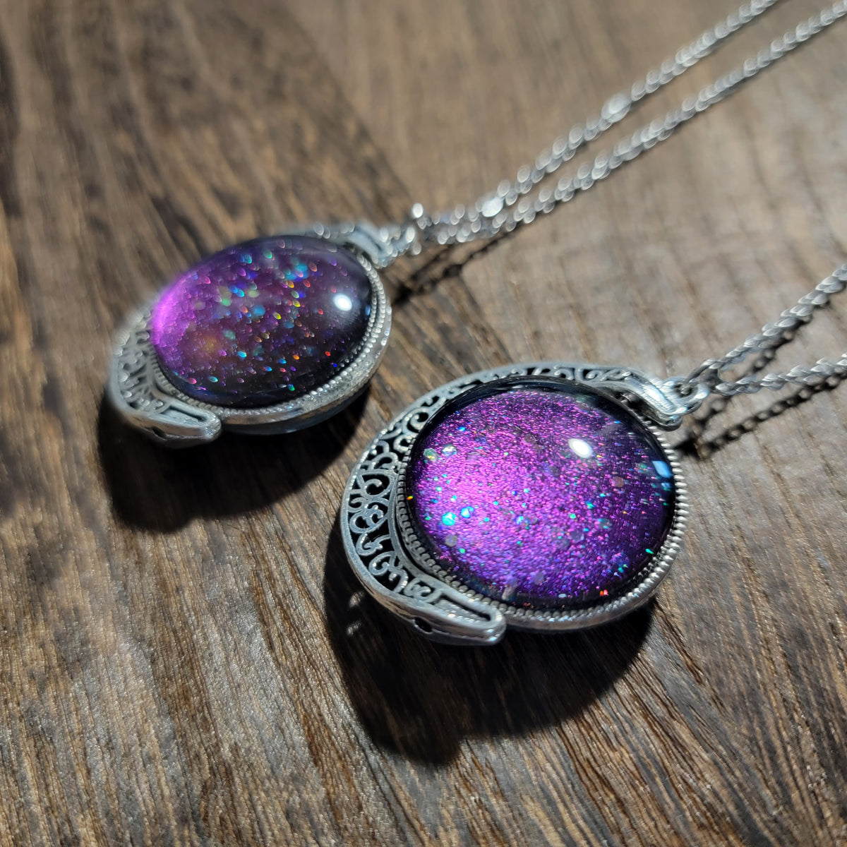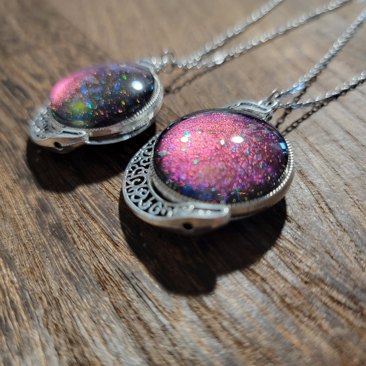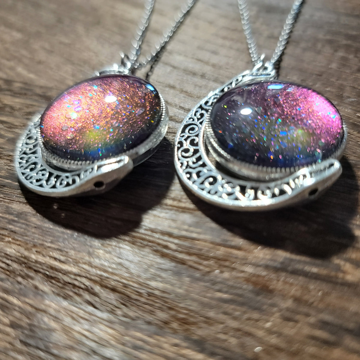 A crescent moon setting with two hand-painted glass cabochons that are layered with glitter an a magical iridescent paint. These spinners hit a range of colors - they look blue or purple most often, but in various lights also read as black, pink, and other colors as well. See photos below - they're all taken of the same two pendants in the same positions.