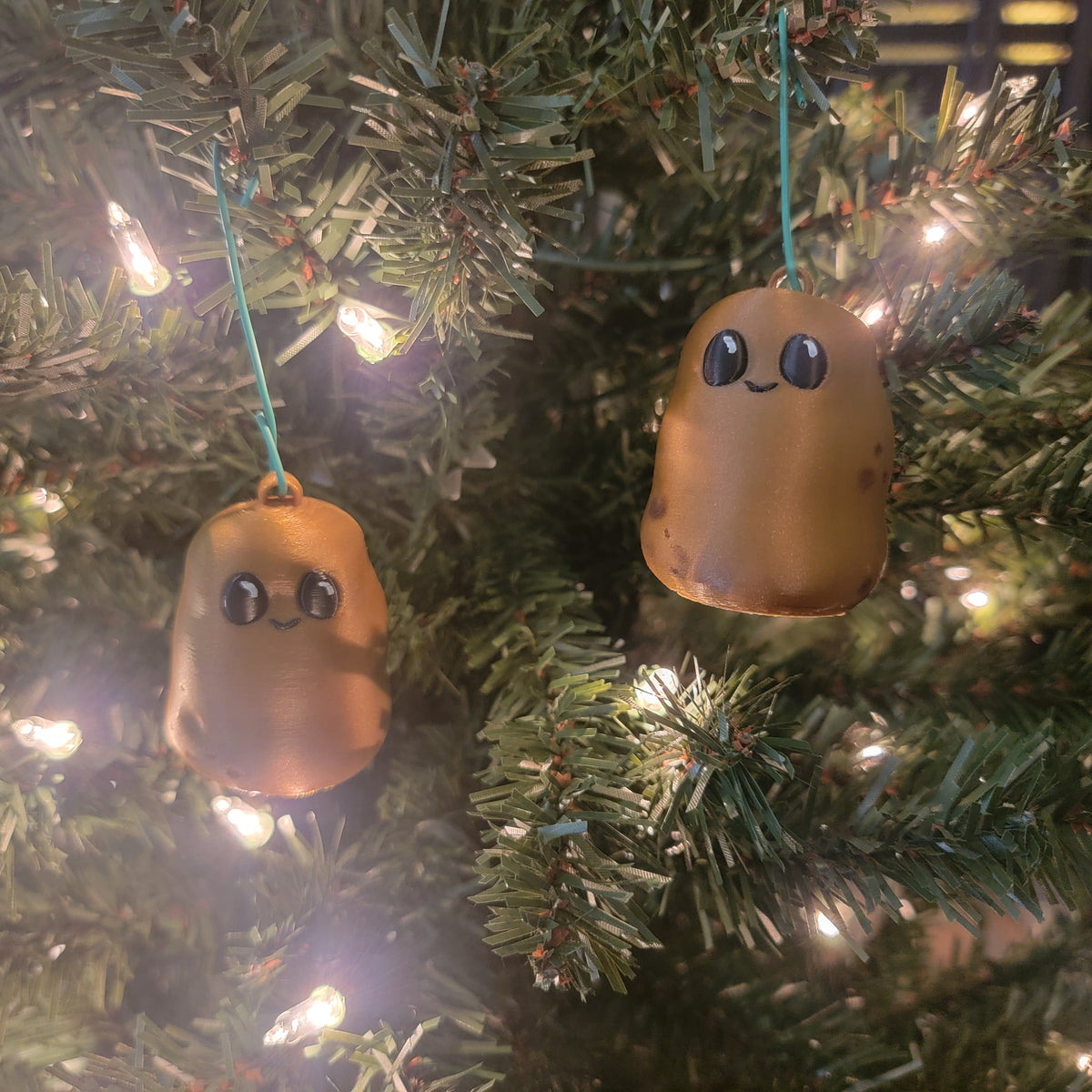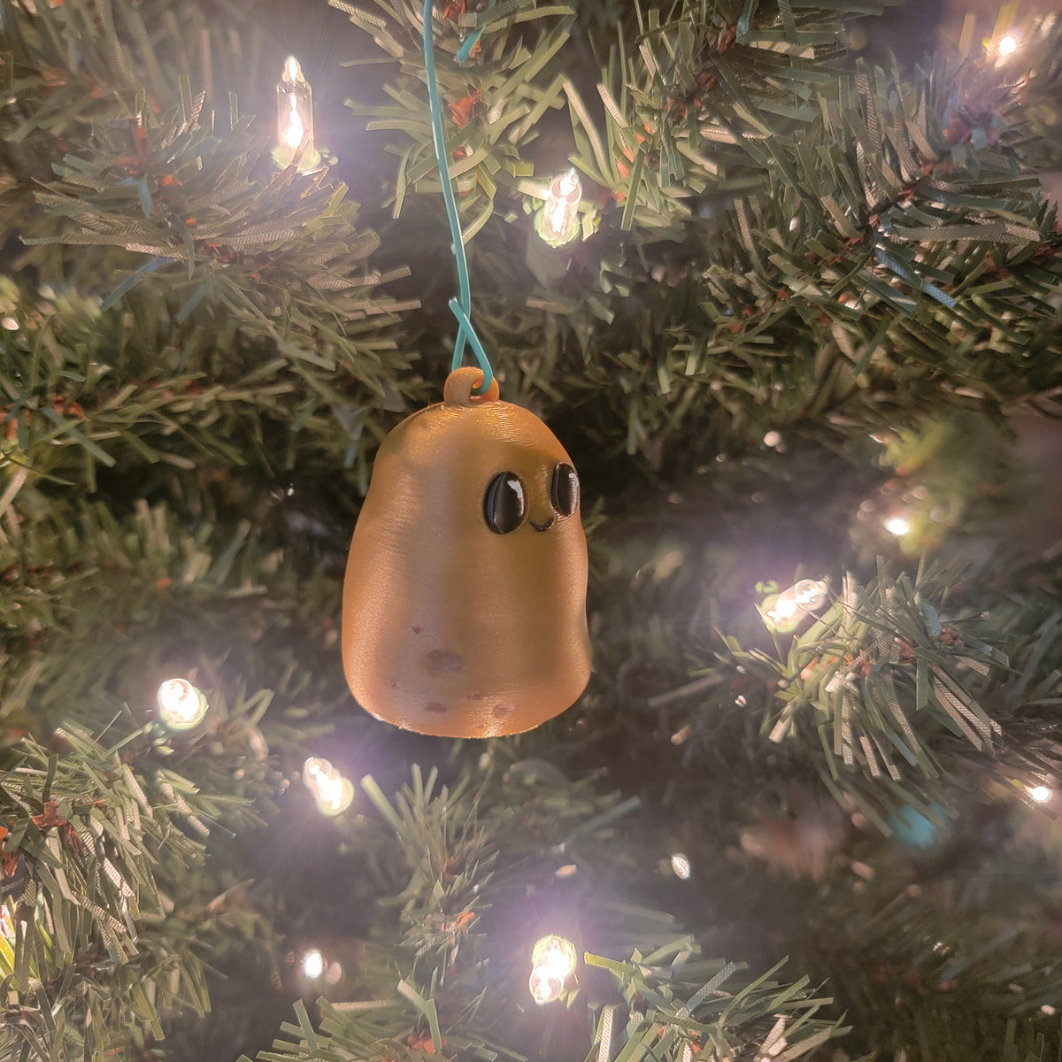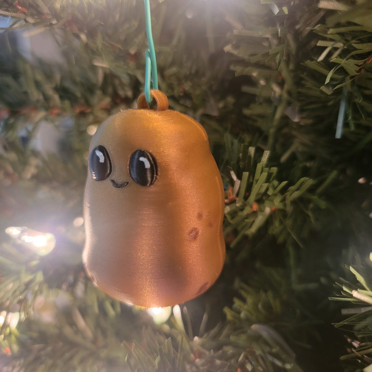 3D printed with PLA, the potato is about 2.2 inches (56mm) tall including loop, and comes with an ornament hook.