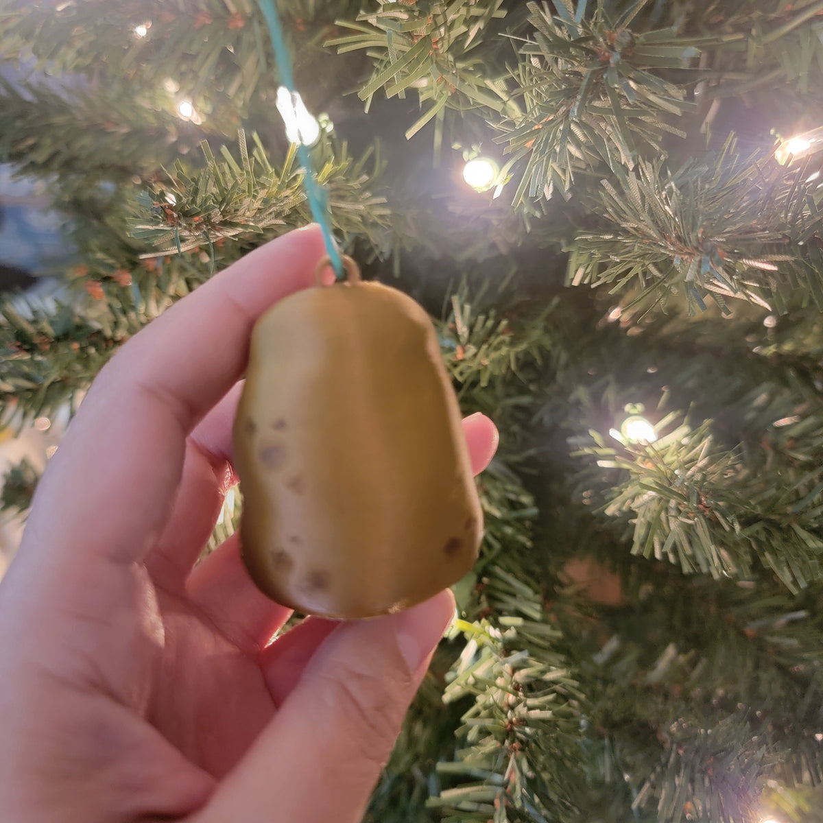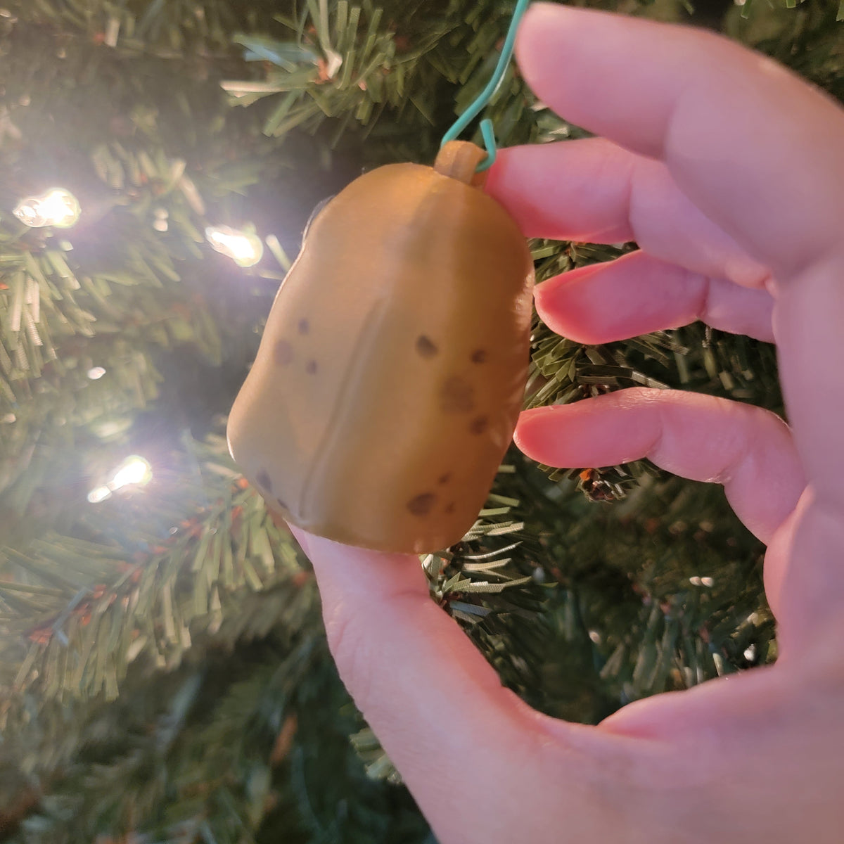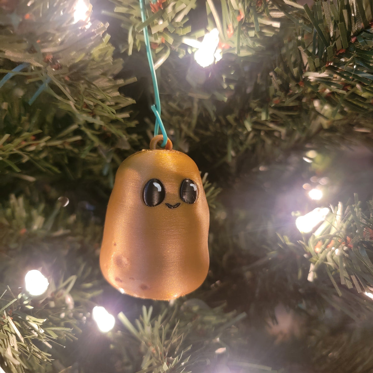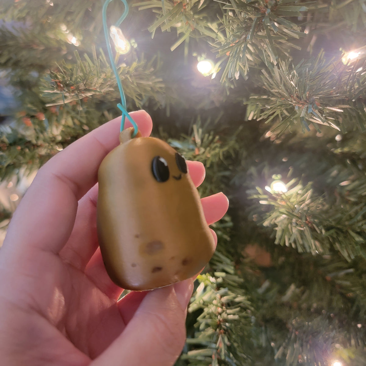3D printed with PLA, the potato is about 2.2 inches (56mm) tall including loop, and comes with an ornament hook.