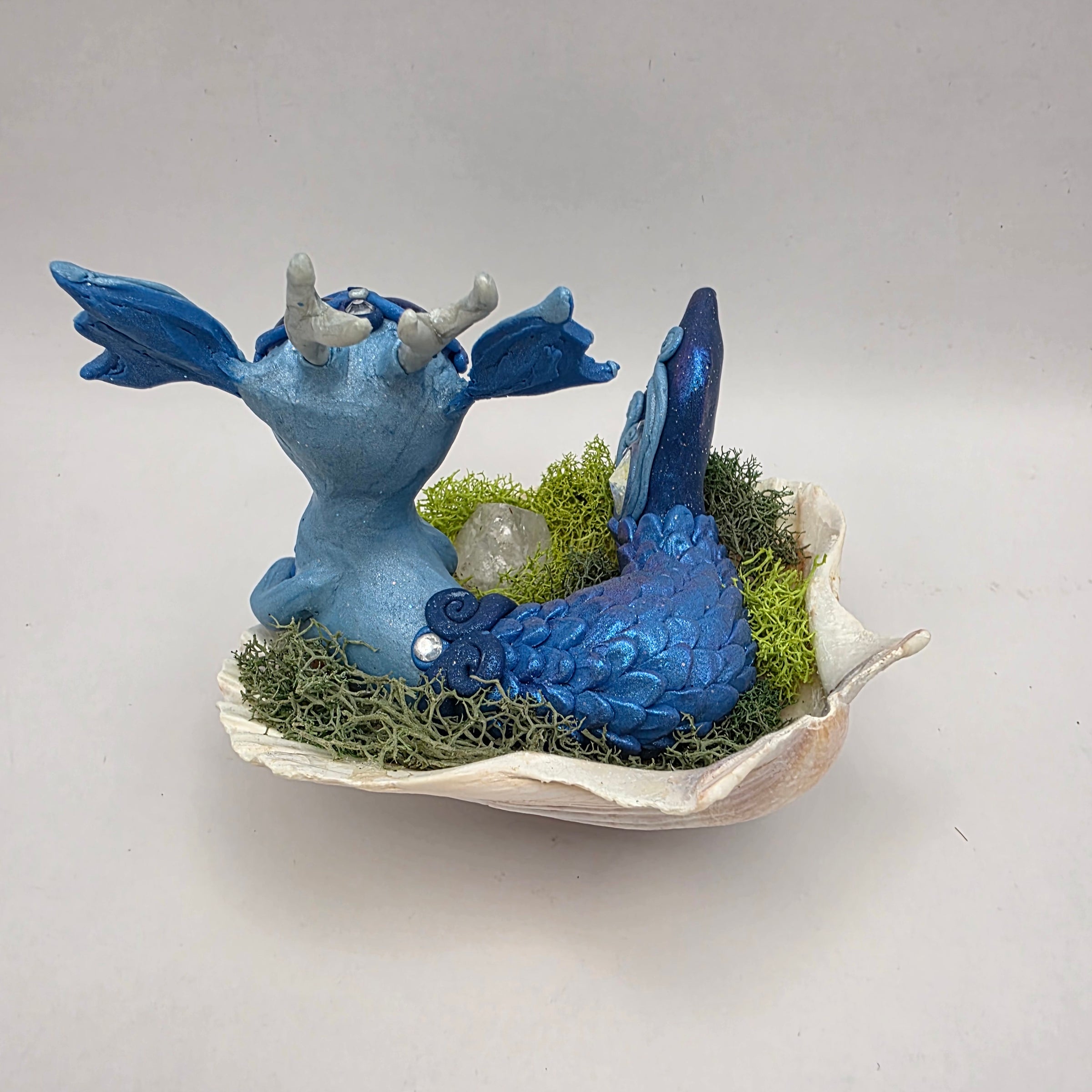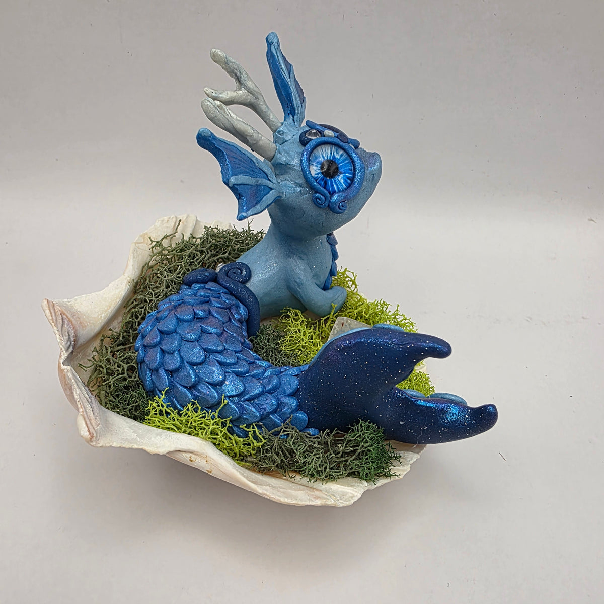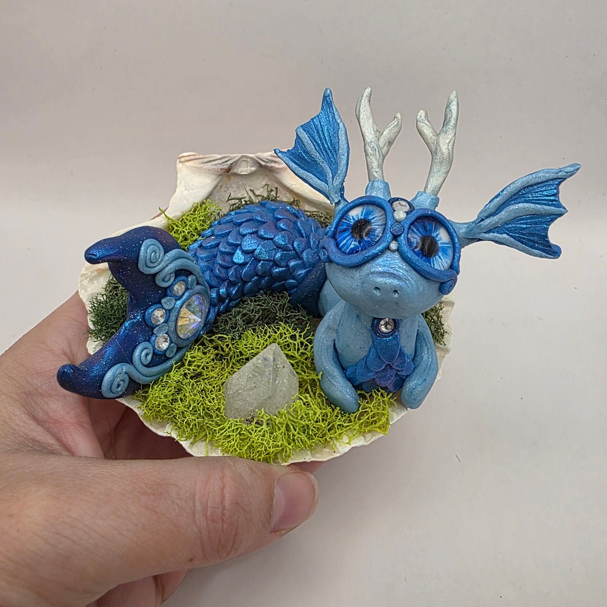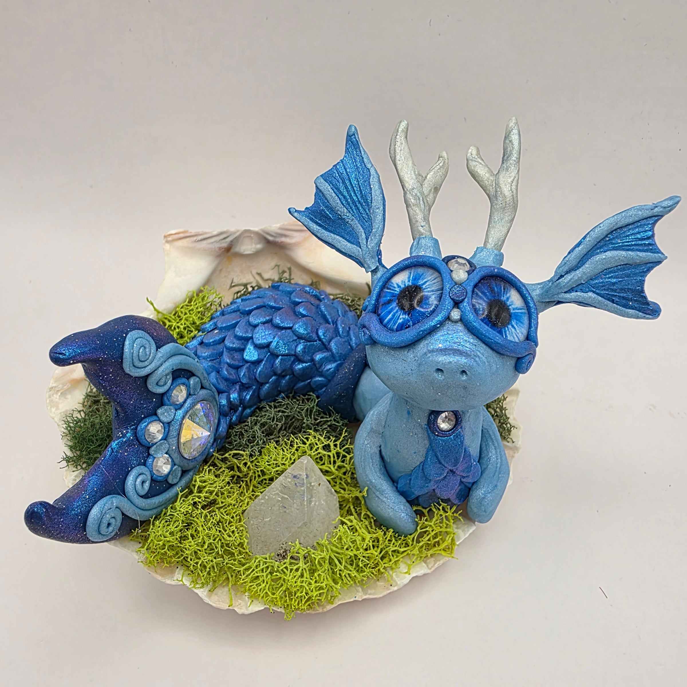 A magical sea creature resting in a large scallop shell.  Naia was created with many shades of blue polymer clay, accented with swirls, rhinestones, prestige crystal, and glass eyes.  They are surrounded by green moss and crystals.  It has delicate antlers and its tail scales are brushed with shimmering powder.