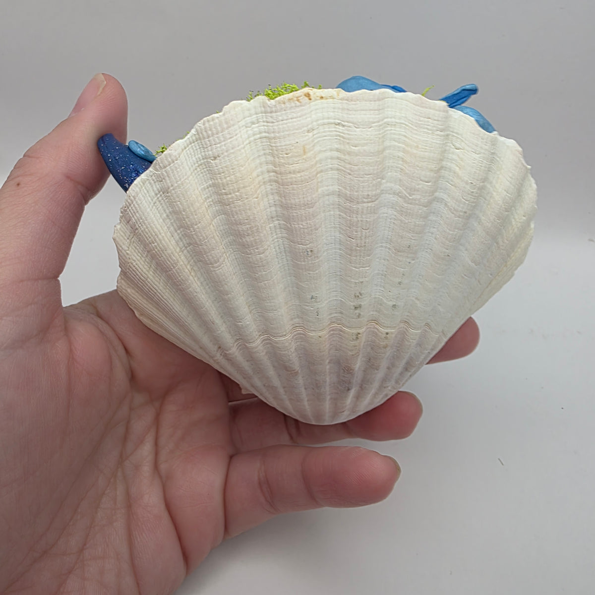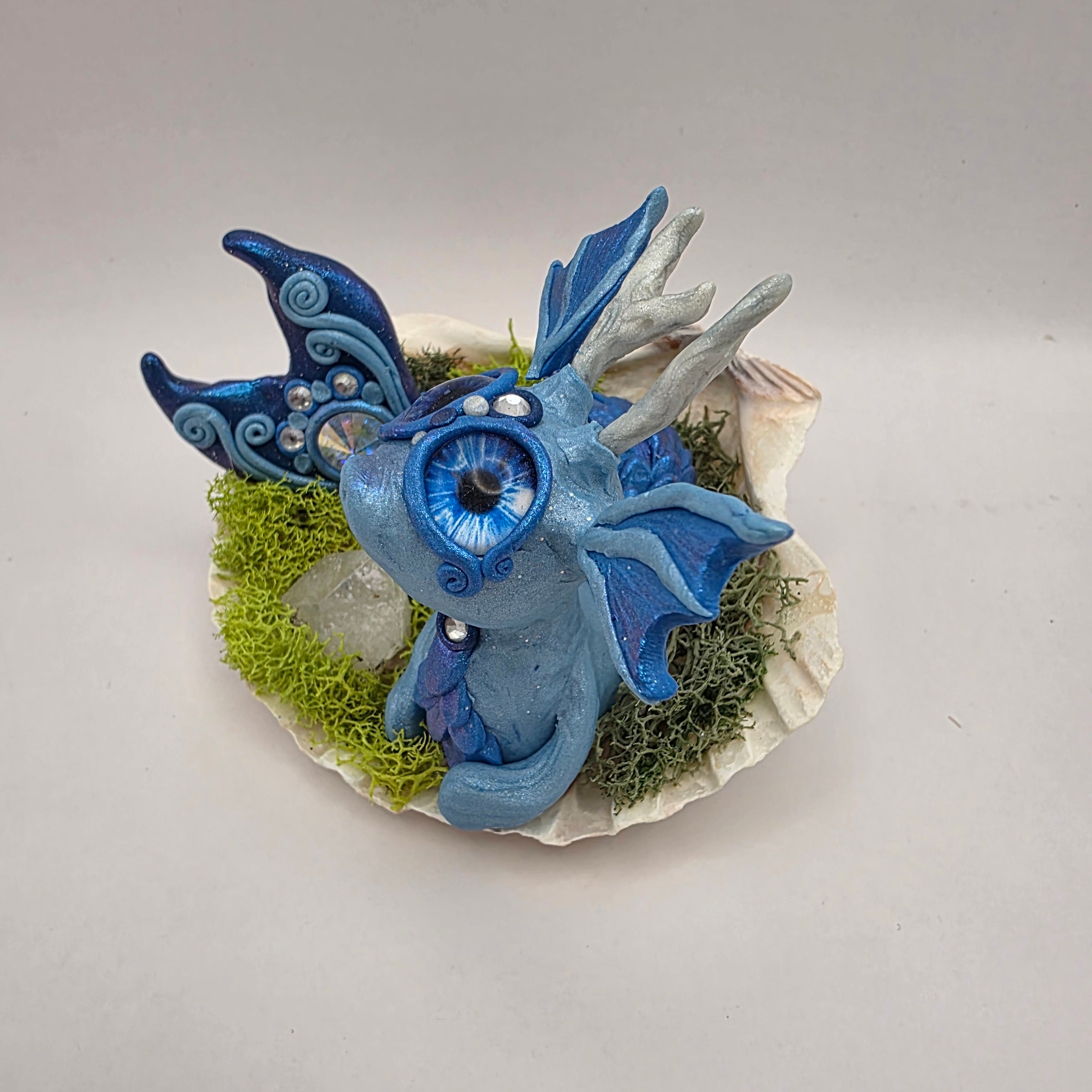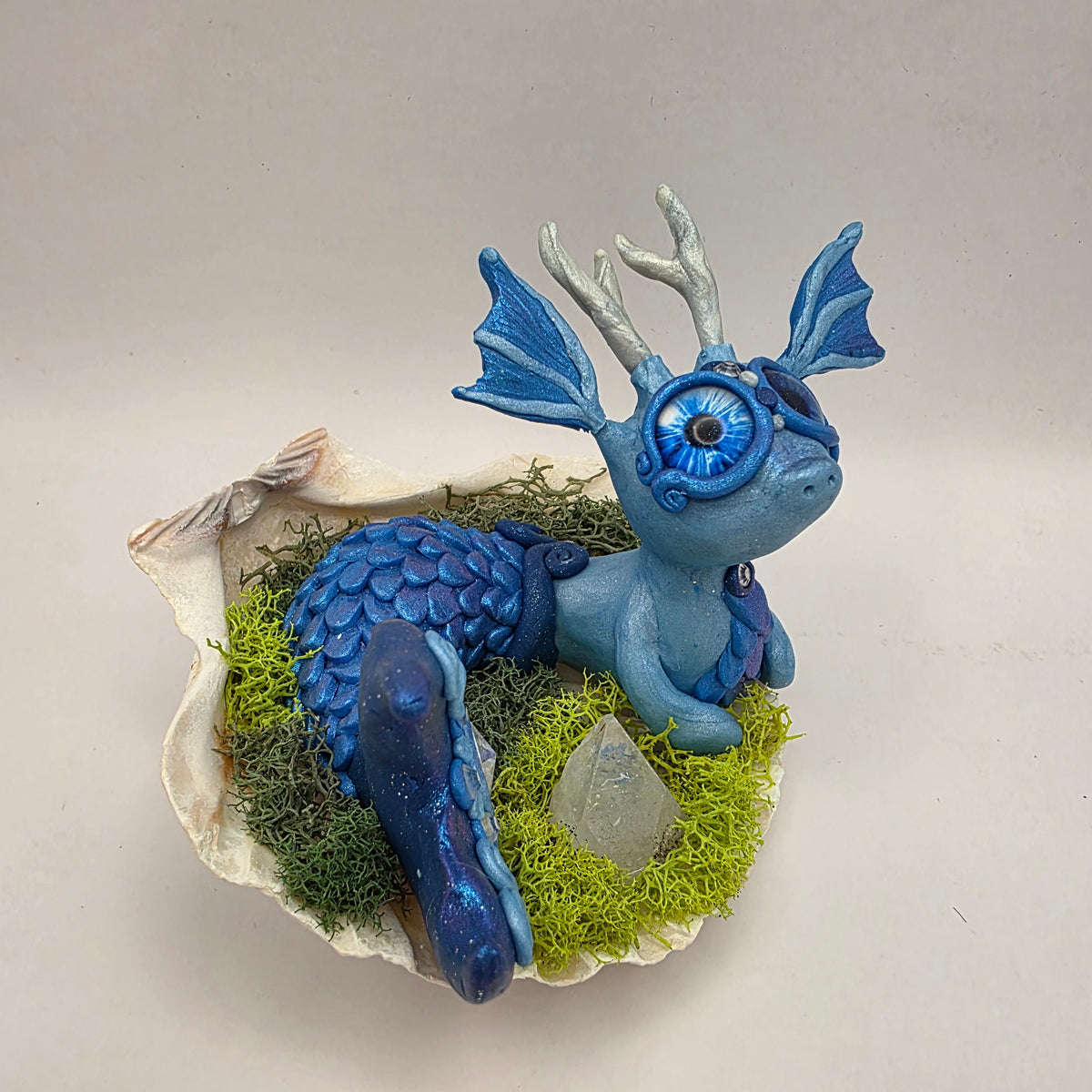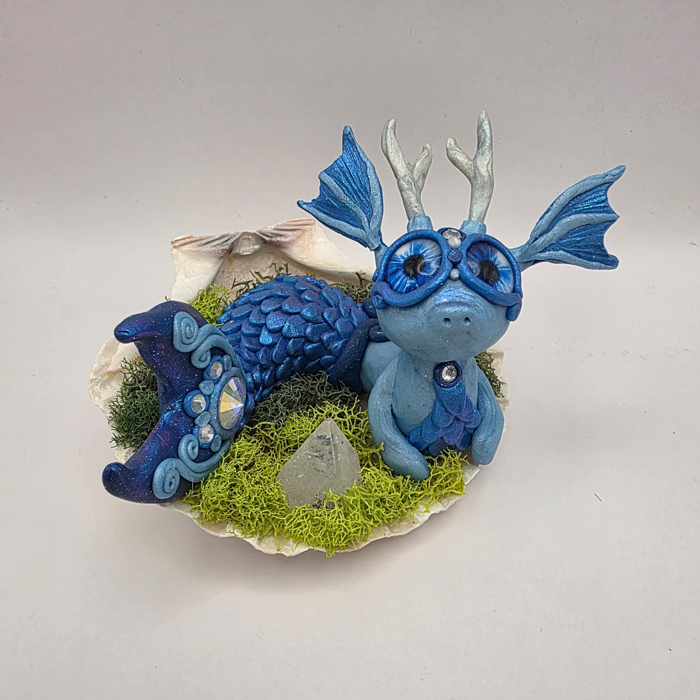 A magical sea creature resting in a large scallop shell.  Naia was created with many shades of blue polymer clay, accented with swirls, rhinestones, prestige crystal, and glass eyes.  They are surrounded by green moss and crystals.  It has delicate antlers and its tail scales are brushed with shimmering powder.