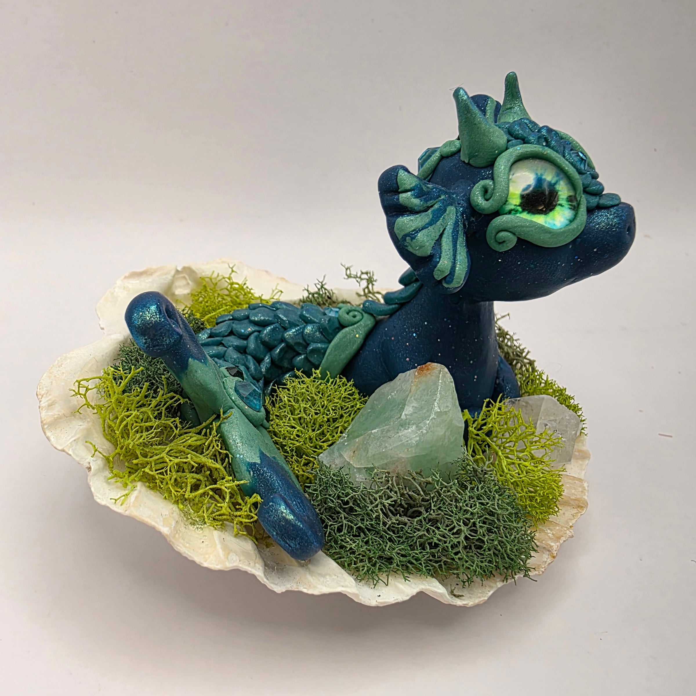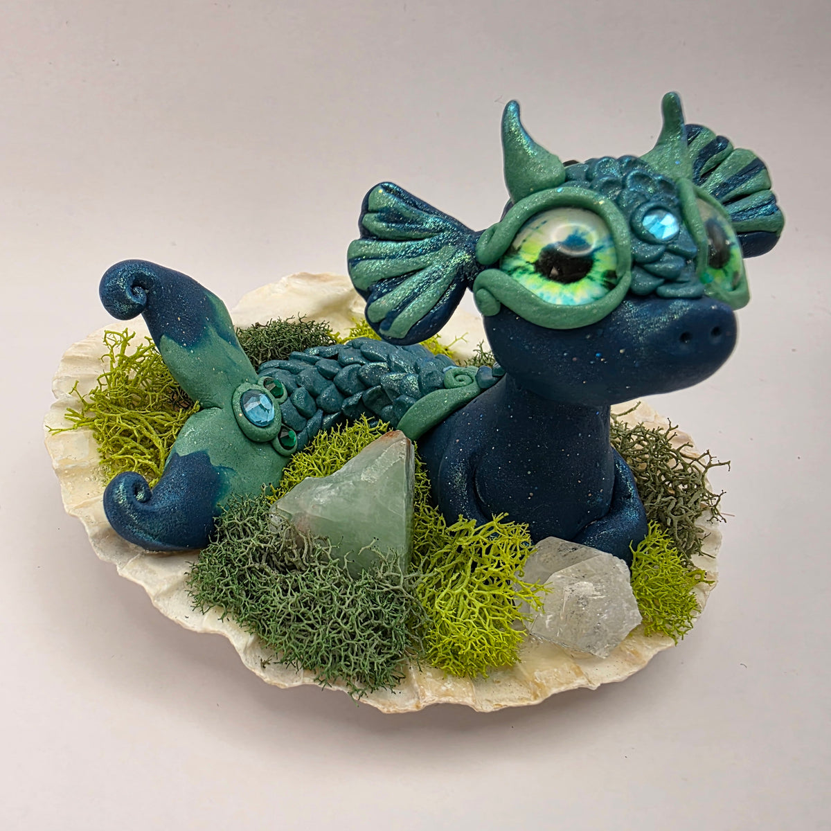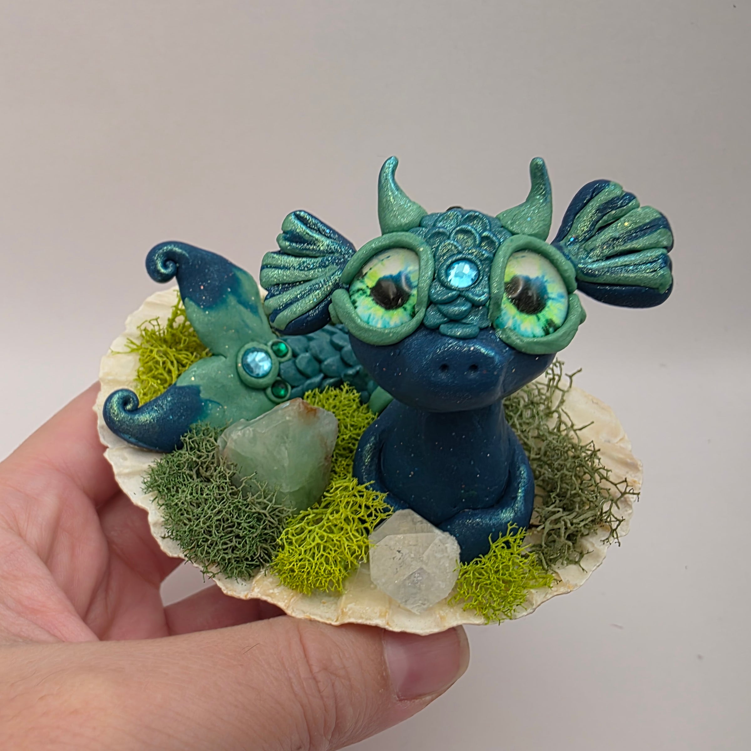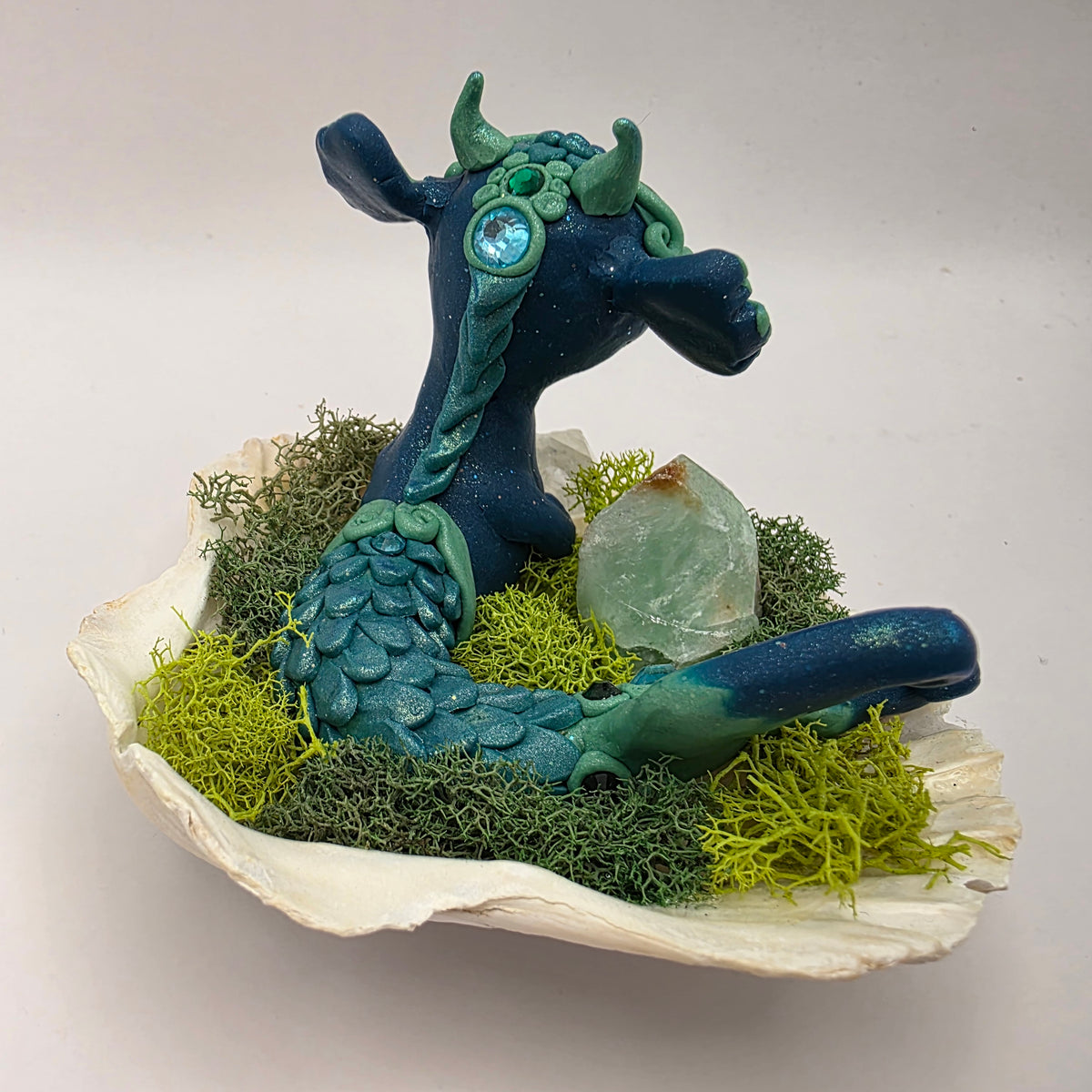A magical sea creature resting in a large scallop shell.  Neptune was created with many shades of green pearl and glitter polymer clay, rhinestones, and glass eyes.  They are surrounded by green moss and crystals.