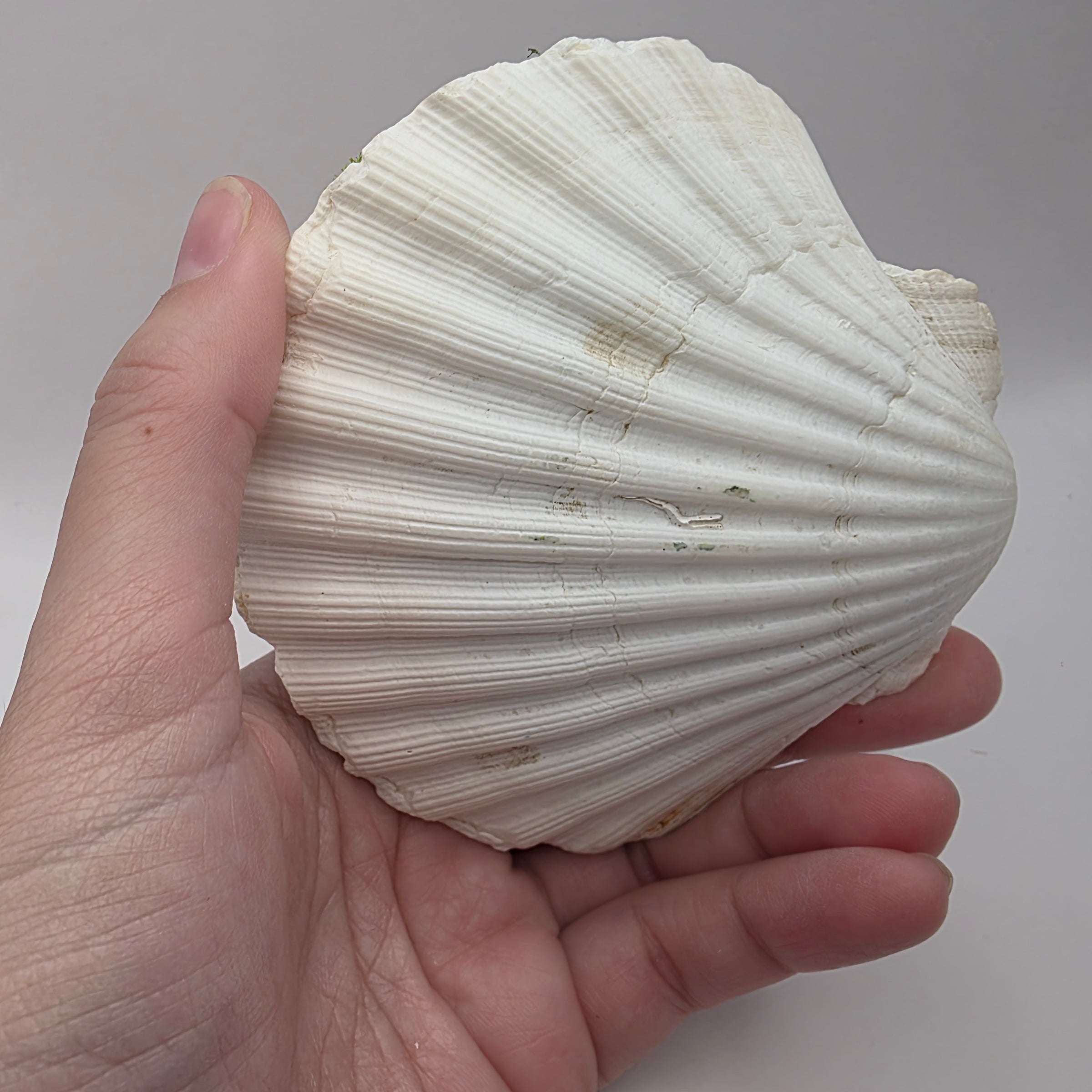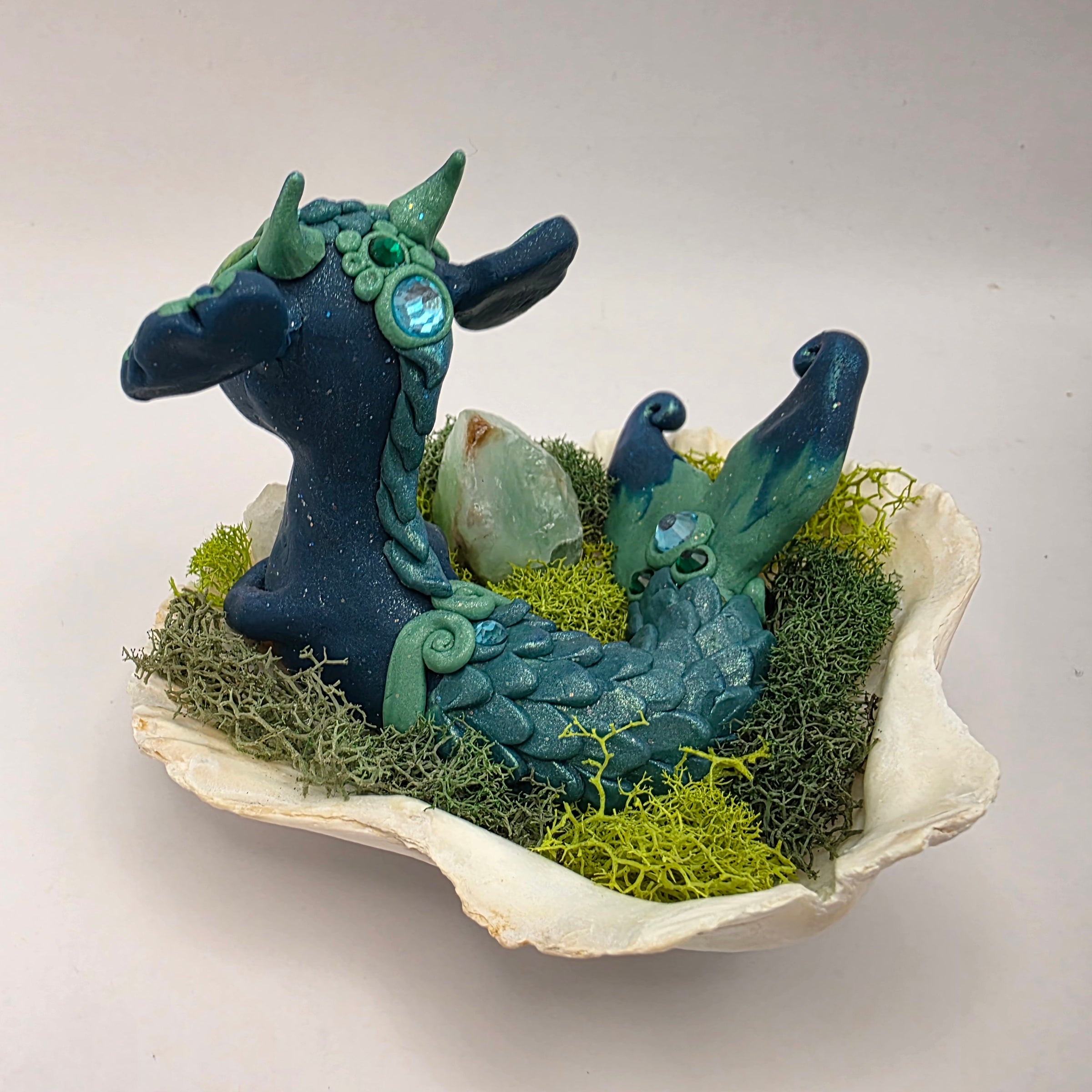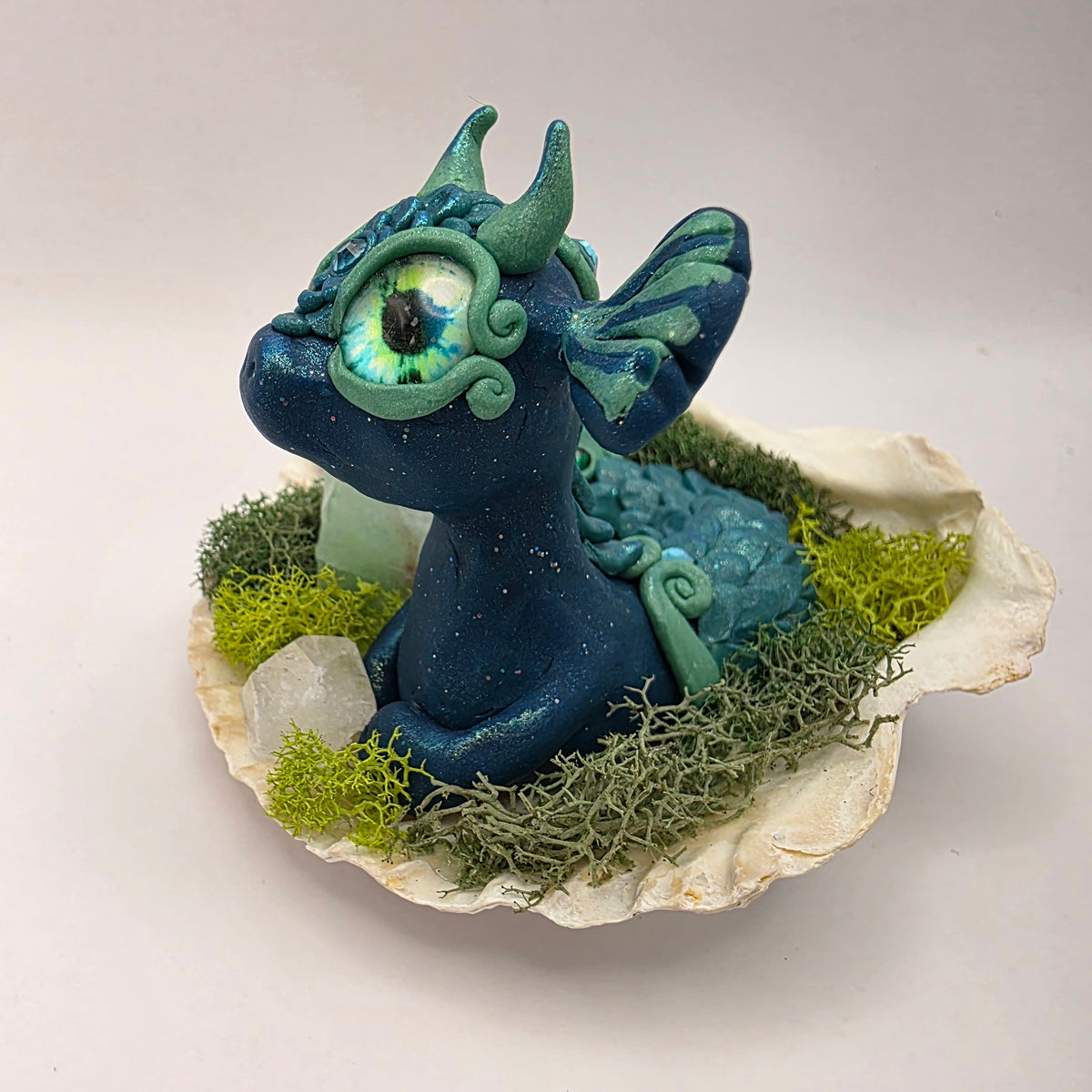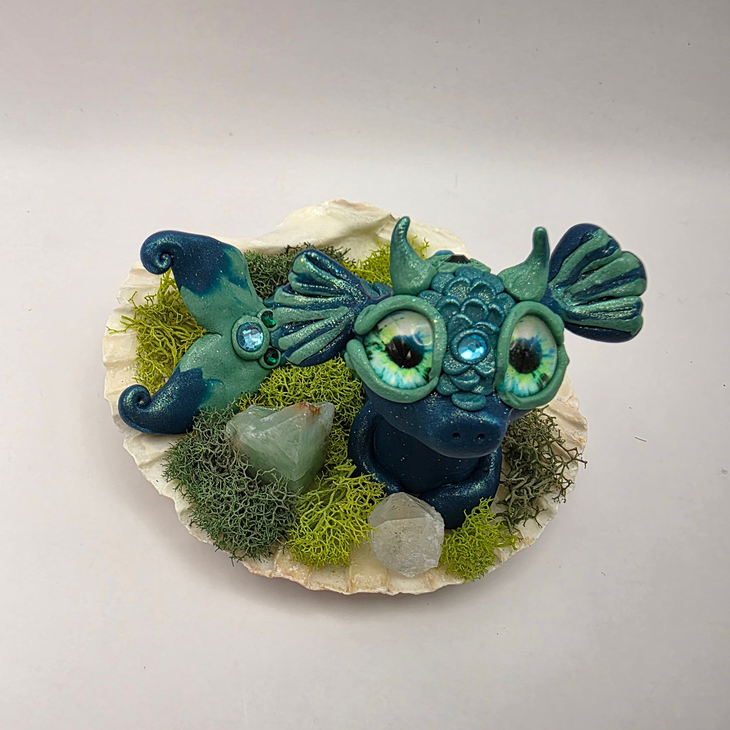 A magical sea creature resting in a large scallop shell.  Neptune was created with many shades of green pearl and glitter polymer clay, rhinestones, and glass eyes.  They are surrounded by green moss and crystals.