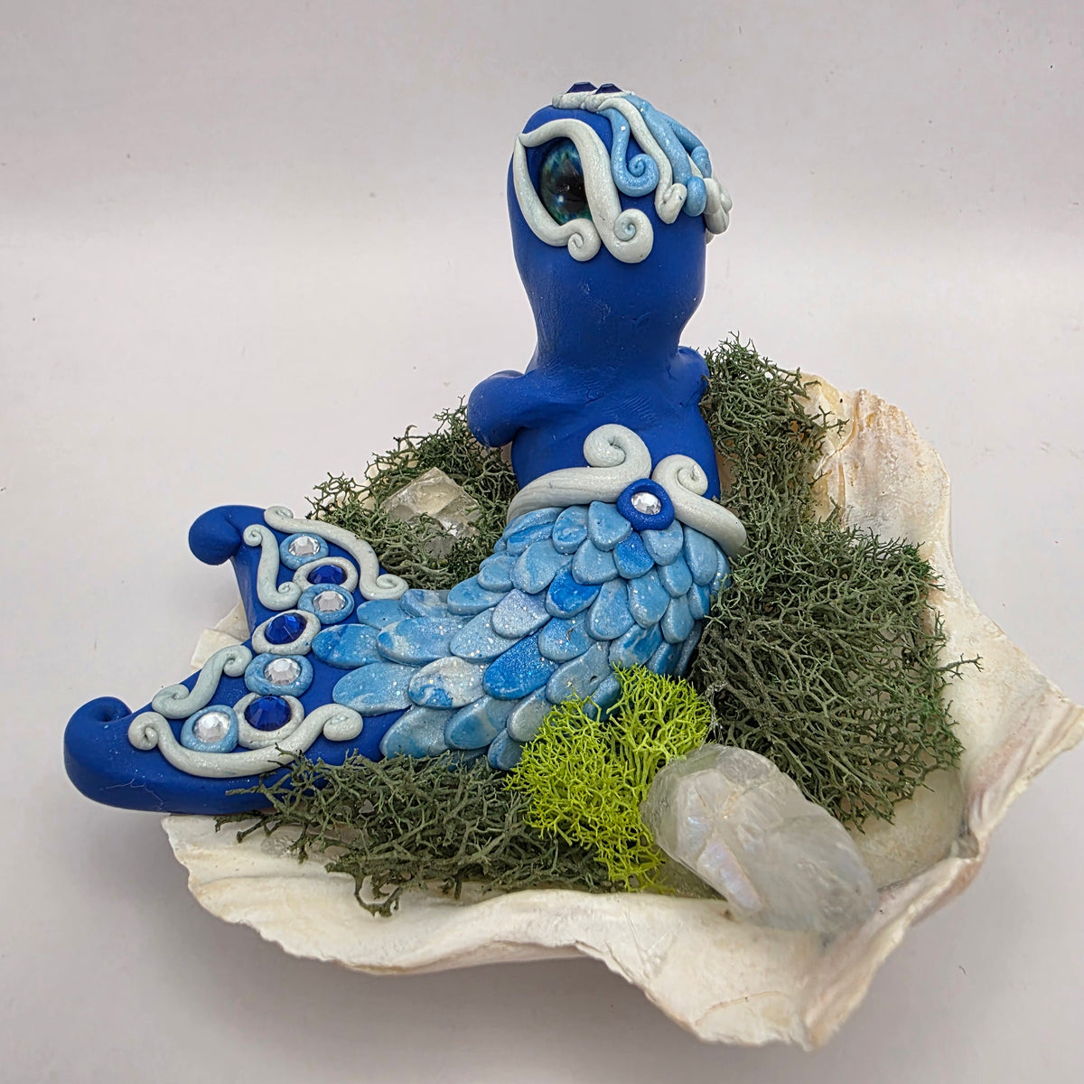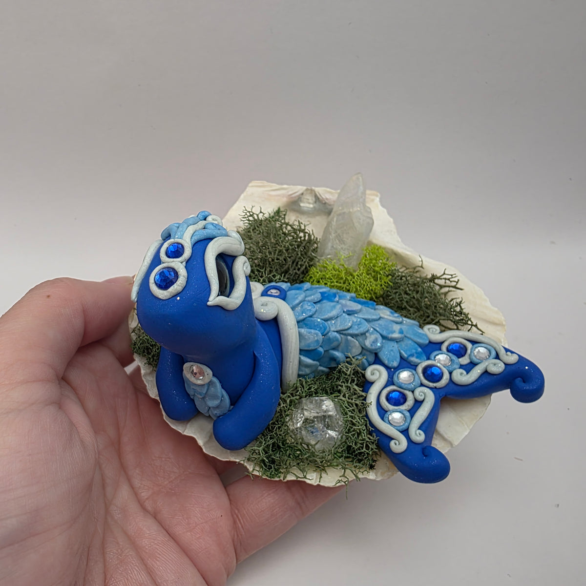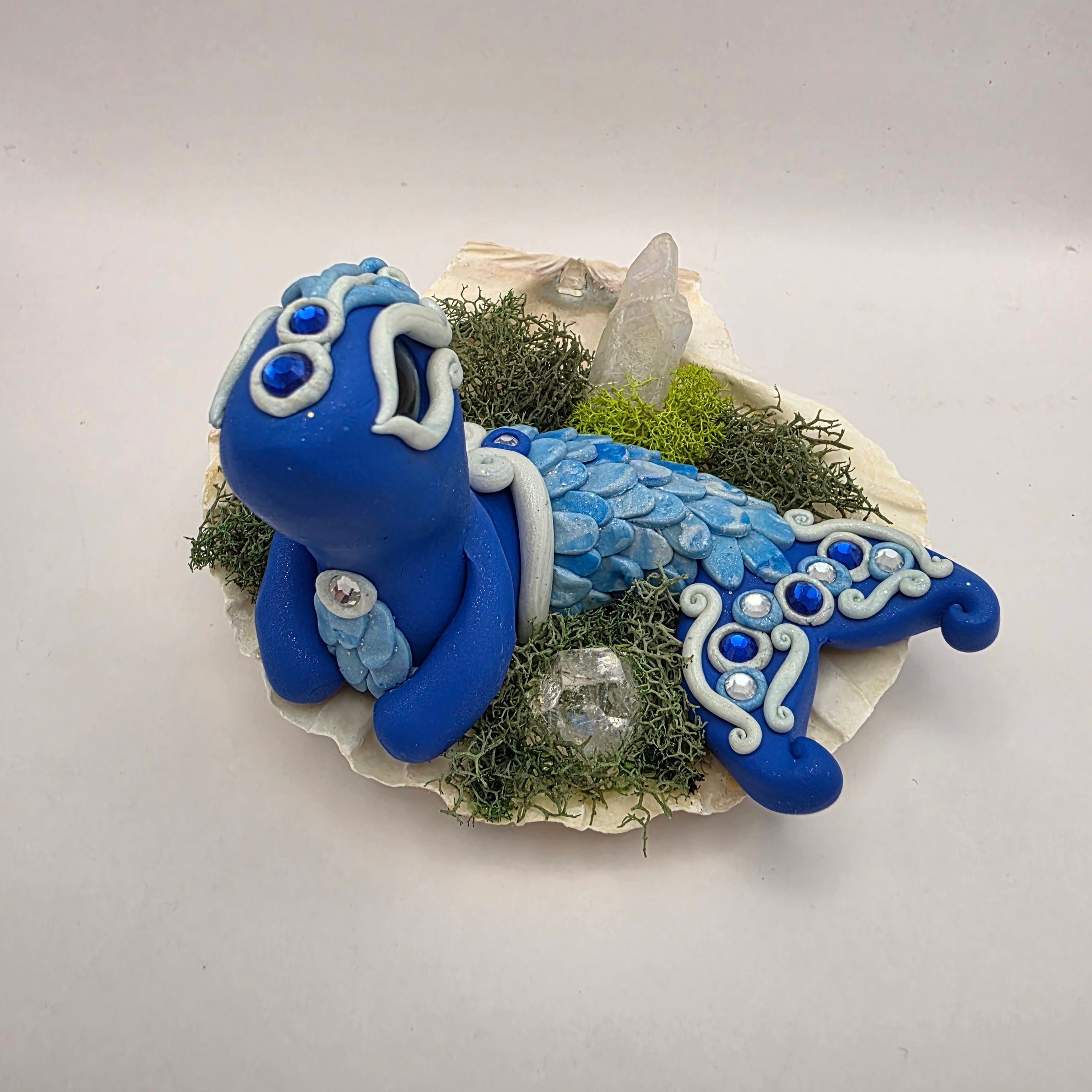 A magical sea creature resting in a large scallop shell. Nessa was created with many shades of blue polymer clay, accented with white swirls, rhinestones, and glass eyes. They are surrounded by green moss and crystals.