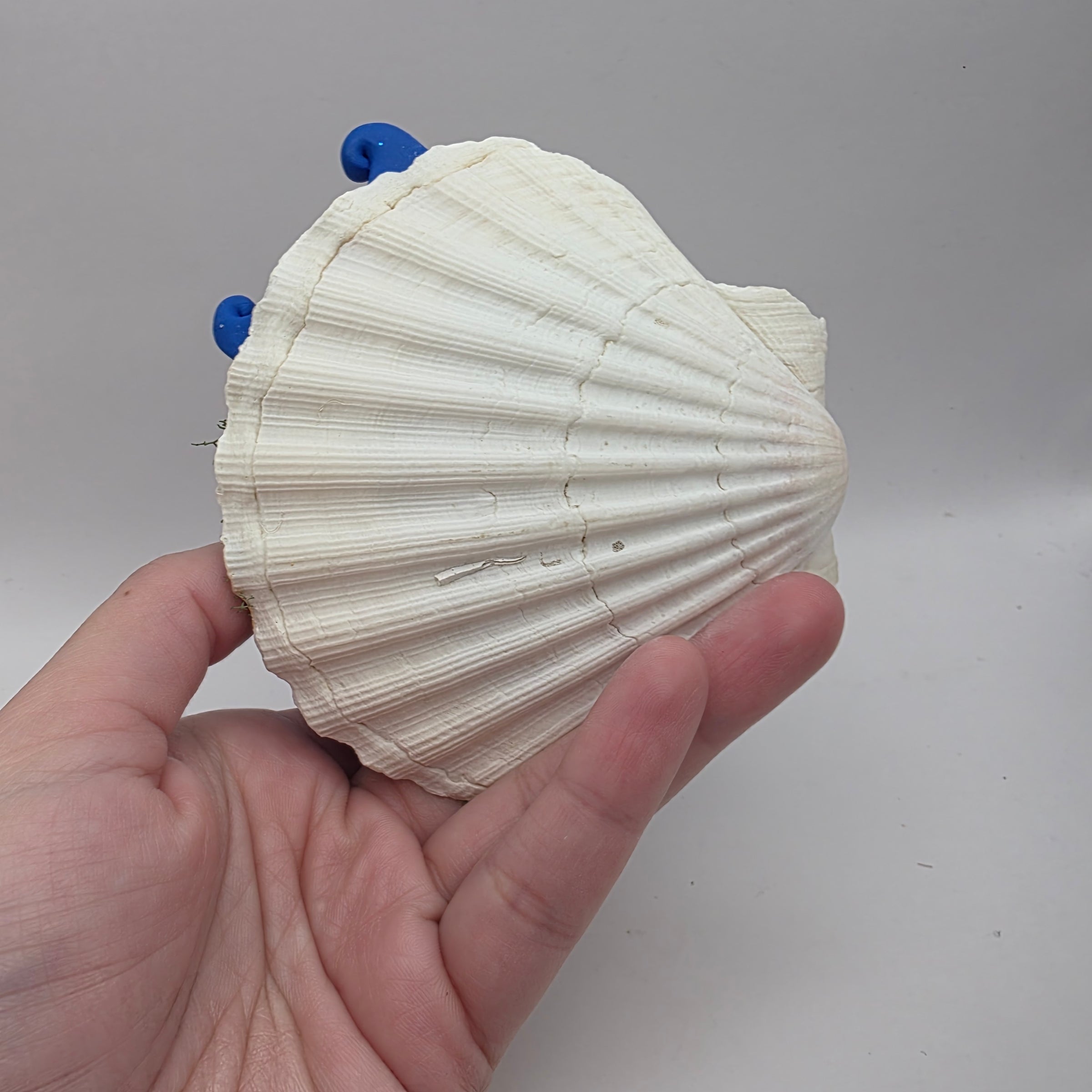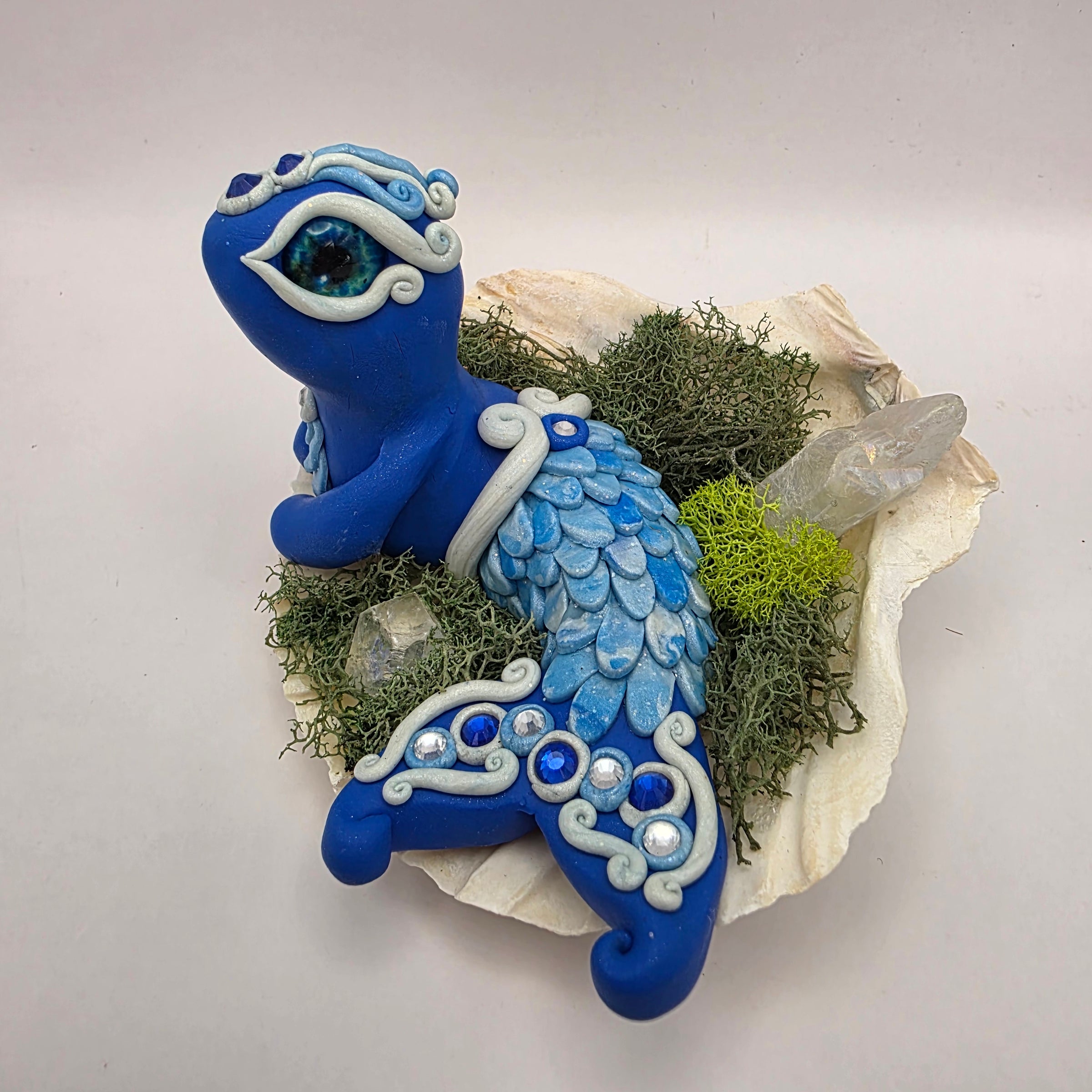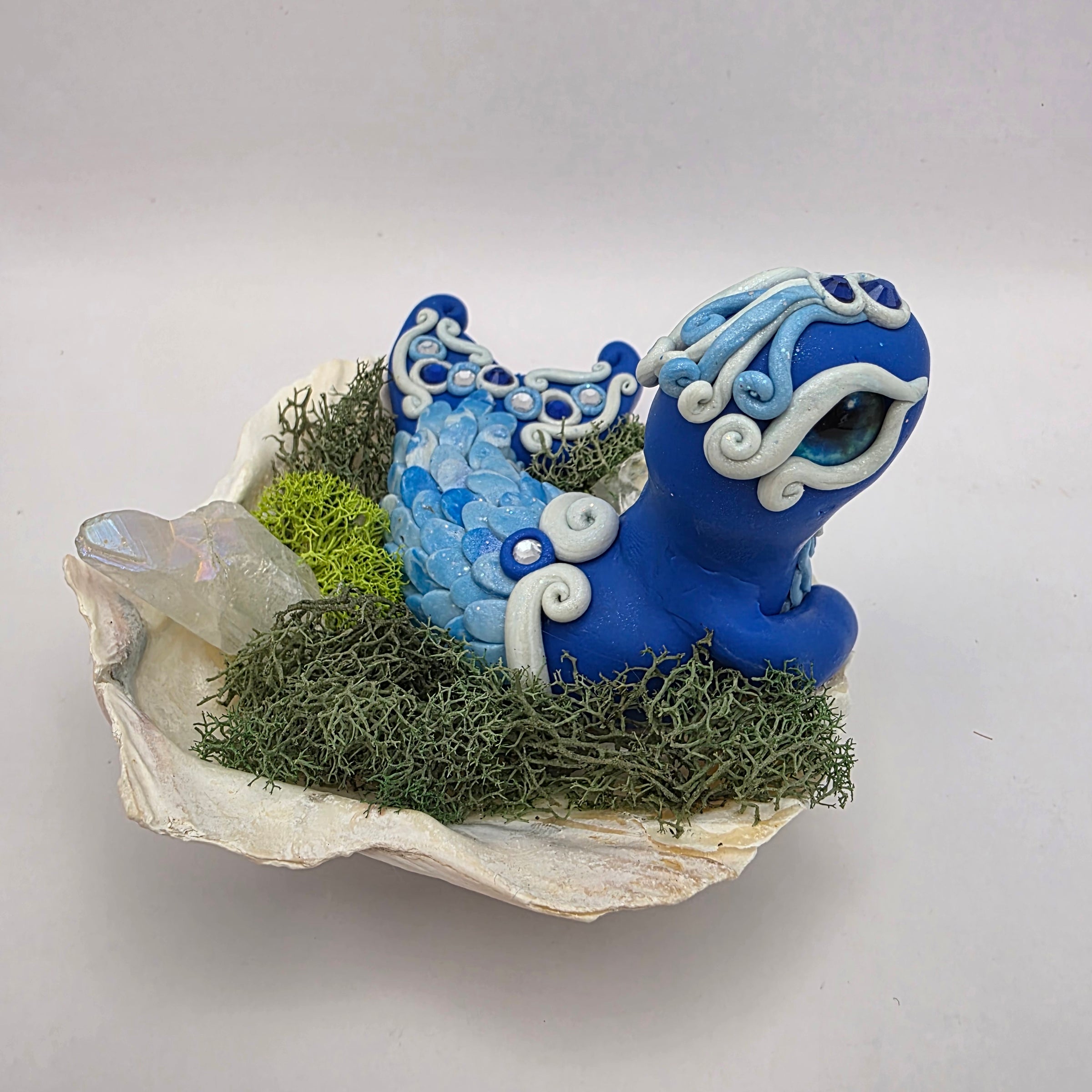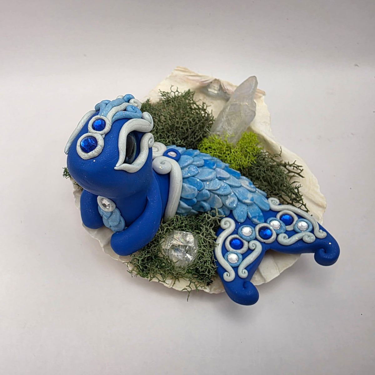 A magical sea creature resting in a large scallop shell. Nessa was created with many shades of blue polymer clay, accented with white swirls, rhinestones, and glass eyes. They are surrounded by green moss and crystals.