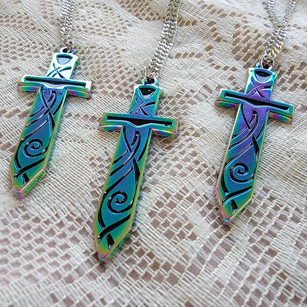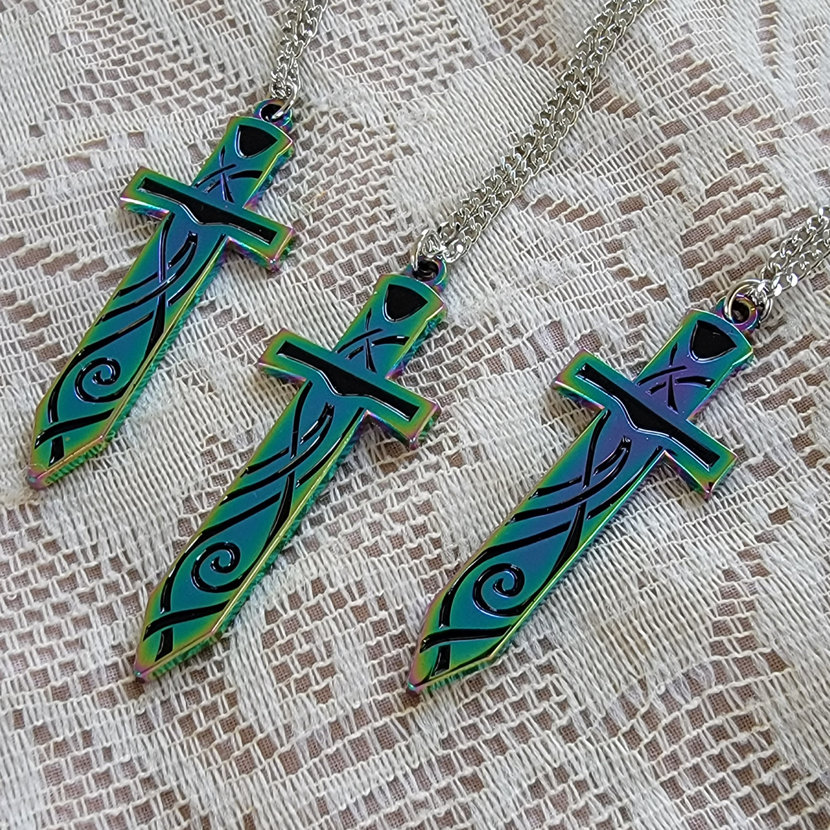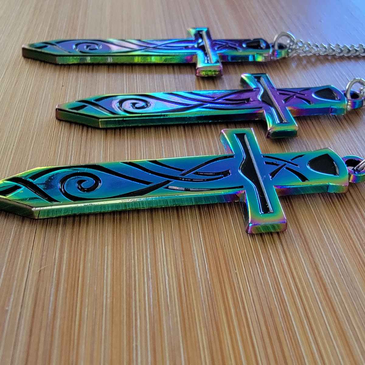 Sword pendants measure 55m long and are rainbow plated with an enamel design.  Choose from a 20 inch silver chain or a 24 inch black chain.  Pendants and chains are nickel free. Listing is for one pendant and chain.  See more swords and check out rainbow dagger earrings.