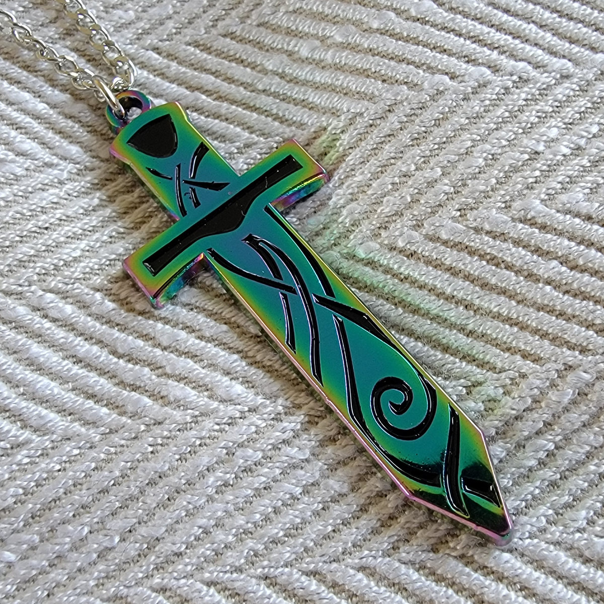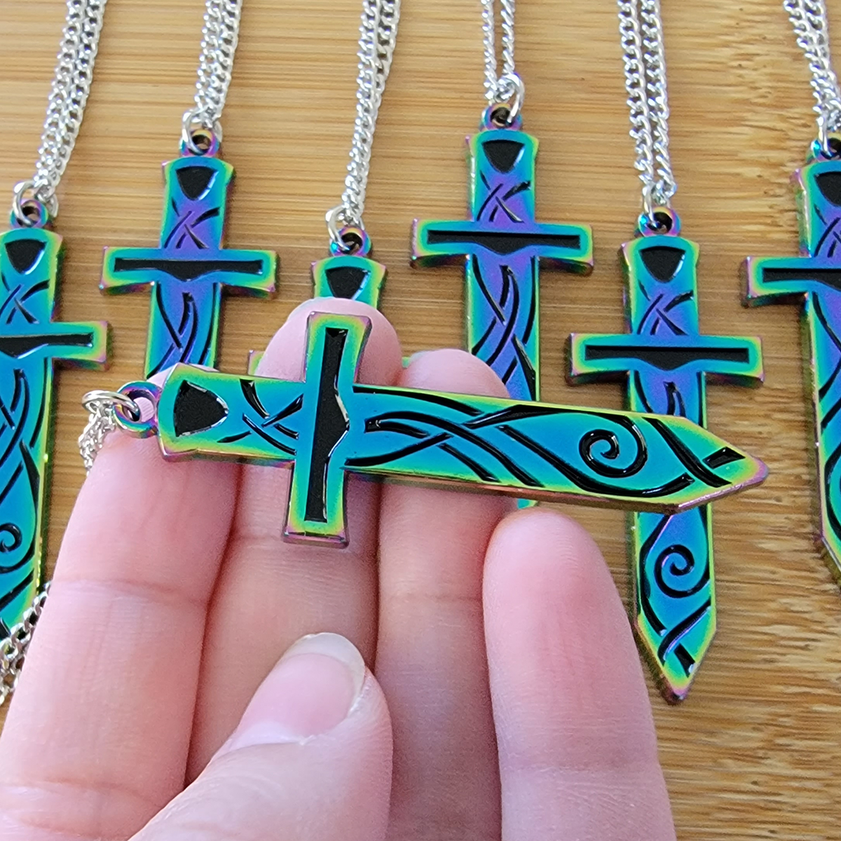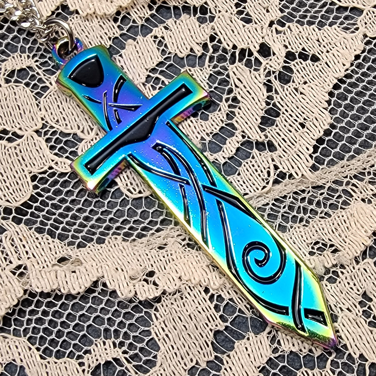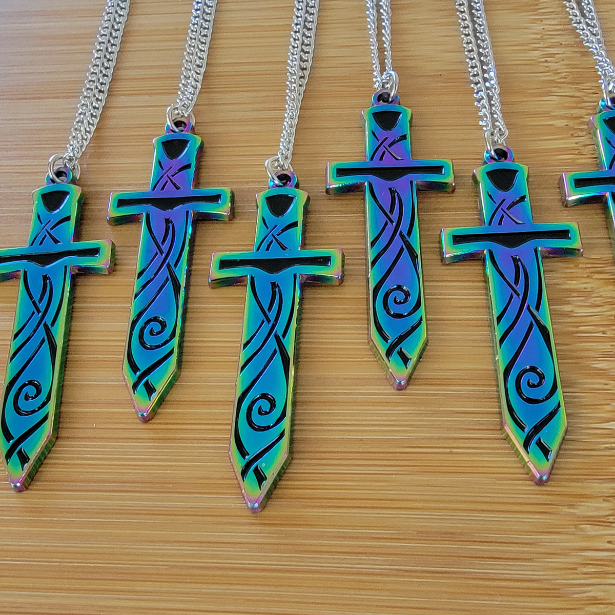 Sword pendants measure 55m long and are rainbow plated with an enamel design.  Choose from a 20 inch silver chain or a 24 inch black chain.  Pendants and chains are nickel free. Listing is for one pendant and chain.  See more swords and check out rainbow dagger earrings.