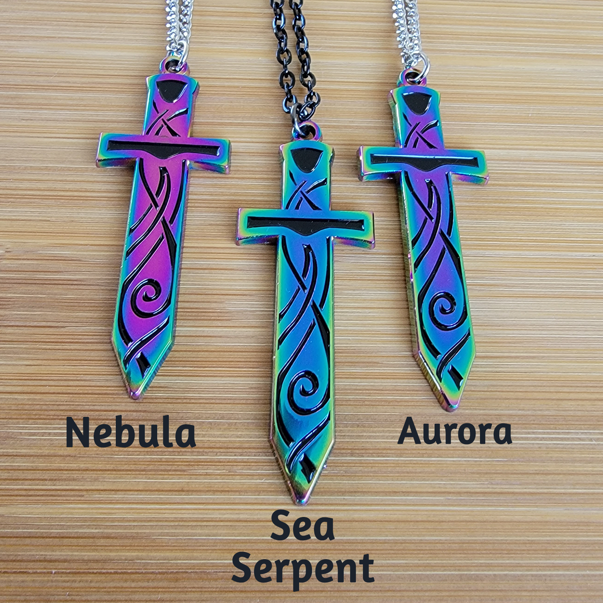 Because of the rainbow plating, each pendant is unique.  The color groups contain some variation, and they change colors depending on the angle. The photos featuring three swords on a wood background show the same three pendants from multiple angles. Look at all the photos to get a good sense of what they might look like!