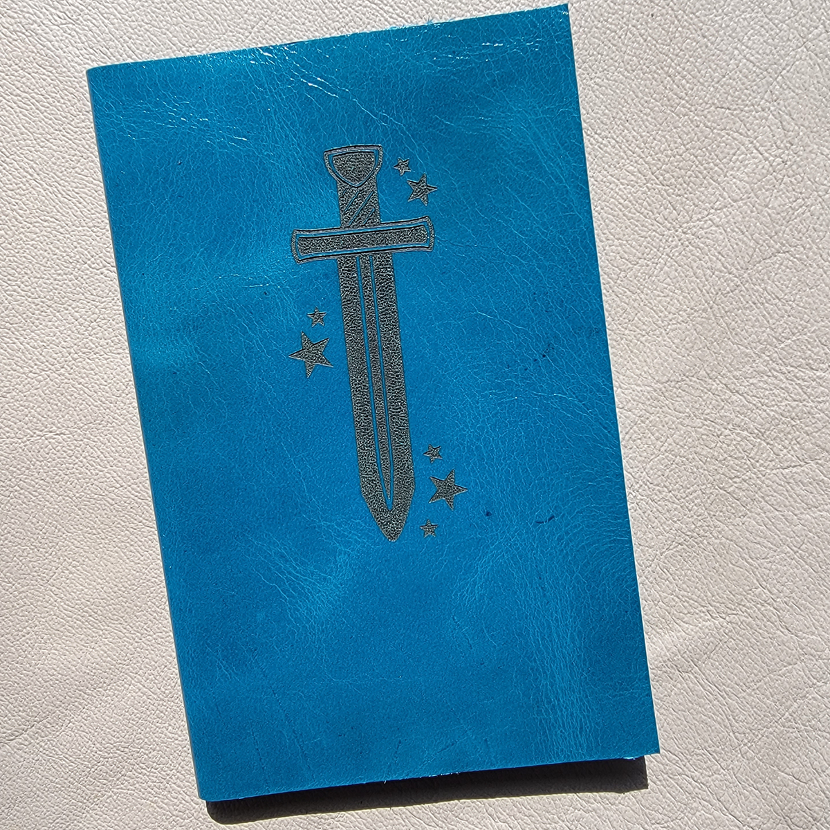 A journal with a sword surrounded by stars. These pocket journals are great for carrying around for stories, ideas, or to write down bits of information.
